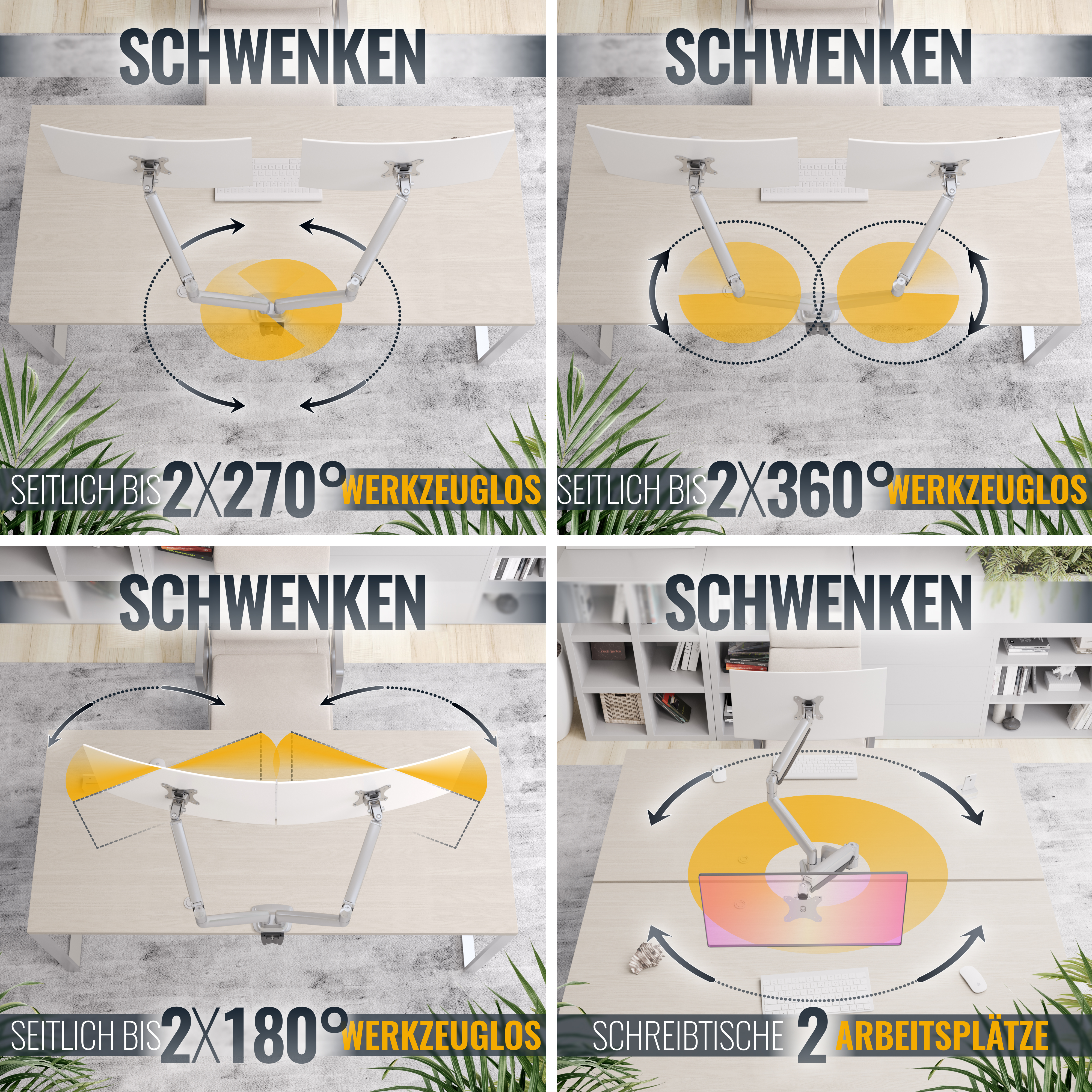 270° schwenkbar an den untersten Gelenken, rundherum an den mittleren sowie bis zu +/-180° an den Aufnahmeplatten, - in die Horizontalen je nach Bildschirm-Breiten & Bereichsmontage. Bedarfsweise auf verschiedene Tische & Sitze.