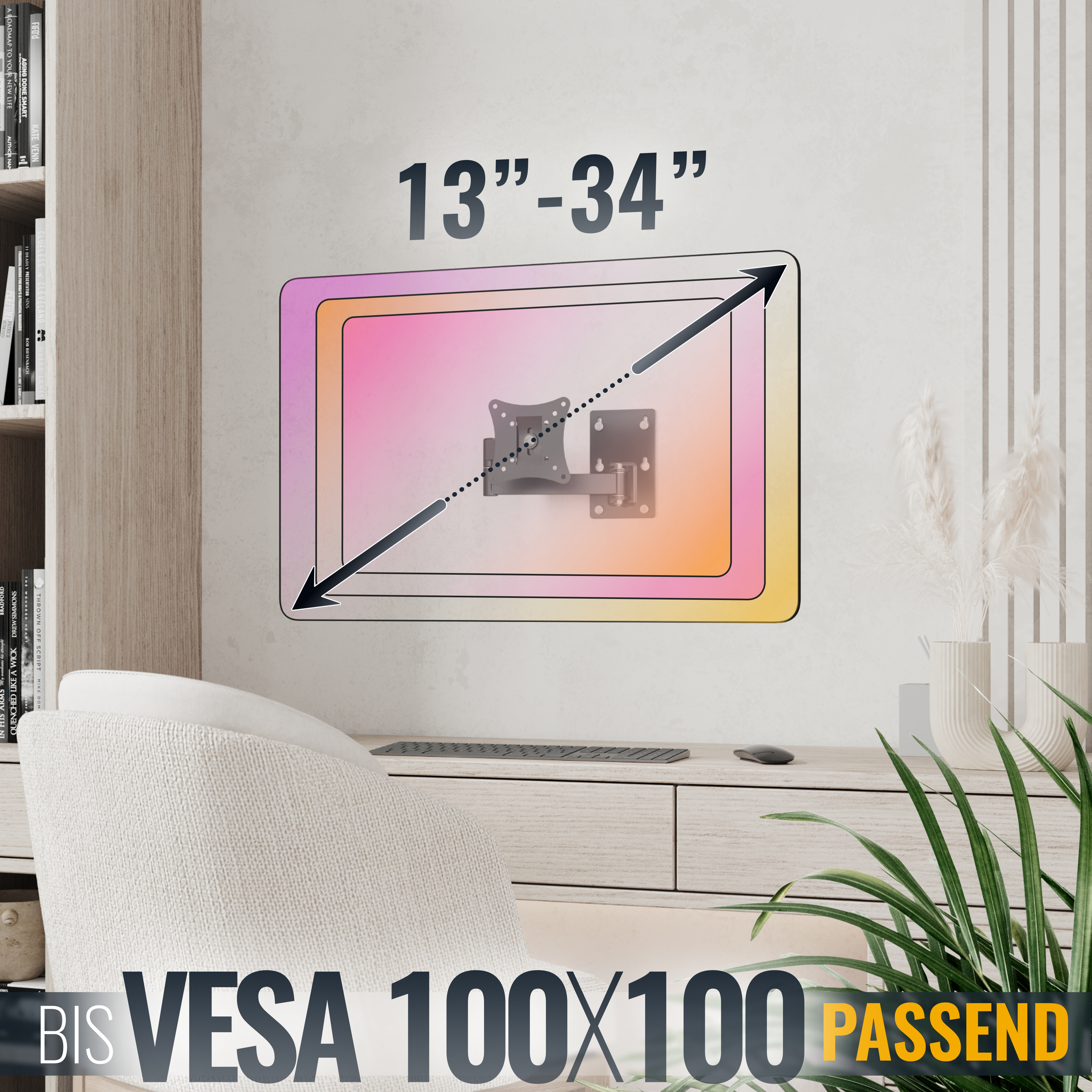 VESA Norm kompatibel stimmt die Distanz der Löcher auf der Bildschirm-Rückseite mit den Maßen 50 x 50mm, 75 x 75mm und 100 x 100mm überein. Dafür sind kleinere bis mittlere Fernseher oder Monitore bestens geeignet.