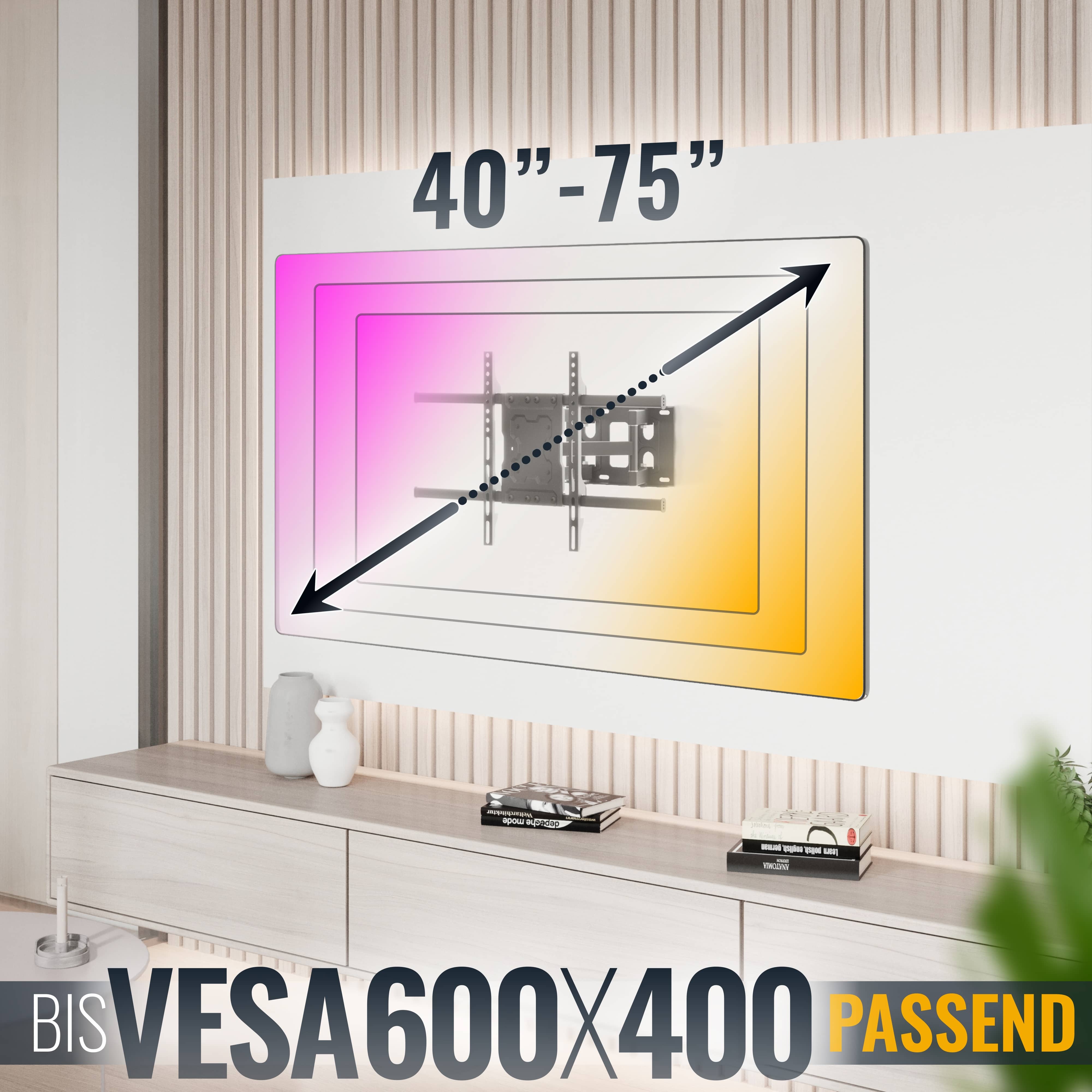 Alle Diagonalangaben in der Artikelbezeichnung / Beschreibung / Produktverpackung sind ungefähre Orientierungsangaben. Für die Wahl der Bildschirmhalterung ist nicht die Bildschirmdiagonale entscheidend, sondern die VESA-Norm (Lochabstände am Fernseher).