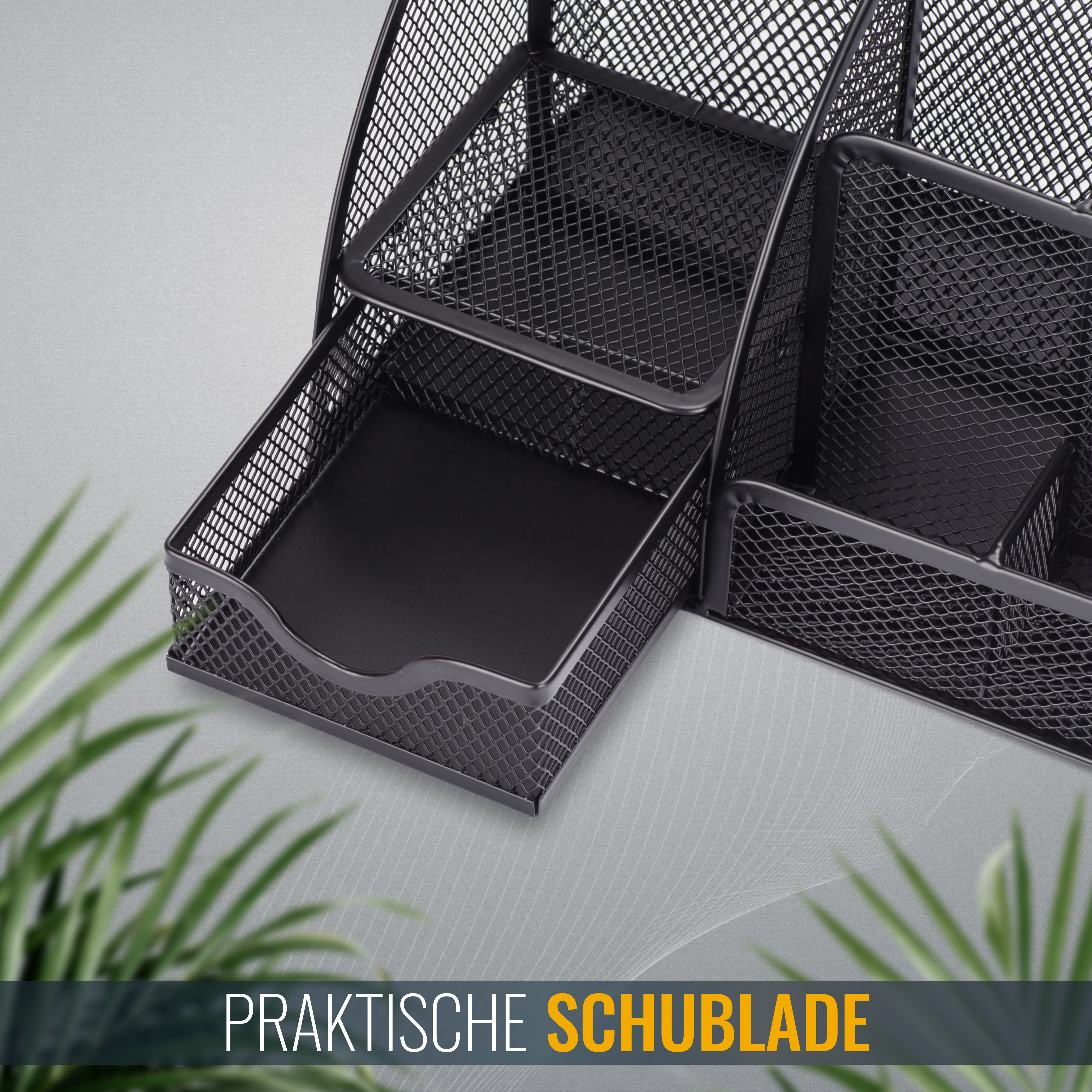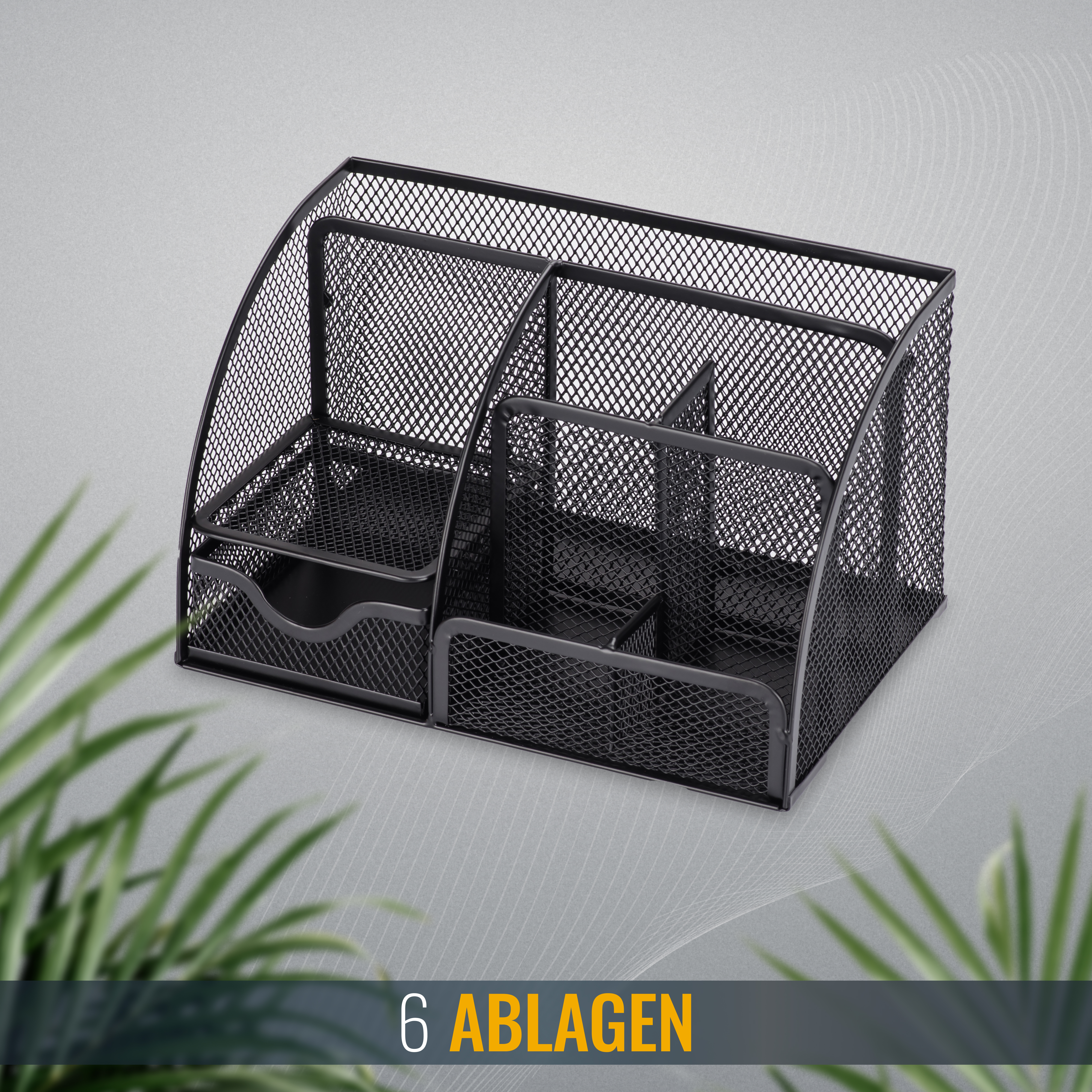 Mit seinen Gesamtmaßen von BxTxH 22x14x13cm bietet dieser Organizer ausreichend Platz für all Ihre Büromaterialien und Utensilien. Die Besonderheit dieses Organizers sind die 6 Ablagen und die praktische Schublade, die Ihnen dabei helfen, Ihre Gegenstände übersichtlich zu sortieren und griffbereit zu halten. Ob Stifte, Haftnotizen, Ordnerklammern oder andere kleine Büroartikel, mit diesem Organizer haben Sie alles schnell zur Hand.