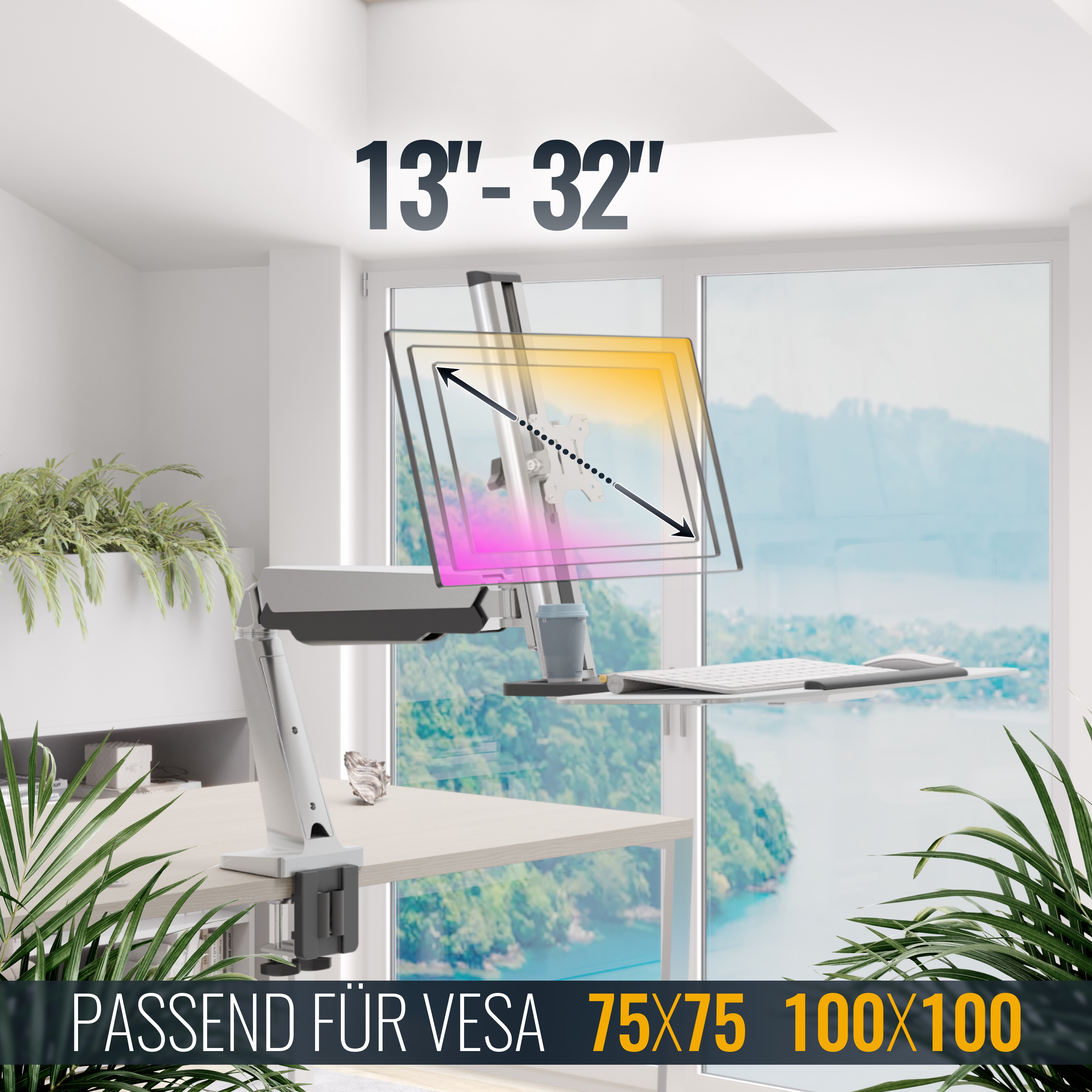 Angenehmes Bildbetrachten & passender Lichteinfall in Sitz-, Steh- und Liegeposition. Je nach Bildschirm-Größe & VESA-Lage aus bis zu +/-15° Neigung / Kippung hinauf und hinab. Die Tastatur-Ablage können Sie ebenfalls neigen, so wie Platzsparend hochklappen.