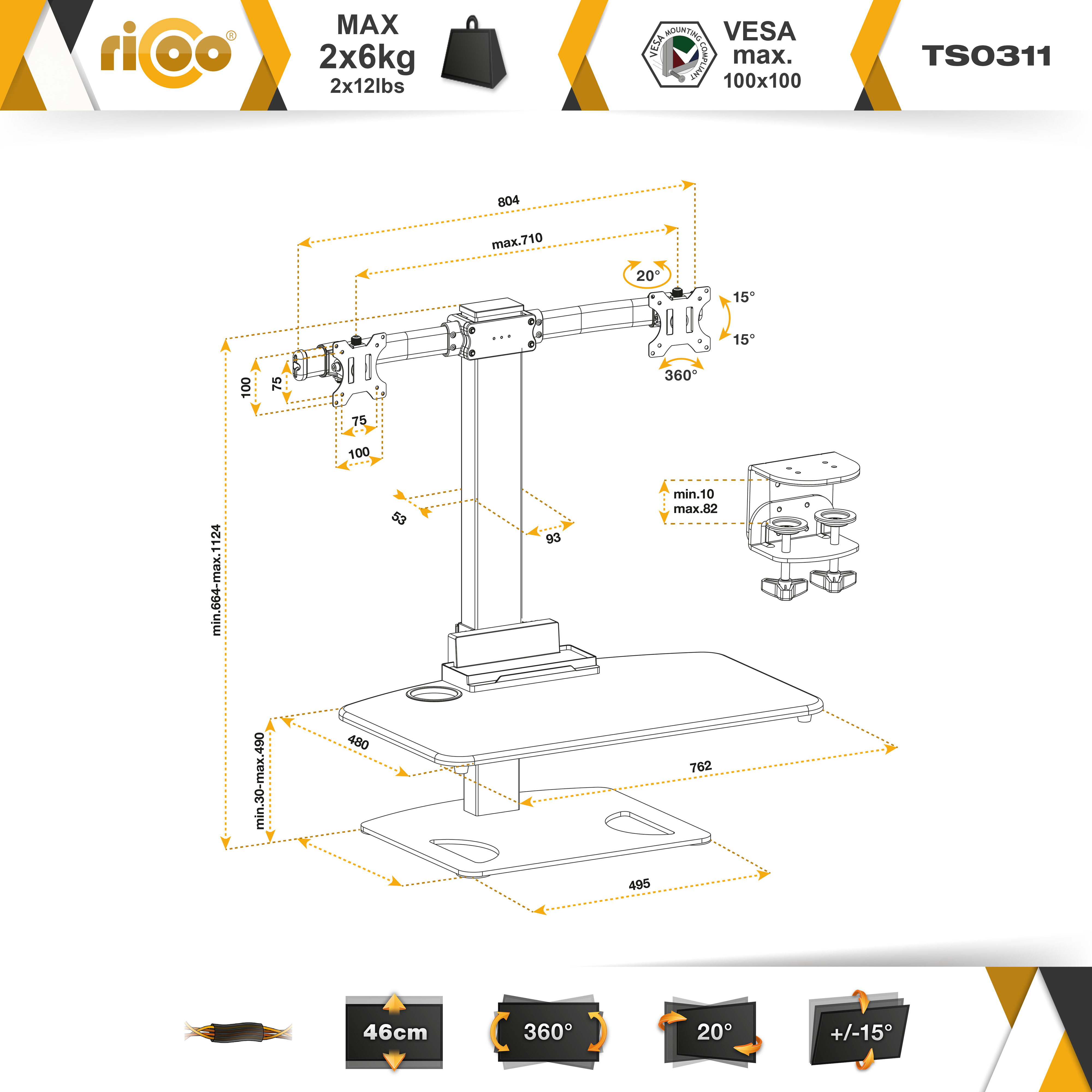 - Höhenverstellbar Schwenkarm: min. 664mm - max. 1124mm