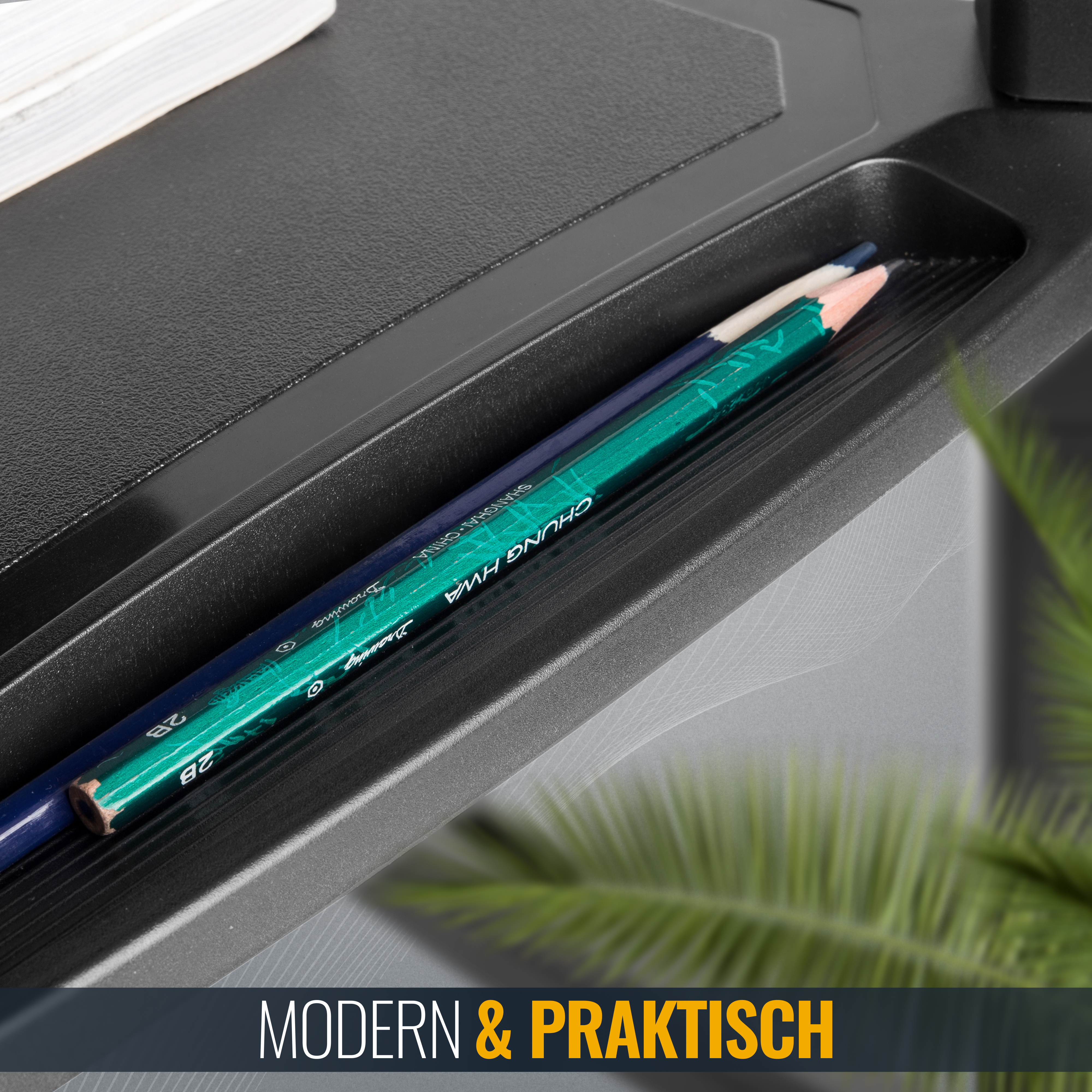 Legen Sie Stifte, Radiergummis, Büroklammern & Co praktisch in die seitlichen Kerbungs-RIffe des Tisches. Auch einige Smartphones & Tablets können gehalten werden. So haben Sie Ihr Büro-Zubehör jederzeit griffbereit