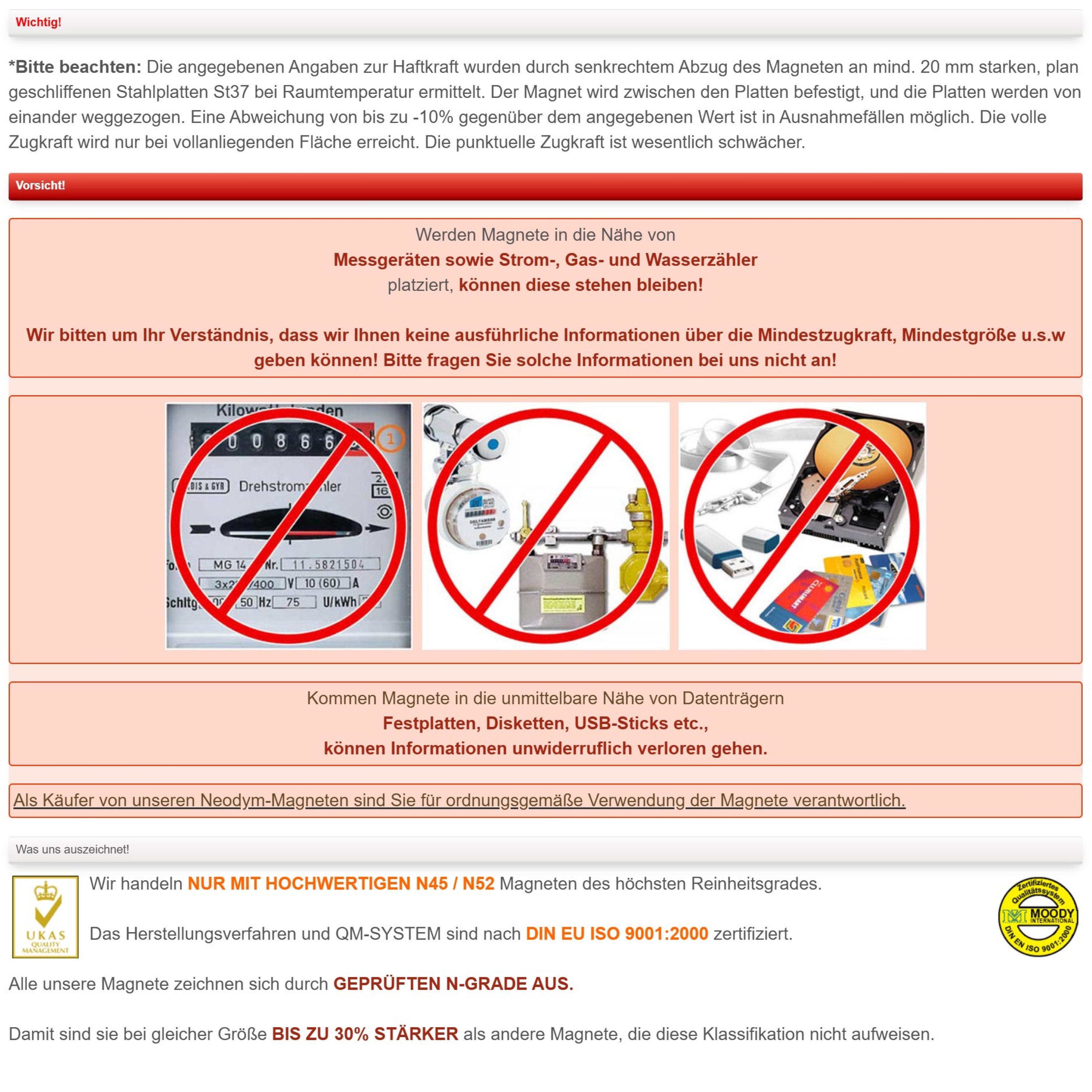Als Käufer von unseren Neodym-Magneten sind Sie für ordnungsgemäße Verwendung der Magnete verantwortlich. Wir übernehmen keine Haftung für Schäden die durch unsachgemässe Verwendung/Benutzung der Magnete entstehen. Mit dem Kaufabschluss nehmen Sie die Warnhinweise zur Kenntnis und verpflichten sich diese zu verfolgen.