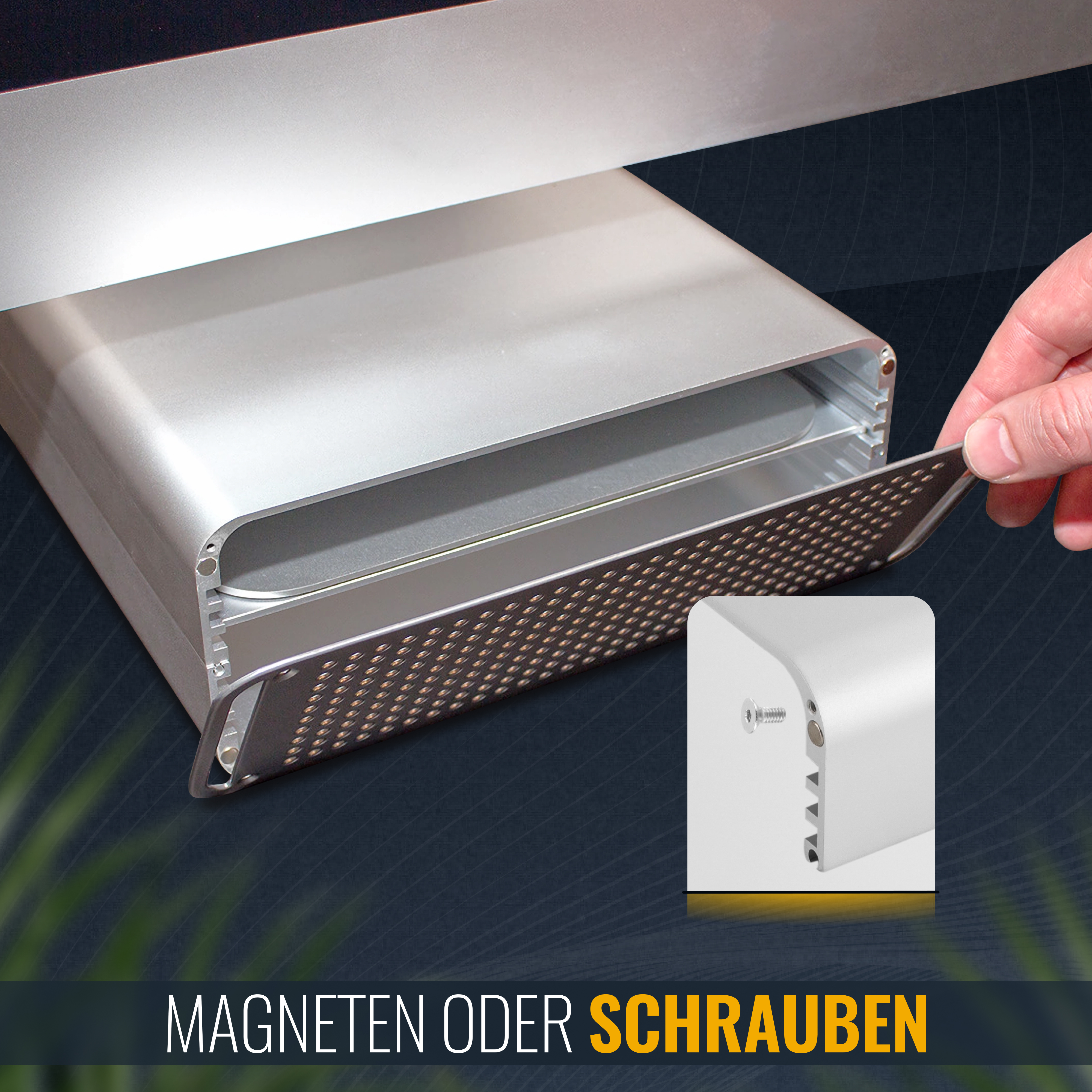 Das darunter entstehende Fach kann als Ablagefläche dienen – für Schlüssel, Geldbeutel, Festplatten oder anderes Zubehör.