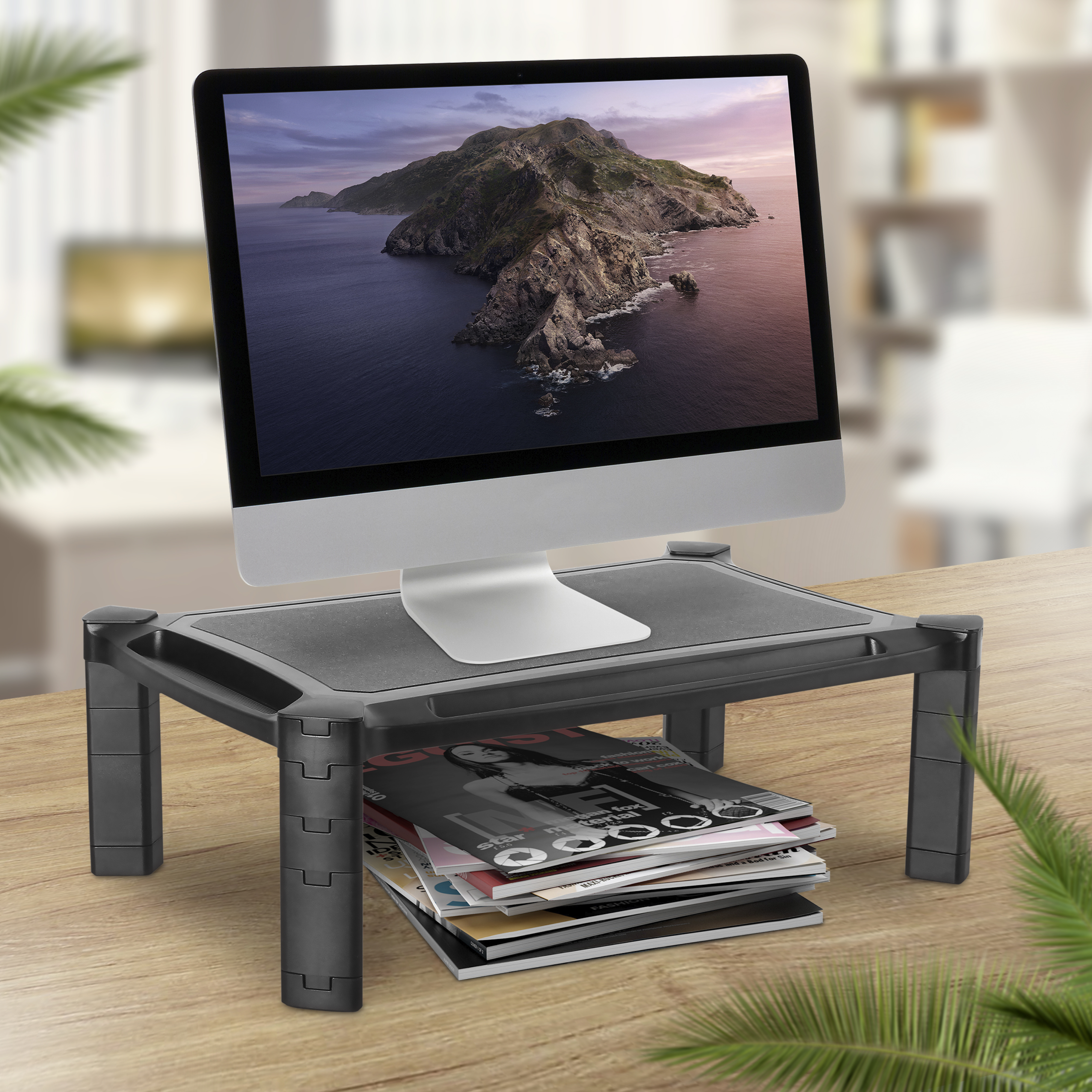 Praktischer Monitor Aufsatz, modular in der Höhe verstellbar durch einzelne Ergänzungsfüße.