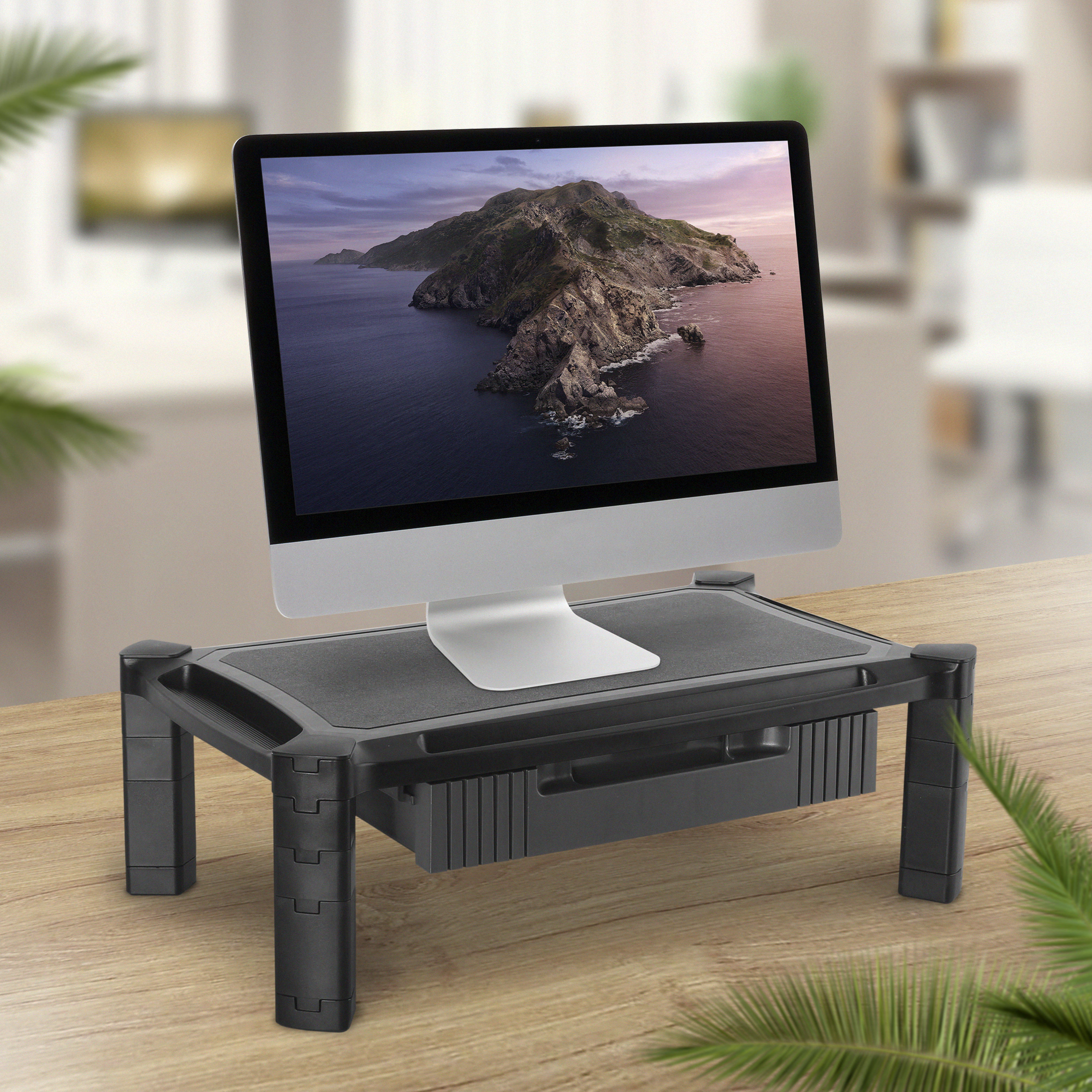 Praktischer Monitor Aufsatz mit Schublade, modular in der Höhe verstellbar durch einzelne Ergänzungsfüße.