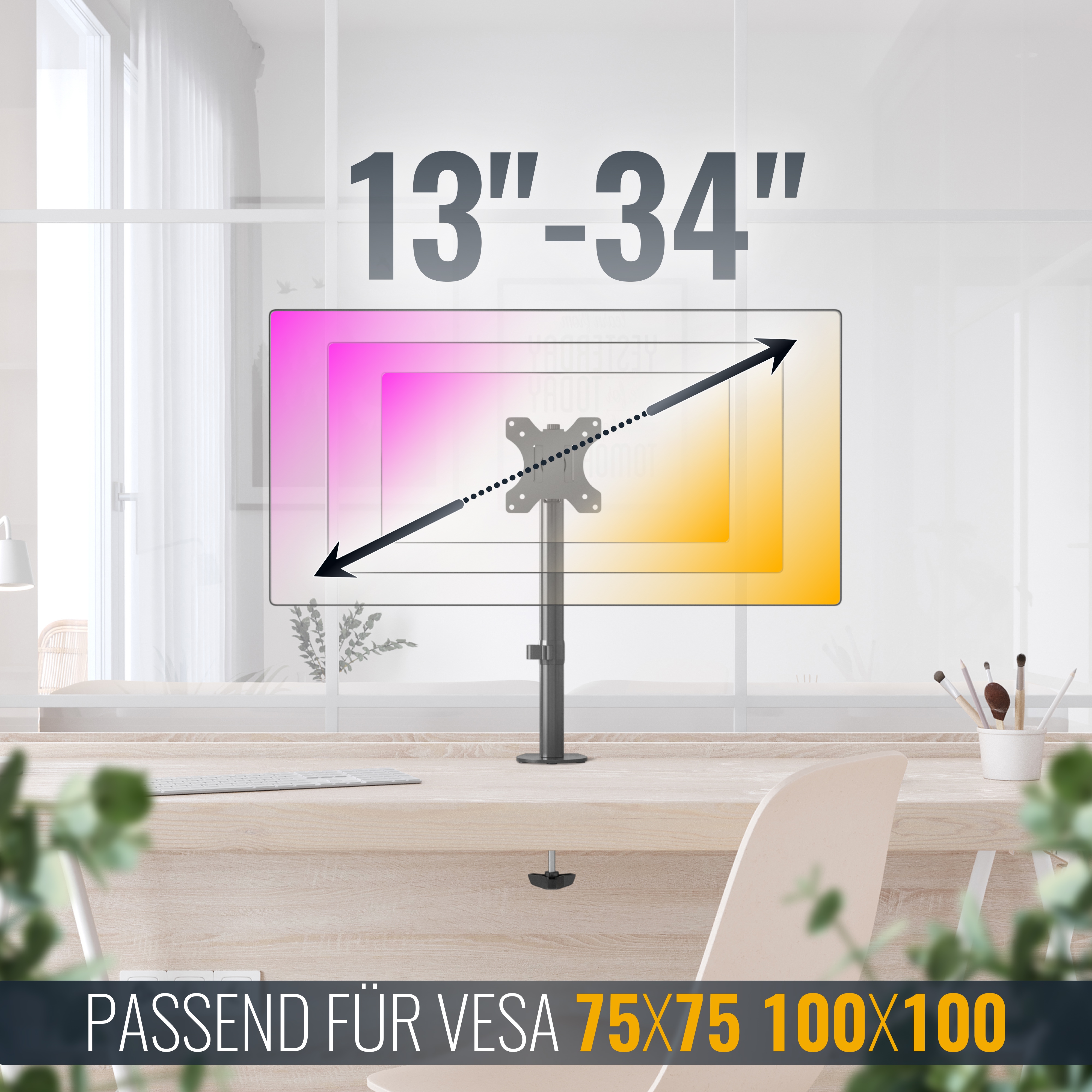 Befestigen Sie die Halterung via Tischklemme an einer Tischkante. Dann befestigen Sie den Schwenkarm an den Stab und Ihren Bildschirm an die VESA-Platte. Folglich schieben Sie diese in den Schwenkarm ein und drehen die Mutter fest. Nun können Sie die Kabel durch die Führungen legen. Fertig ist das Bildschirm-Vergnügen!