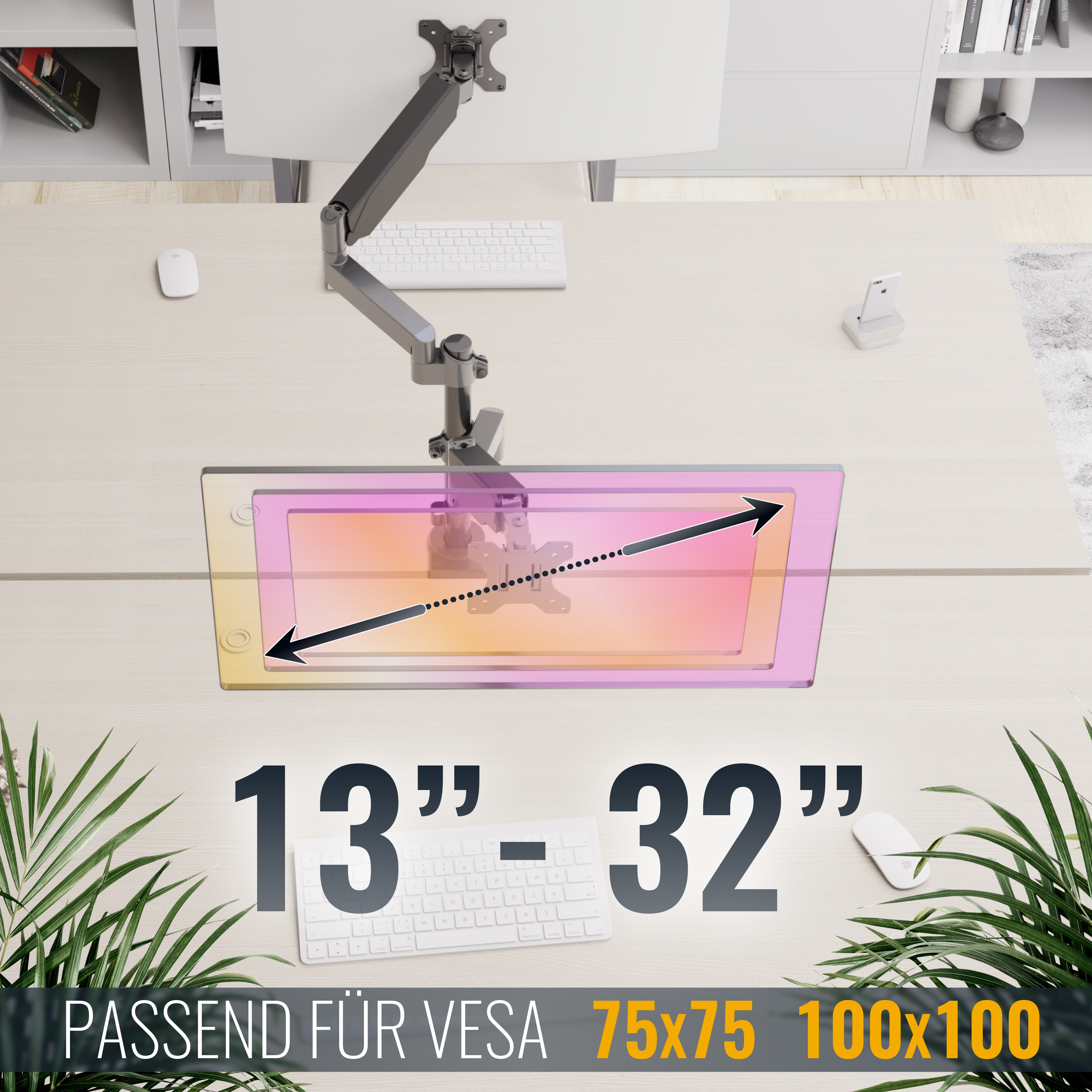 Befestigen Sie die Halterung via Tischklemme an einer Tischkante. Dann befestigen Sie die Bildschirme an die VESA-Aufnahmeplatten und schieben diese in den jeweiligen Schwenkarm ein mit anschließender Fixierung. Danach stellen Sie die Gasdruckfeder auf Ihren Bildschirm ein. Nun können Sie die Kabel durch die Führungen legen und es kann losgehen mit dem Bildschirm-Vergnügen.