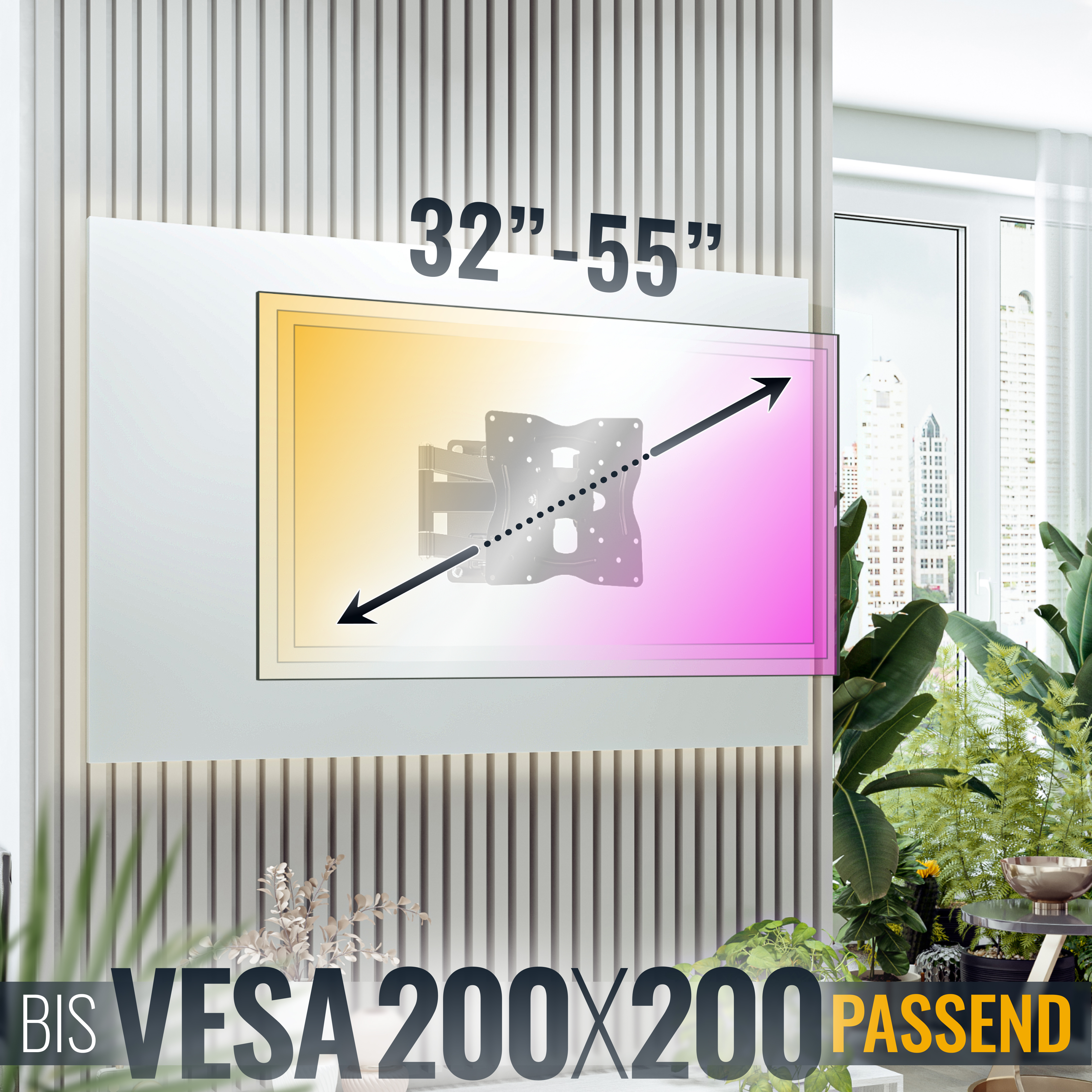 - Geeignet für TV-Geräte, PC-Monitore mit Bildschirmdiagonale ca. 69 - 140cm (27"-55"). Bitte die Lochabstände nachmessen! (Auch für größere Geräte passend. Bitte die Befestigungslöcher nachmessen.)
