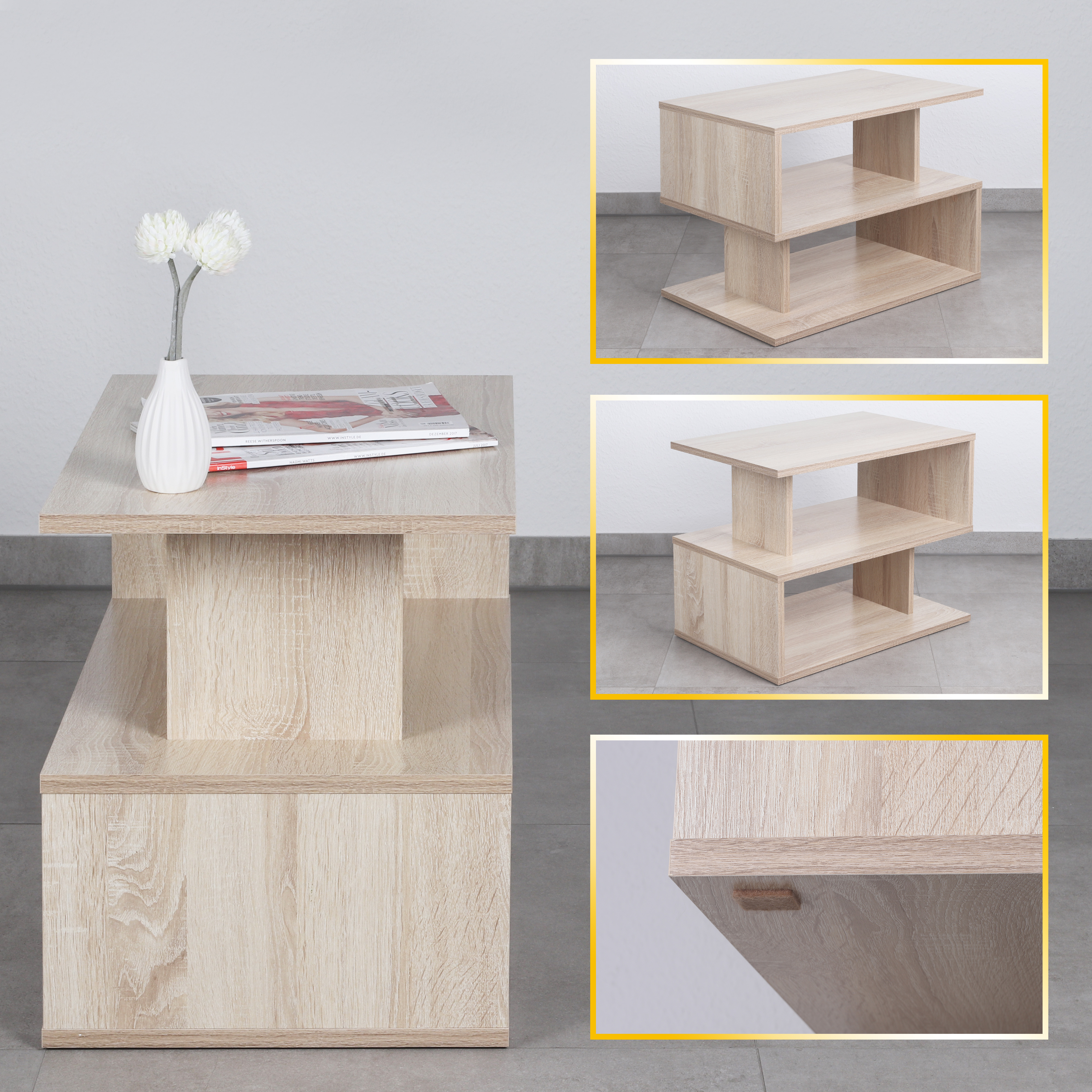 Dieser Sofatisch ist modern, elegant, klein und rechteckig. Mit den beiden großflächigen Ablagefächern bietet er viele Möglichkeiten zur Aufbewahrung auf mehreren Ebenen. Die Tischplatte und das Staufach dienen als Ablage für Fernbedienung, TV-Programm, Zeitschriften oder Deko. Da es sich um einen Holztisch handelt, empfehlen wir die Benutzung von Untersetzern für Gläser oder Tassen. Dieser Kaffeetisch eignet sich ideal als Tischchen vor oder neben der Couch oder dem Sessel, als Nachttisch, kleiner Fernsehtisch im Jugendzimmer und Schlafzimmer oder auch für das Wartezimmer. Selbstklebende Filzgleiter an den Füßen der Tischbeine dienen als Bodenschutz. Innenliegende Verschraubungen und der Farbe entsprechende Schraubenabdeckungen runden das Design ab. Dieses Möbelstück aus Spanplatten ist nur für den Innenbereich geeignet.