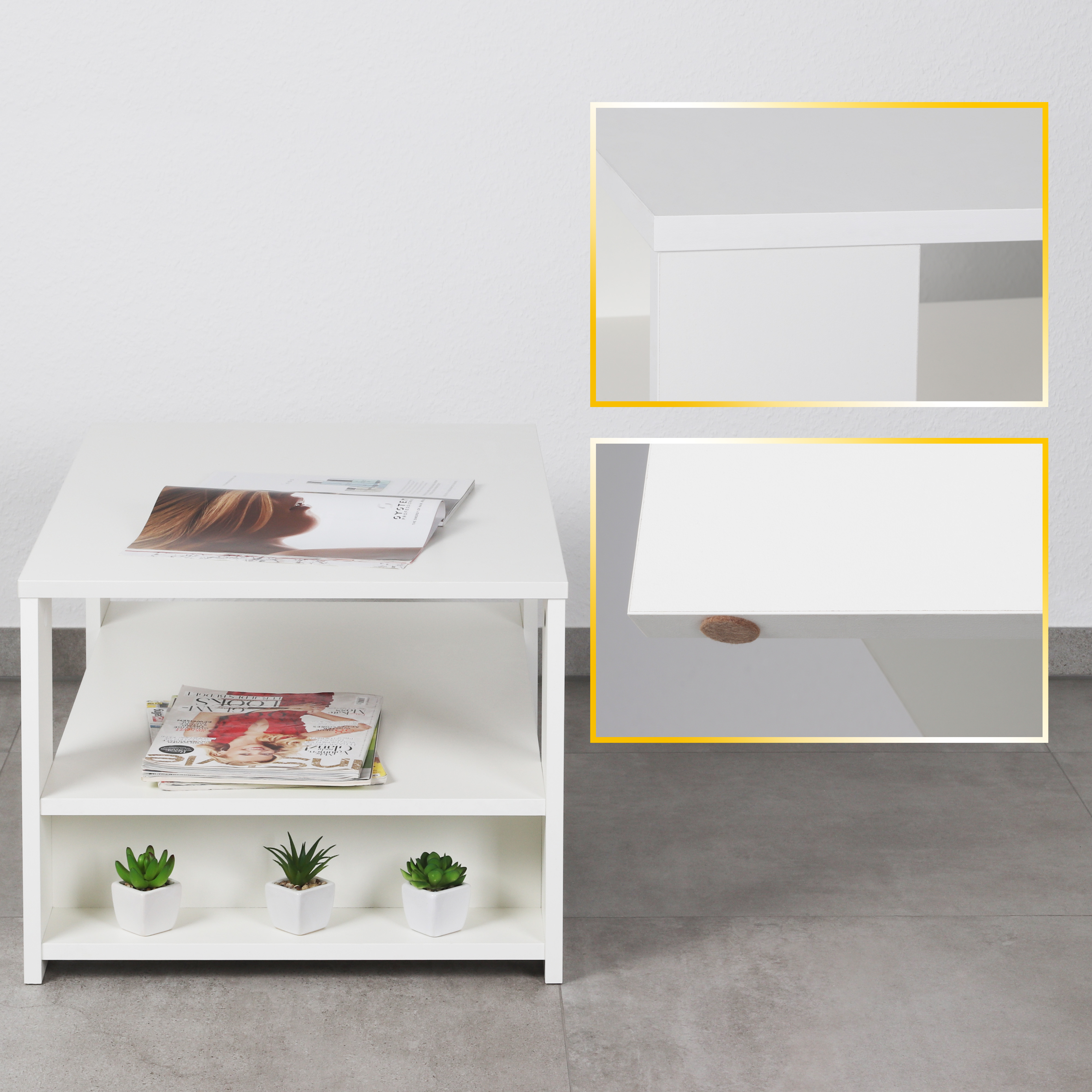 Dieser Sofatisch ist modern, elegant, klein und rechteckig. Dank des großflächigen Ablagefachs bietet er viele Möglichkeiten zur Aufbewahrung auf mehreren Ebenen. Die Tischplatte und das Staufach dienen als Ablage für Fernbedienung, TV-Programm, Zeitschriften oder Deko. Da es sich um einen Holztisch handelt, empfehlen wir die Benutzung von Untersetzern für Gläser oder Tassen. Dieser Kaffeetisch eignet sich ideal als Tischchen vor oder neben der Couch oder dem Sessel, als Nachttisch, kleiner Fernsehtisch im Jugendzimmer und Schlafzimmer oder auch für das Wartezimmer. Selbstklebende Filzgleiter an den Füßen der Tischbeine dienen als Bodenschutz. Innenliegende Verschraubungen und der Farbe entsprechende Schraubenabdeckungen runden das Design ab. Dieses Möbelstück aus Spanplatten ist nur für den Innenbereich geeignet.