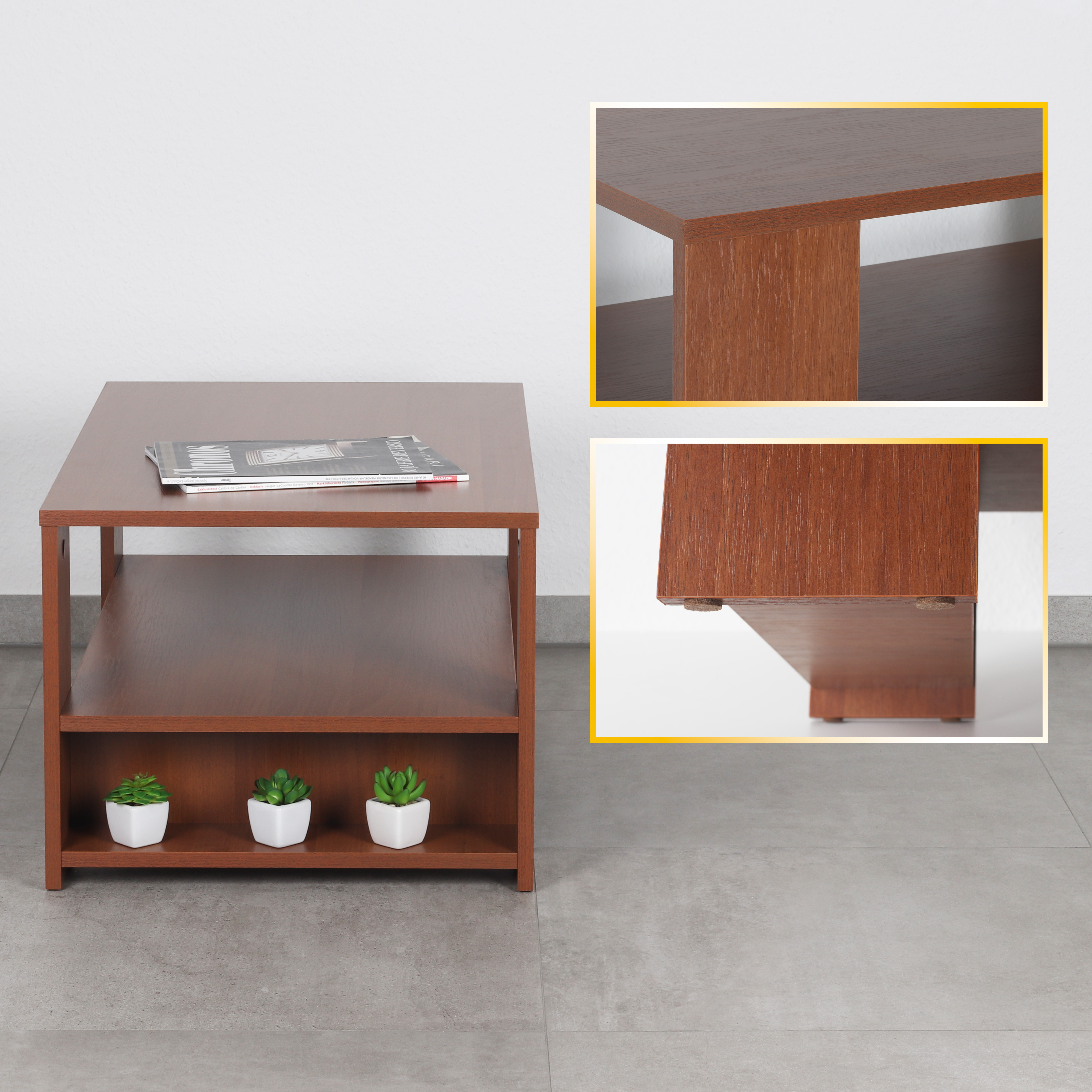 Dieser Sofatisch ist modern, elegant, klein und rechteckig. Dank des großflächigen Ablagefachs bietet er viele Möglichkeiten zur Aufbewahrung auf mehreren Ebenen. Die Tischplatte und das Staufach dienen als Ablage für Fernbedienung, TV-Programm, Zeitschriften oder Deko. Da es sich um einen Holztisch handelt, empfehlen wir die Benutzung von Untersetzern für Gläser oder Tassen. Dieser Kaffeetisch eignet sich ideal als Tischchen vor oder neben der Couch oder dem Sessel, als Nachttisch, kleiner Fernsehtisch im Jugendzimmer und Schlafzimmer oder auch für das Wartezimmer. Selbstklebende Filzgleiter an den Füßen der Tischbeine dienen als Bodenschutz. Innenliegende Verschraubungen und der Farbe entsprechende Schraubenabdeckungen runden das Design ab. Dieses Möbelstück aus Spanplatten ist nur für den Innenbereich geeignet.