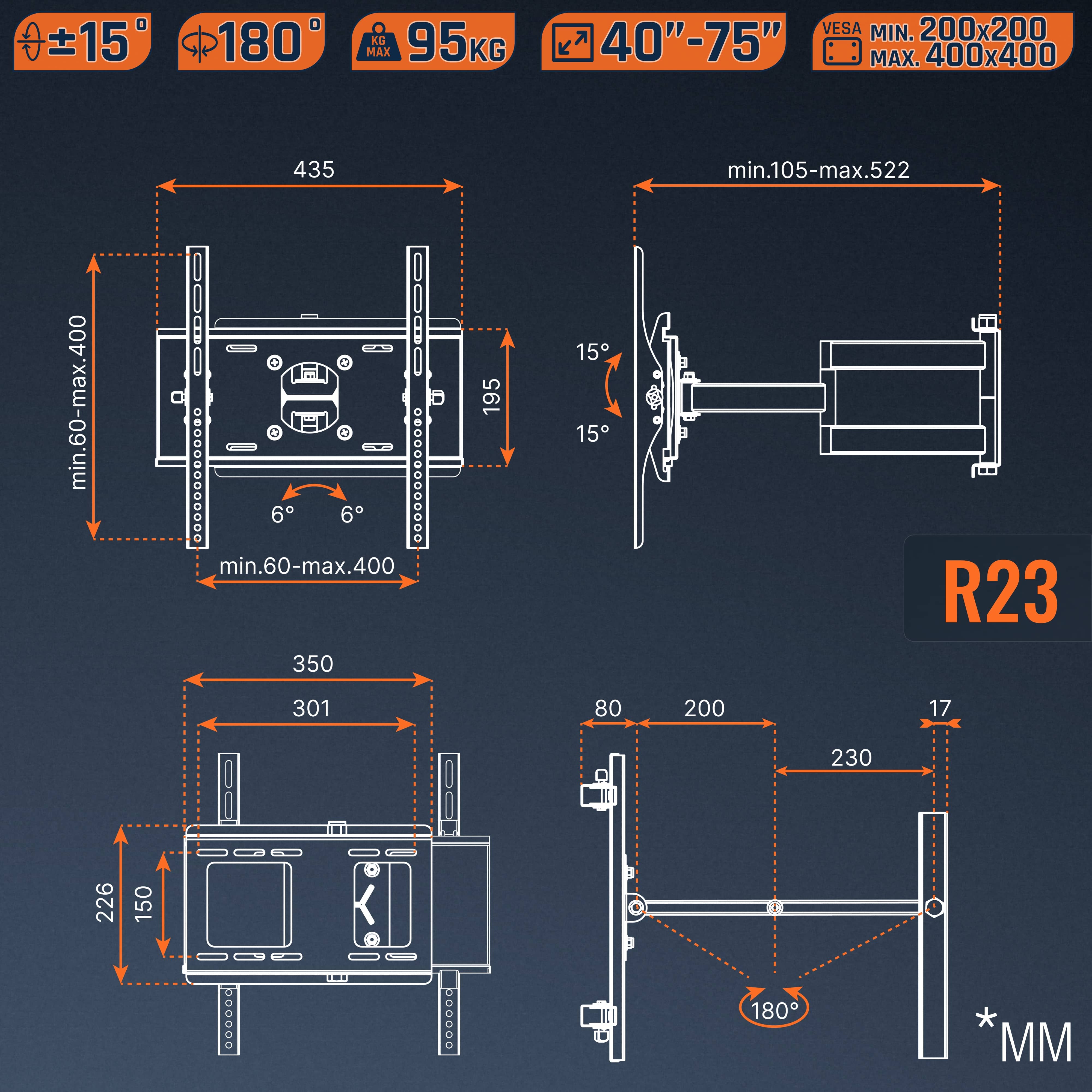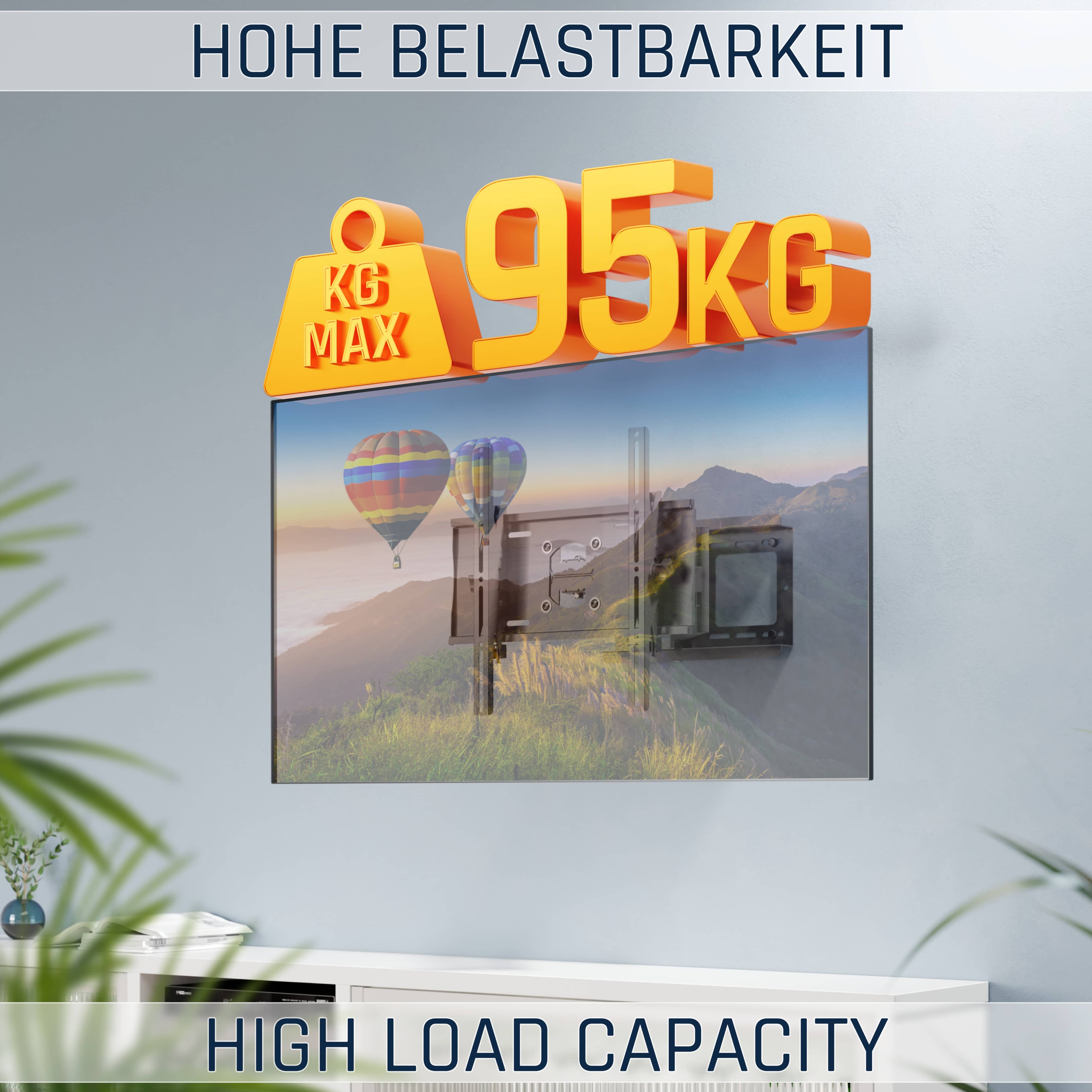 Ausschlaggebend sind die maximale Belastbarkeit der Halterung sowie die VESA-Norm des Fernsehers und deren Position. Die Angaben zur Display-Diagonale sind nur Richtwerte.