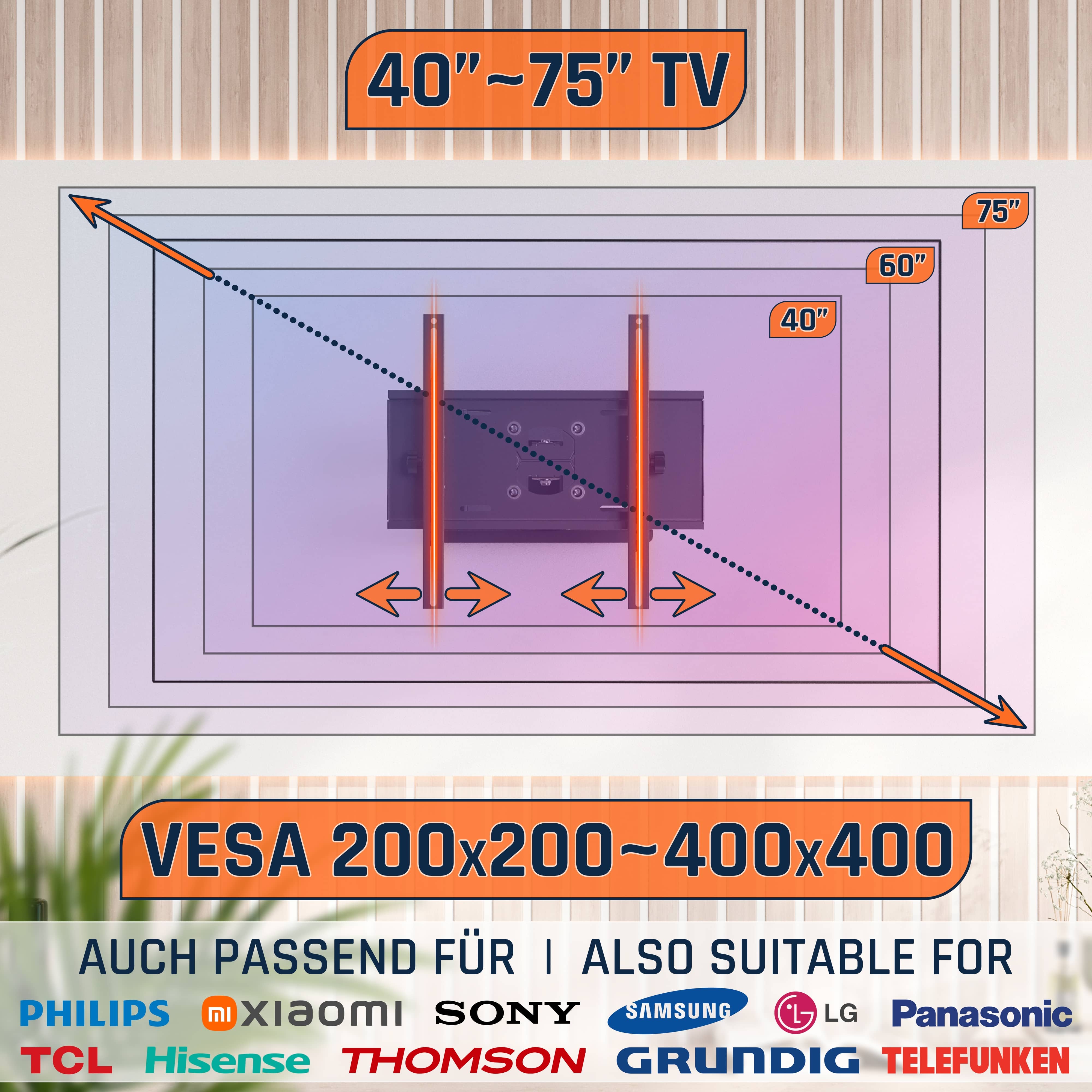 Bitte überprüfen Sie vor dem Kauf, ob die TV-Wandhalterung mit Ihrem Fernseher kompatibel ist. Um zu vermeiden, dass die Halterung an einer Seite des Fernsehers übersteht, empfehlen wir sie für Bildschirme mit einer Diagonale von 31-65 Zoll (79-165 cm). Bitte beachten Sie, dass alle Diagonalangaben in der Artikelbezeichnung / Beschreibung / Produktverpackung nur Orientierungsangaben sind. Für die Wahl der passenden Halterung sind die VESA-Norm und das Gewicht des Bildschirms ausschlaggebend.