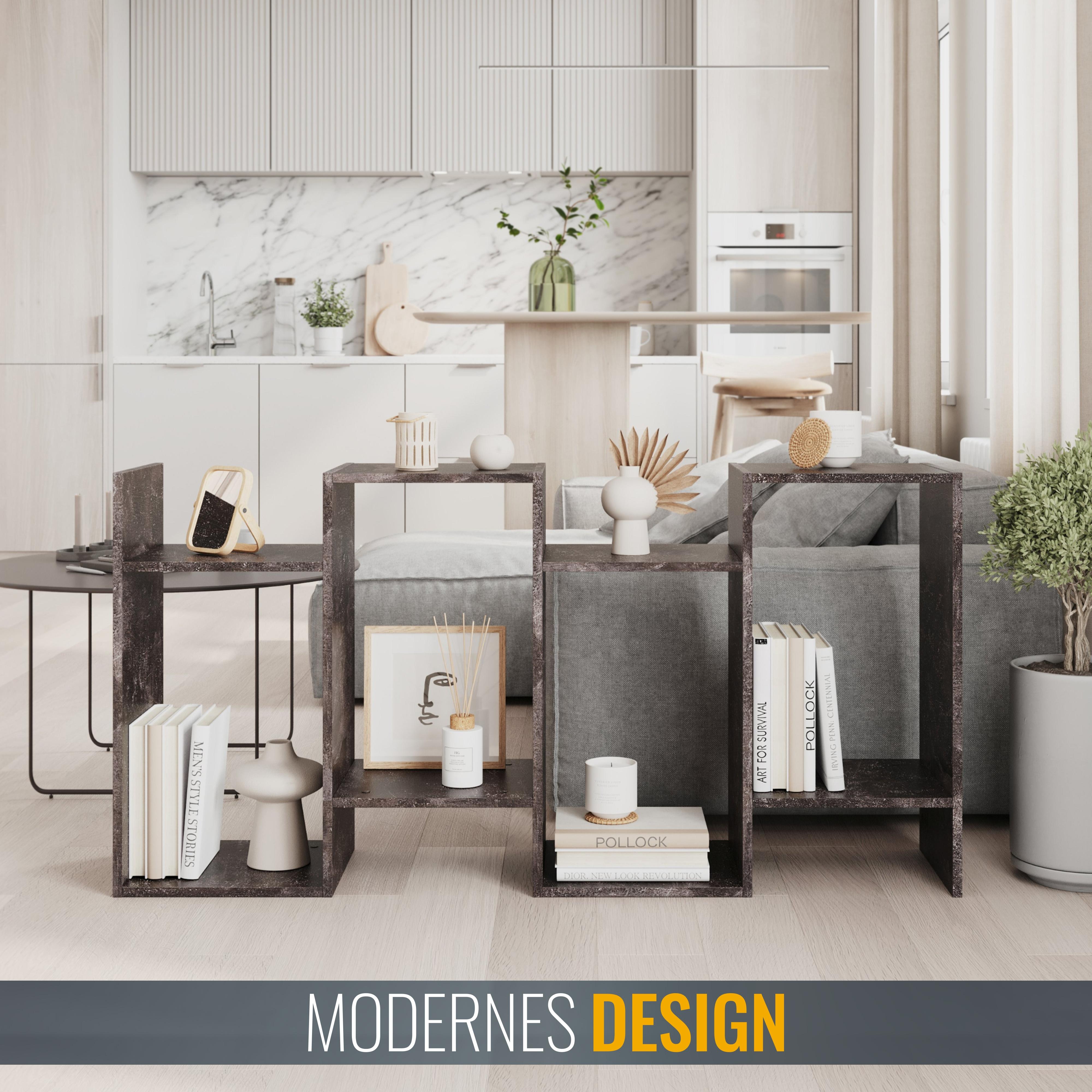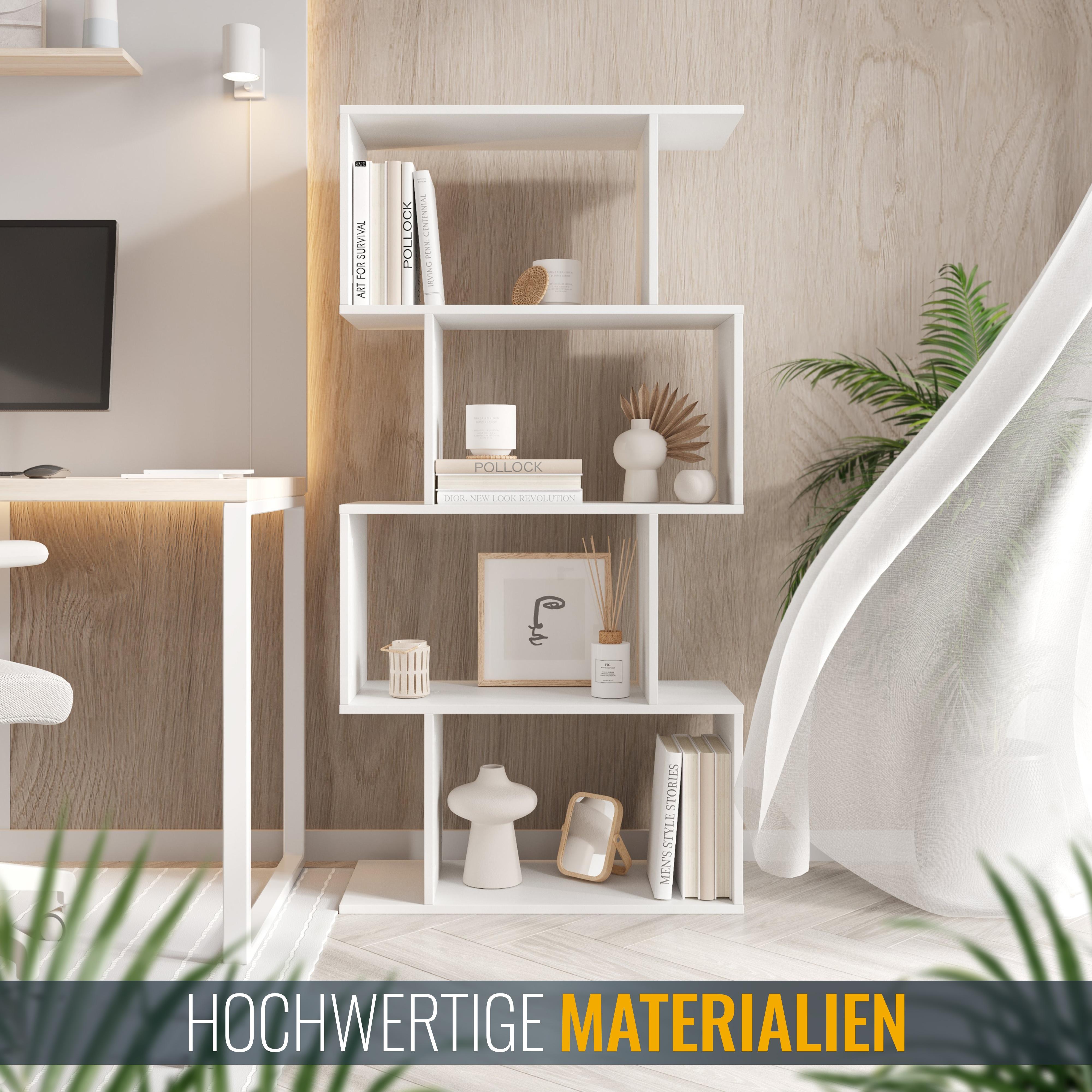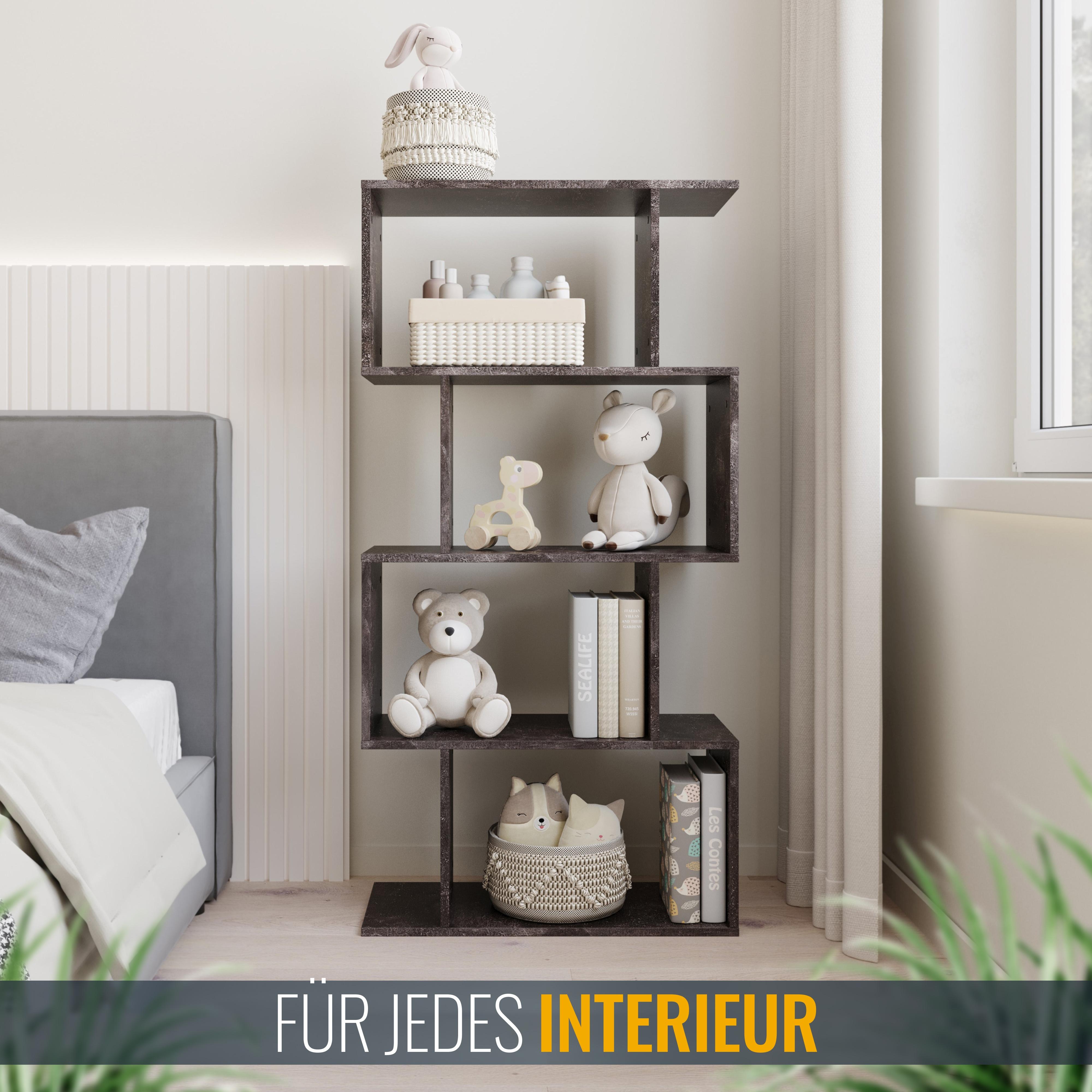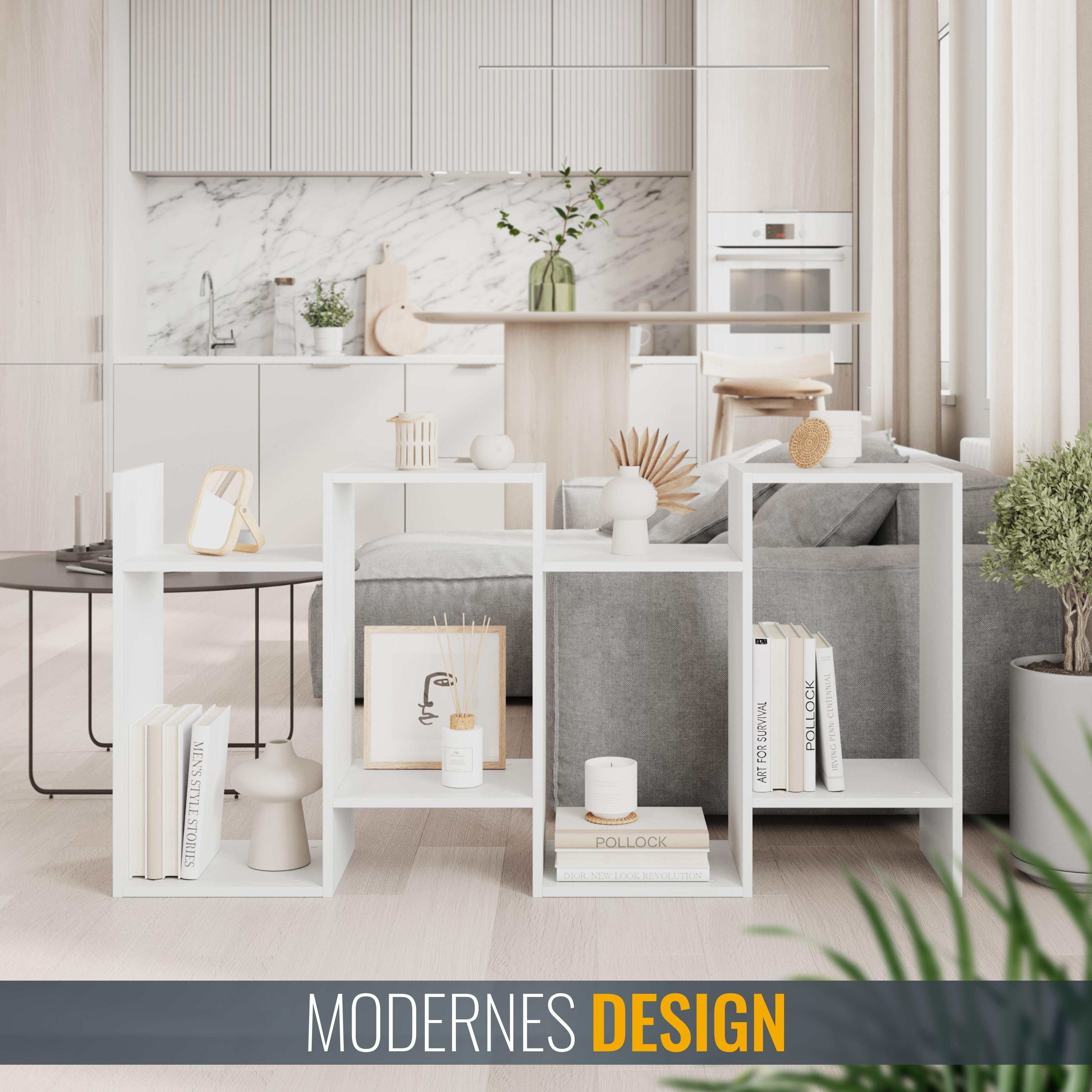 Unser schickes, modernes und schmales Standregal mit 4 Fächern bietet viel Platz für Dekorationen und mehr. Die Regale sind ideal für Bücher, Spielzeug, Pflanzen oder Lautsprecher. Es kann auch als CD-Ständer oder DVD-Regal verwendet werden. Modernes und dekoratives Aufbewahrungsregal mit viel Stauraum. Ideal fürs Wohn-, Schlaf- und Kinderzimmer, den Flur oder das Büro oder auch zur Küchenorganisation, z.B. als Gewürz- oder Kräuterregal, geeignet. Interne Schraubverbindungen und farblich abgestimmte Schraubenabdeckungen vervollständigen das Design. Die optionale Wandbefestigung bietet Sicherheit und verhindert das Umkippen des Bücherregals. Dieses Möbelstück aus Spanplatten ist nur für den Innenbereich geeignet.