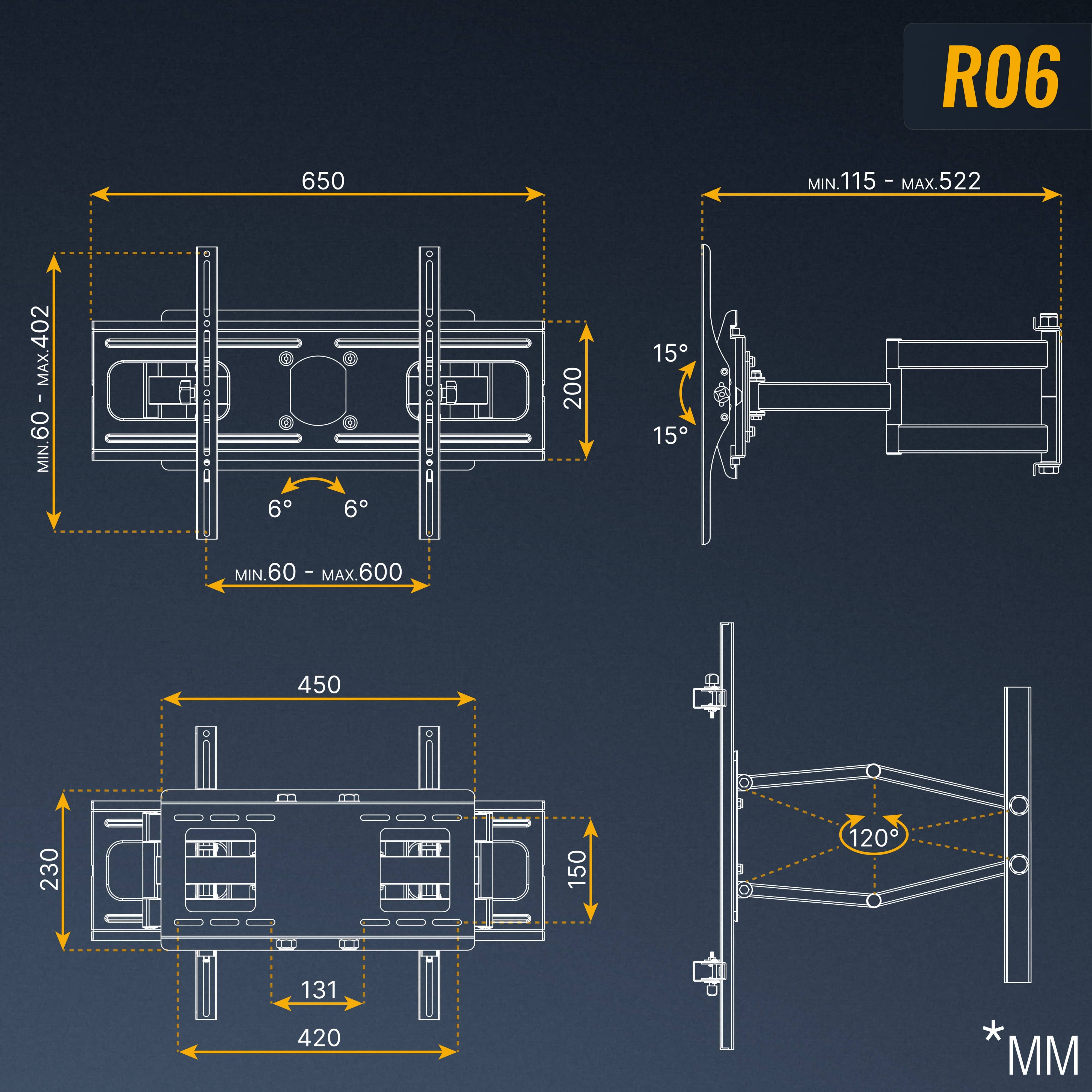 Mit etwas geringerem Wand-Abstand als die R13 und Doppelarm Stabilität trägt Ihnen diese R06 Wandhalterung TV schwenkbar, neigbar oder Ihren Monitor (beispielsweise All-in-One-PC) an Ihrer Wand!