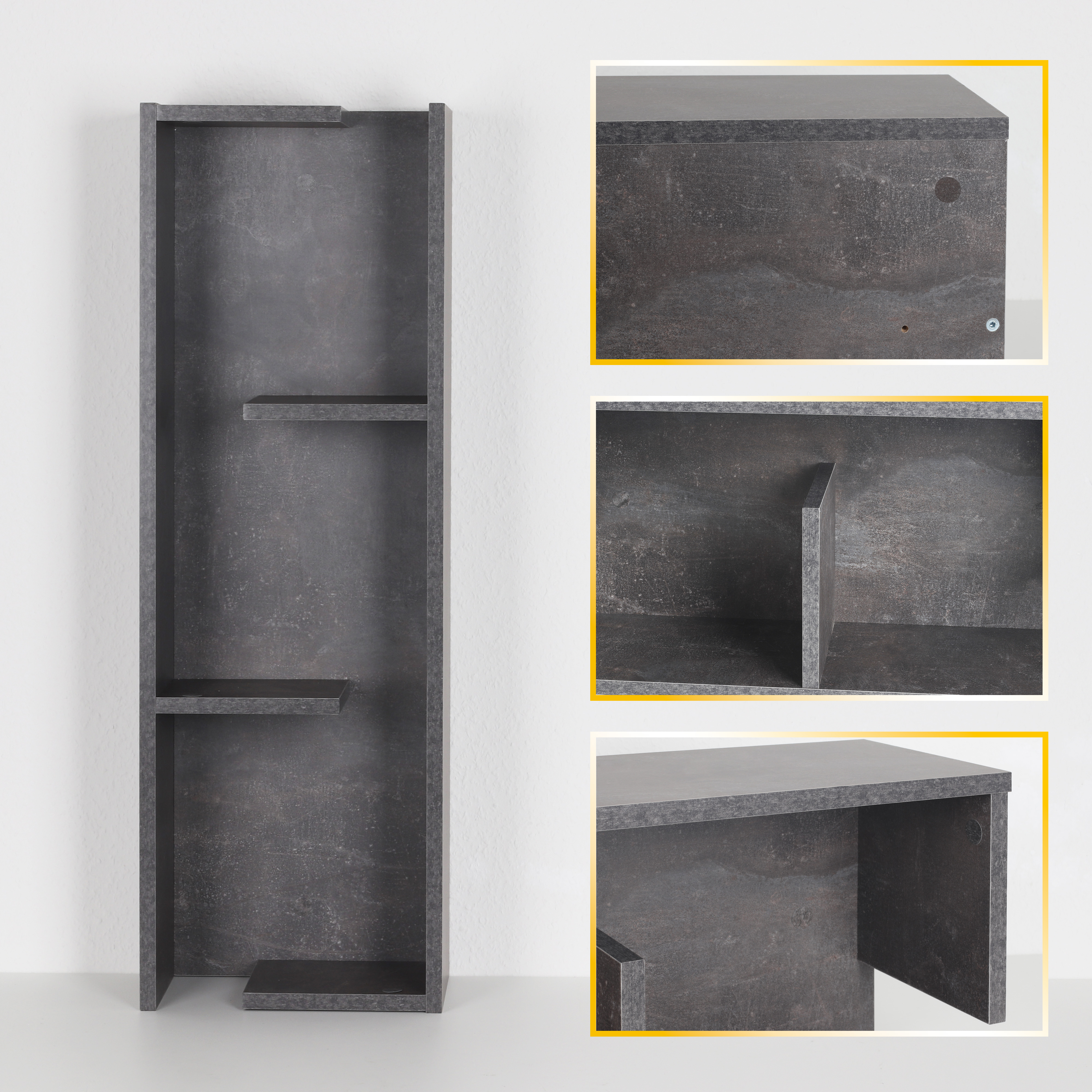 Innenliegende Verschraubungen und der Farbe entsprechende Schrauben-Abdeckungen runden das Design ab. Dank der praktischen Aufhängung kann es freischwebend, entweder hochkant oder quer aufgehängt werden.