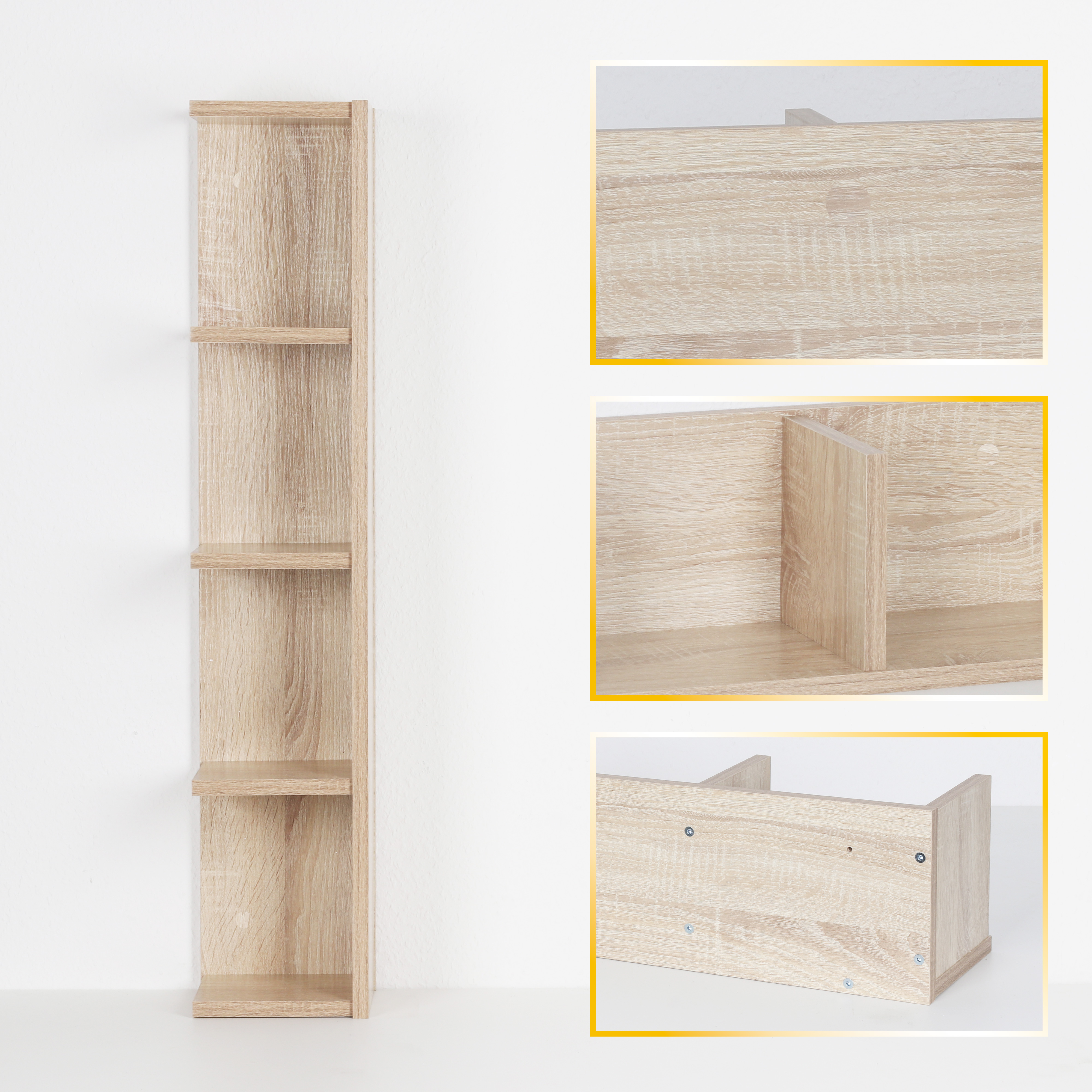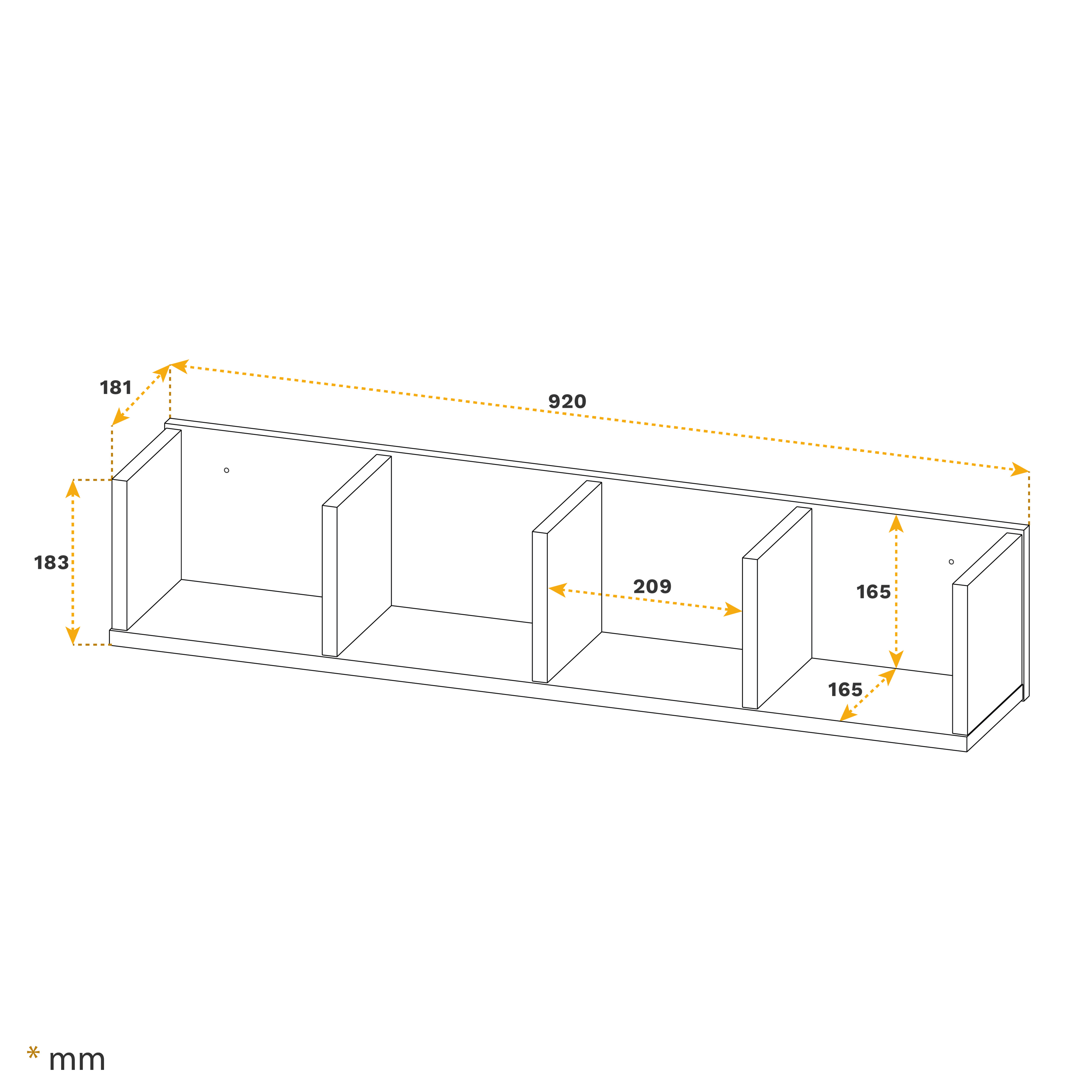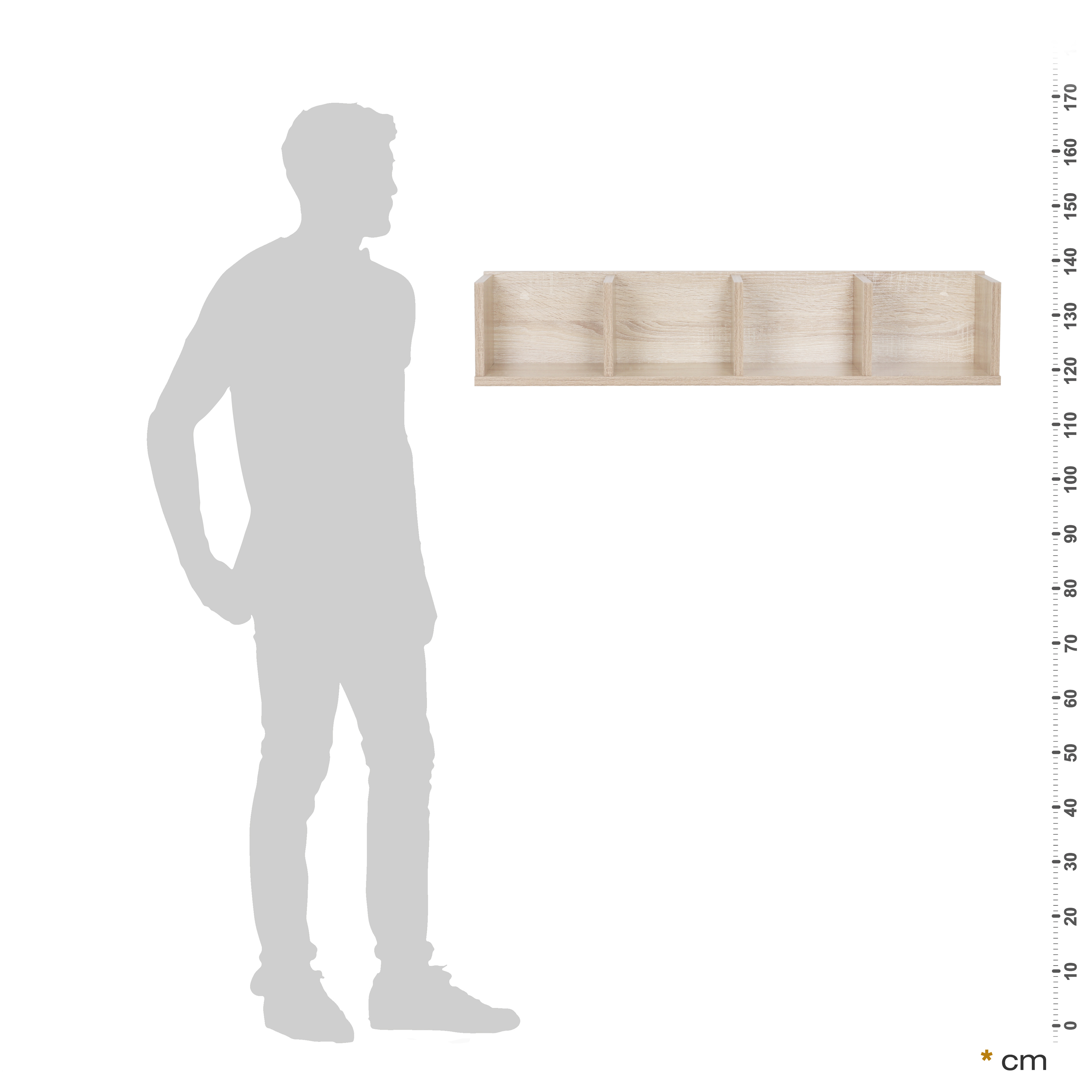Dieses Schweberegal ist ein kleines schwebendes Bücherregal zum Aufhängen an der Wand. 4 Fächer bieten viel Platz zur Aufbewahrung von Dekoration und mehr. Ideal fürs Wohnzimmer, Schlafzimmer, Kinderzimmer, Jugendzimmer, den Flur oder das Büro oder auch zur Küchenorganisation, z.B. als Gewürzregal oder Kräuterregal in der Küche. Das Wandboard bietet vielseitigen Stauraum. Die Fächer dienen als Ablage für Bücher, Spielzeug, Pflanzen, Deko, Lautsprecher. Auch als CD Ständer oder DVD Regal nutzbar. Innenliegende Verschraubungen und der Farbe entsprechende Schraubenabdeckungen runden das Design ab. Dank der praktischen Aufhängung kann es quer oder hochkant aufgehängt und daher auch als Eckregal genutzt werden. Dieses Möbelstück ist modern, freischwebend und aus Pressspanplatten gefertigt. Es ist nur für den Innen-Bereich geeignet.