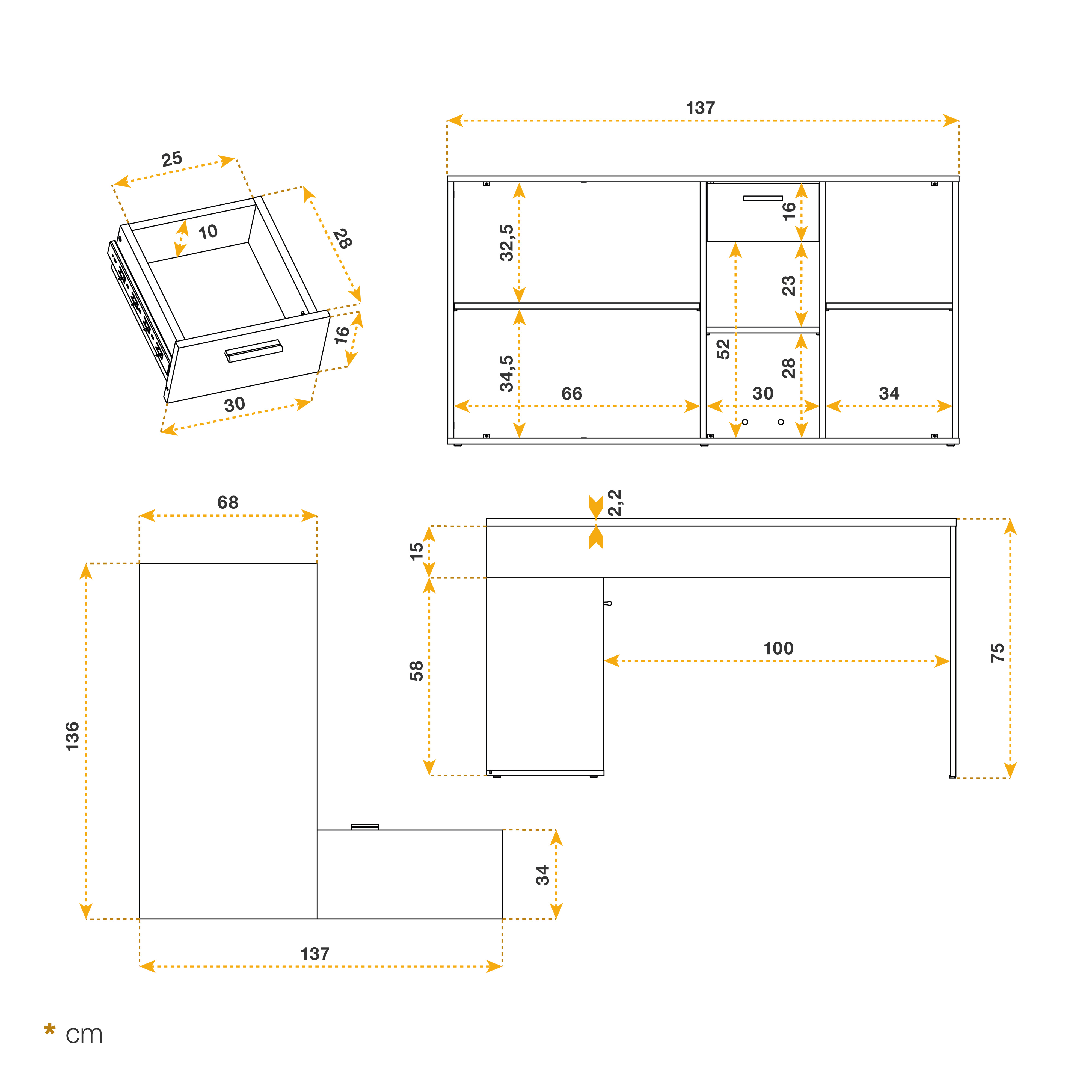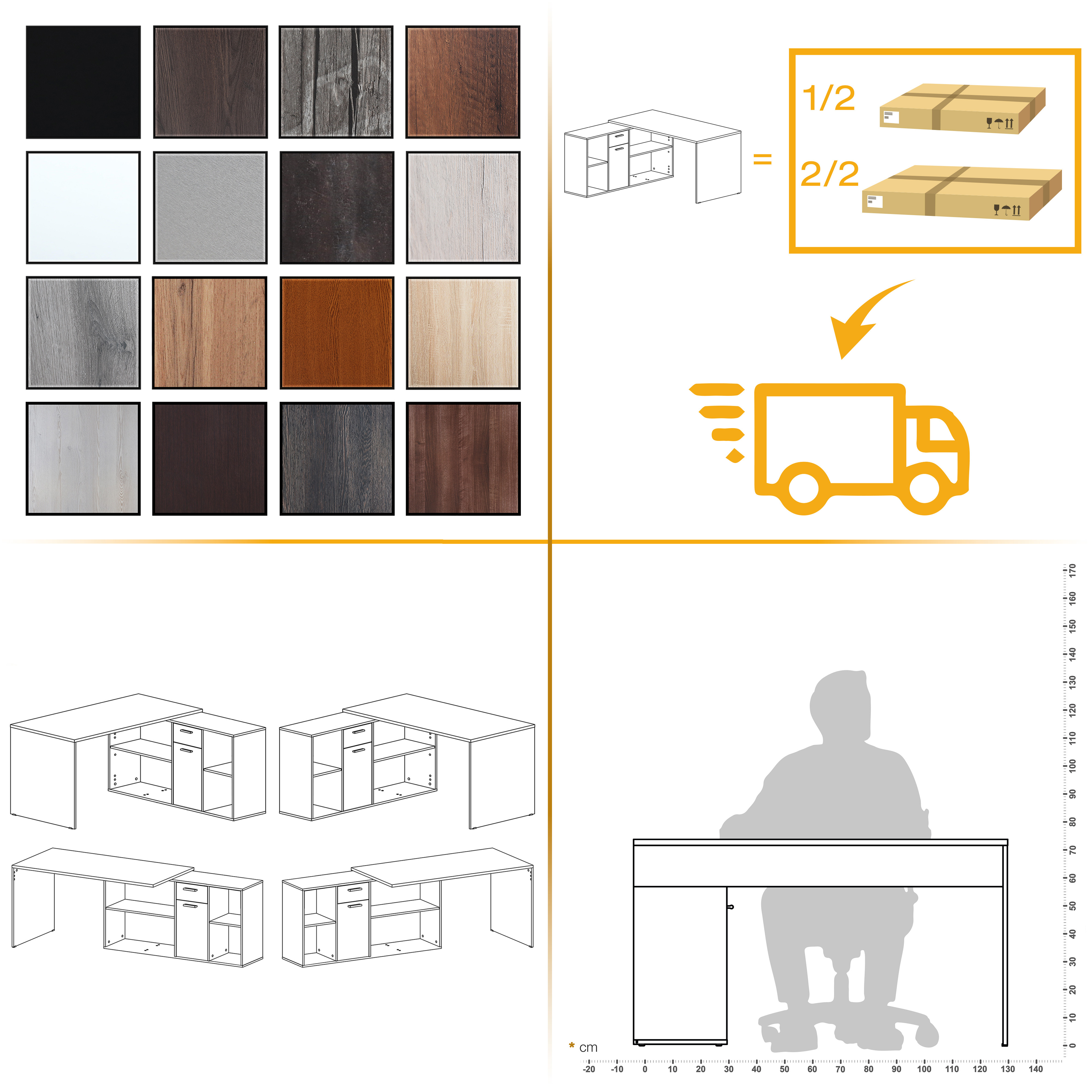 Setzen Sie diesen beidseitig anschlagbaren Schreibtisch bei Bedarf gewinkelt oder ausgestreckt in Ihren Wohnraum, ins Kinderzimmer oder in Ihr Büro. Hochbeständiges, melaminbeschichtetes Holz liefert qualitative Standfestigkeit und Materialbeständigkeit. Harmonische Farbe verleiht Ihren Räumen wohlige Behaglichkeit. Ob als Bürotisch, Wohnzimmertisch, Kinderzimmertisch, Schminktisch, Verkaufstisch oder als kreative Gestaltungsecke - Mit diesem Schreibtisch liefern Sie sich praktisch moderne Funktionalität ins Haus!