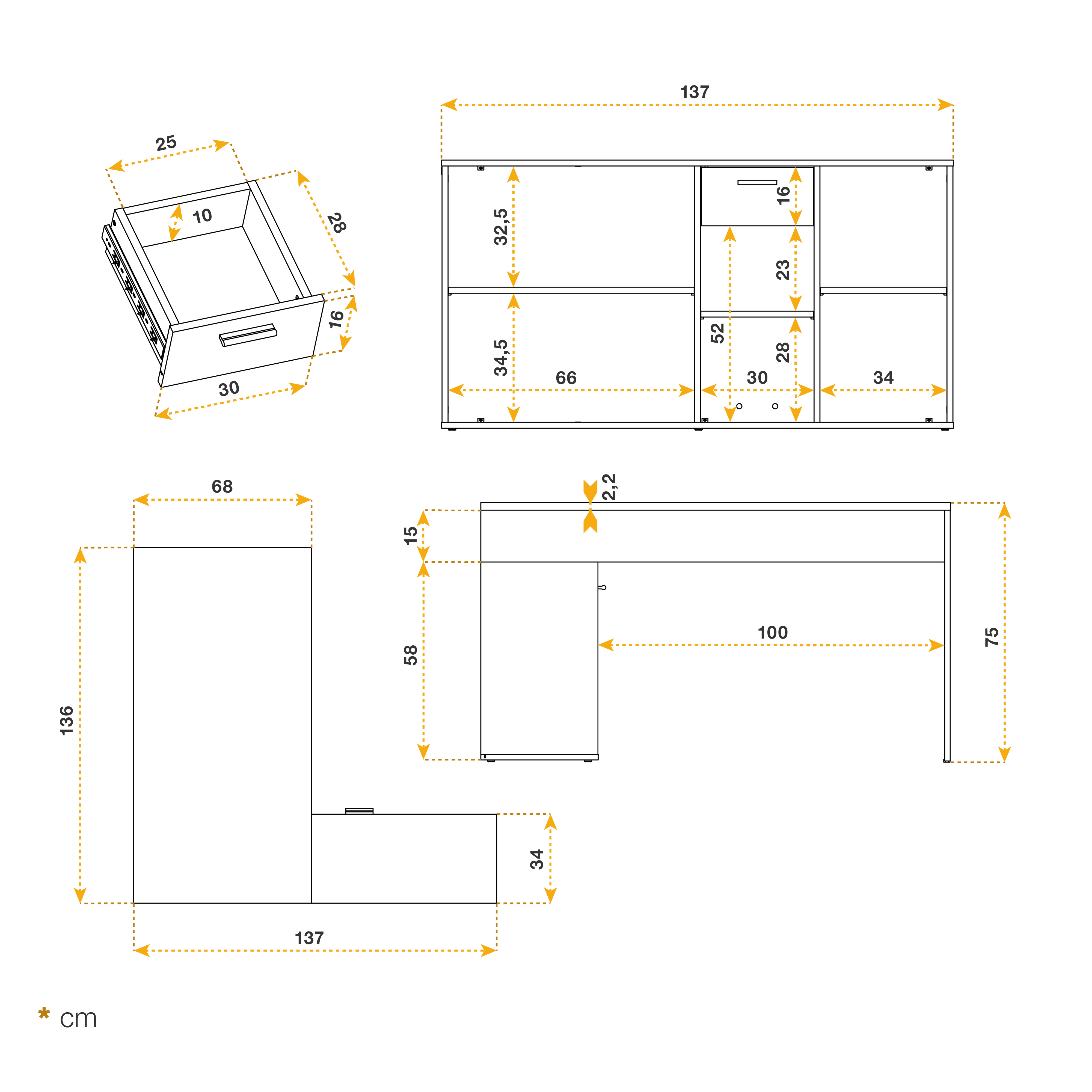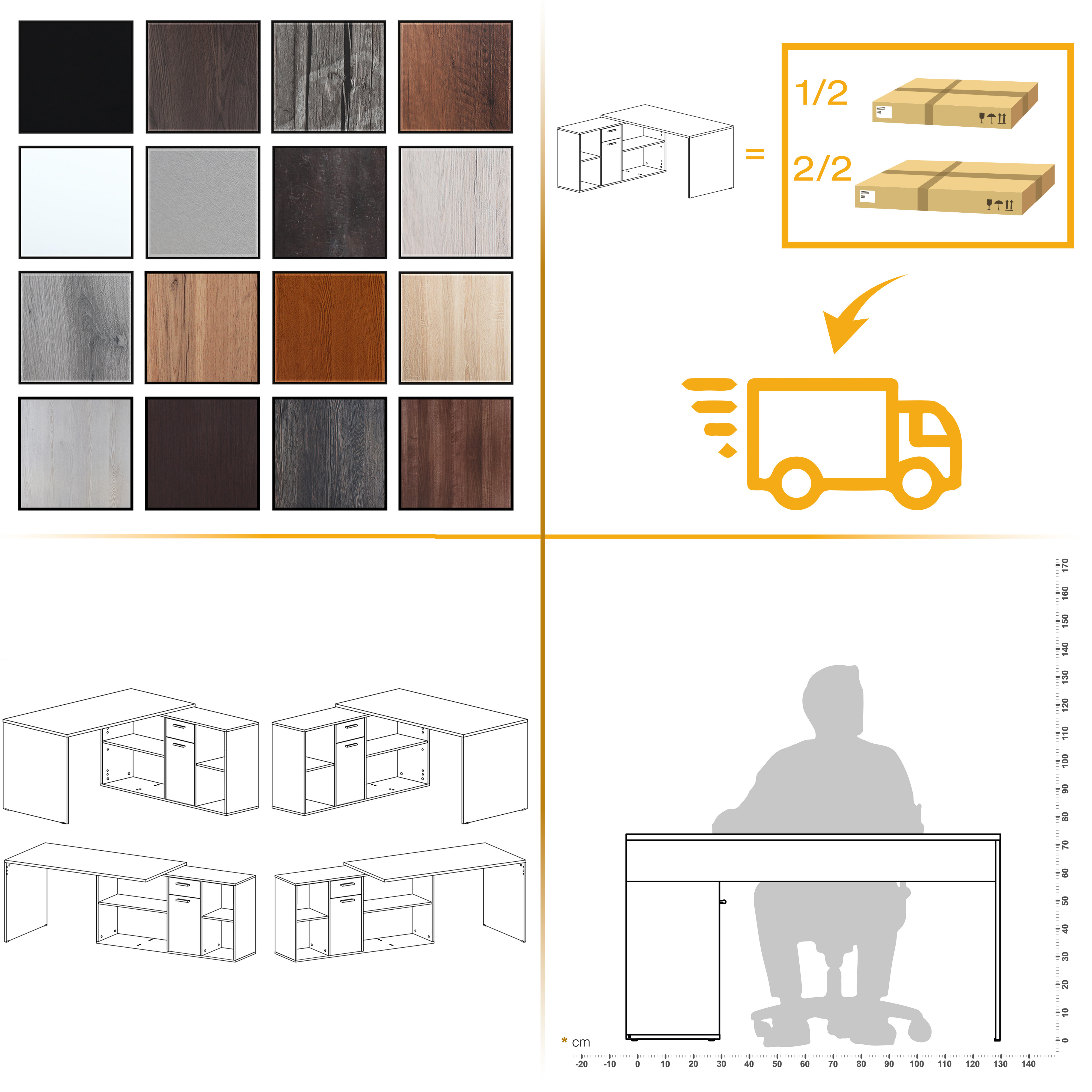Setzen Sie diesen beidseitig anschlagbaren Schreibtisch bei Bedarf gewinkelt oder ausgestreckt in Ihren Wohnraum, ins Kinderzimmer oder in Ihr Büro. Hochbeständiges, melaminbeschichtetes Holz liefert qualitative Standfestigkeit und Materialbeständigkeit. Harmonische Farbe verleiht Ihren Räumen wohlige Behaglichkeit. Ob als Bürotisch, Wohnzimmertisch, Kinderzimmertisch, Schminktisch, Verkaufstisch oder als kreative Gestaltungsecke - Mit diesem Schreibtisch liefern Sie sich praktisch moderne Funktionalität ins Haus!