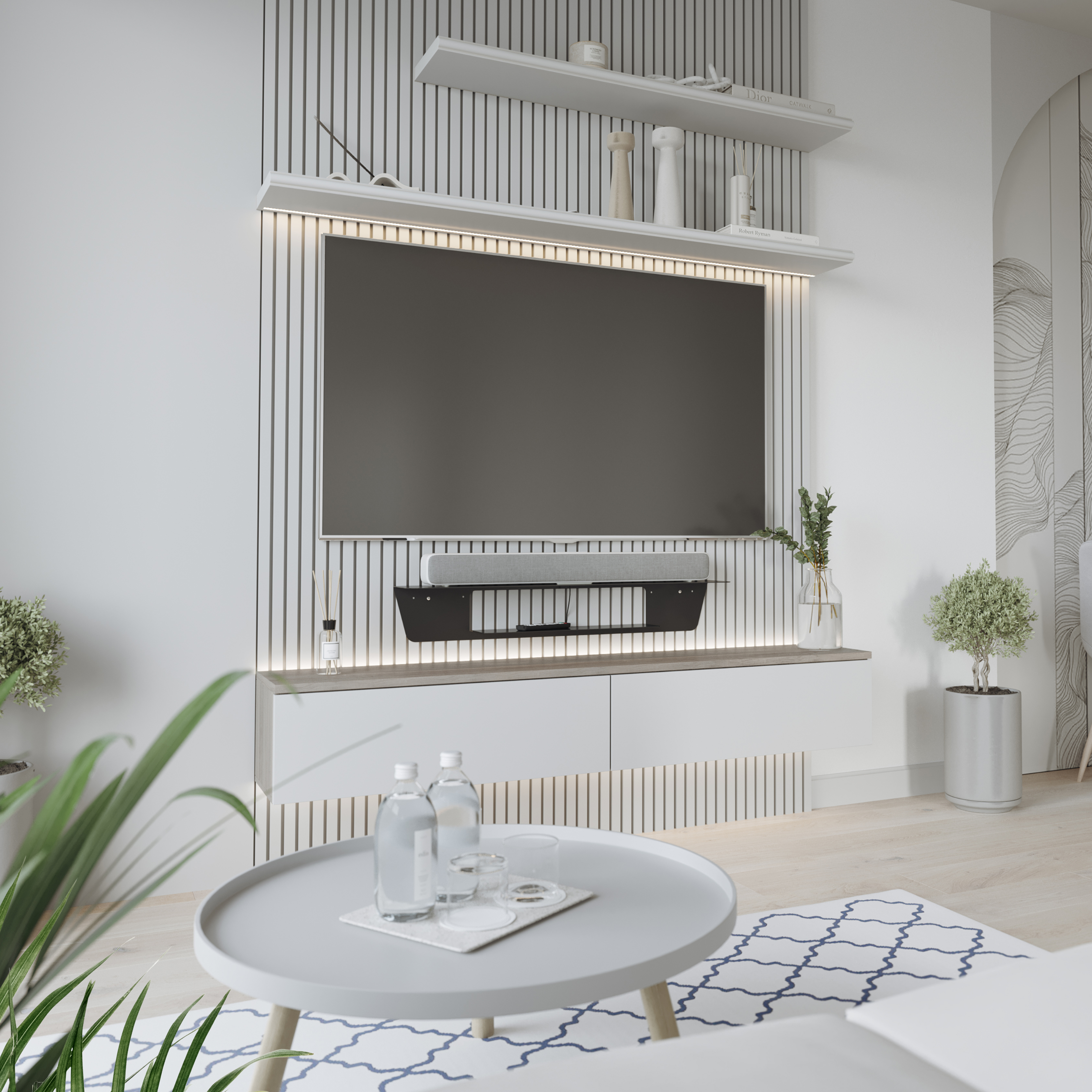 Mit dieser stabilen Wandhalterung aus Stahl können Sie Ihre Soundbar platzsparend und sicher an die Wand hängen und verleihen Ihrem Heimkino Ordnung.