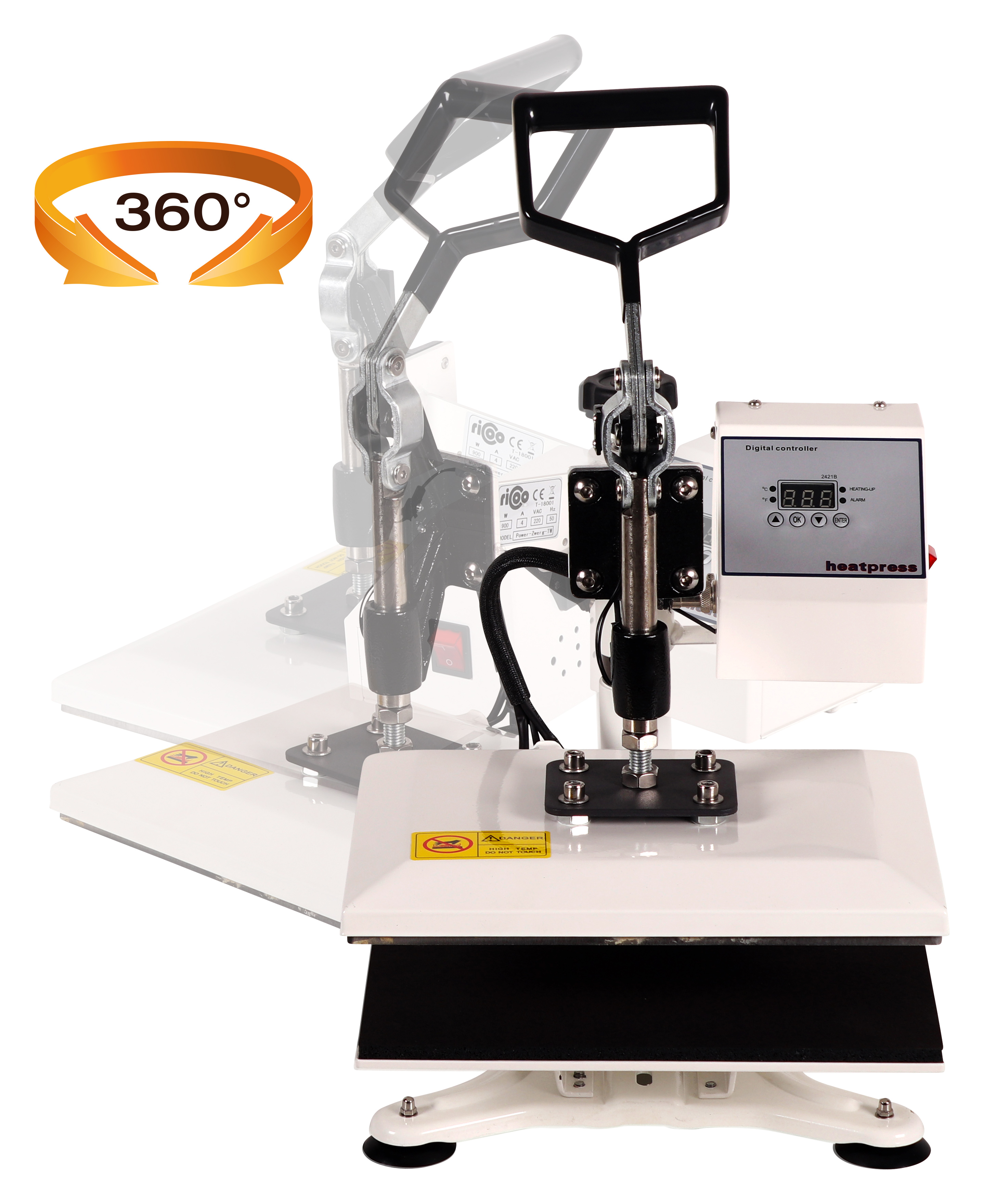 Dieser Ricoo Power-Zwerg ist die professionelle Textil- und T Shirt Druckmaschine / Textilpresse für Druckformate bis 300x230mm. Aufgrund der kompakten Größe ist die transportfreundliche, schwenkbare Transferpresse für Messen, Ausstellungen und weitere Anlässe außer Haus geeignet.