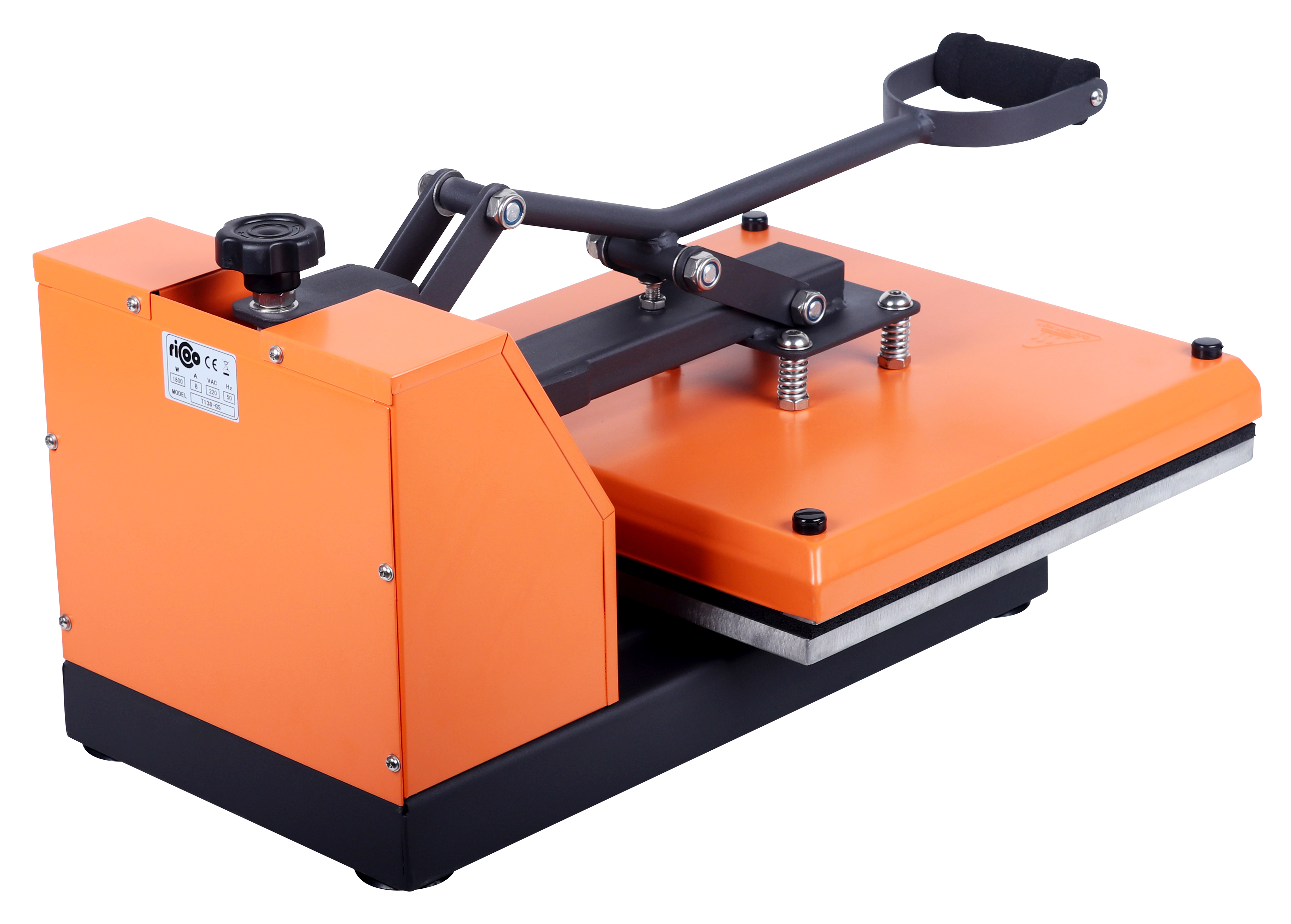 Die Bedruckmaschine weist einen stabilen Rahmen mit Korrosionsschutz, eine edle Lackierung und eine in der Höhe verstellbare Heizplatte auf. Die Temperatur und die Druckzeit sind digital gesteuert und lassen sich individuell am Gerät einstellen.