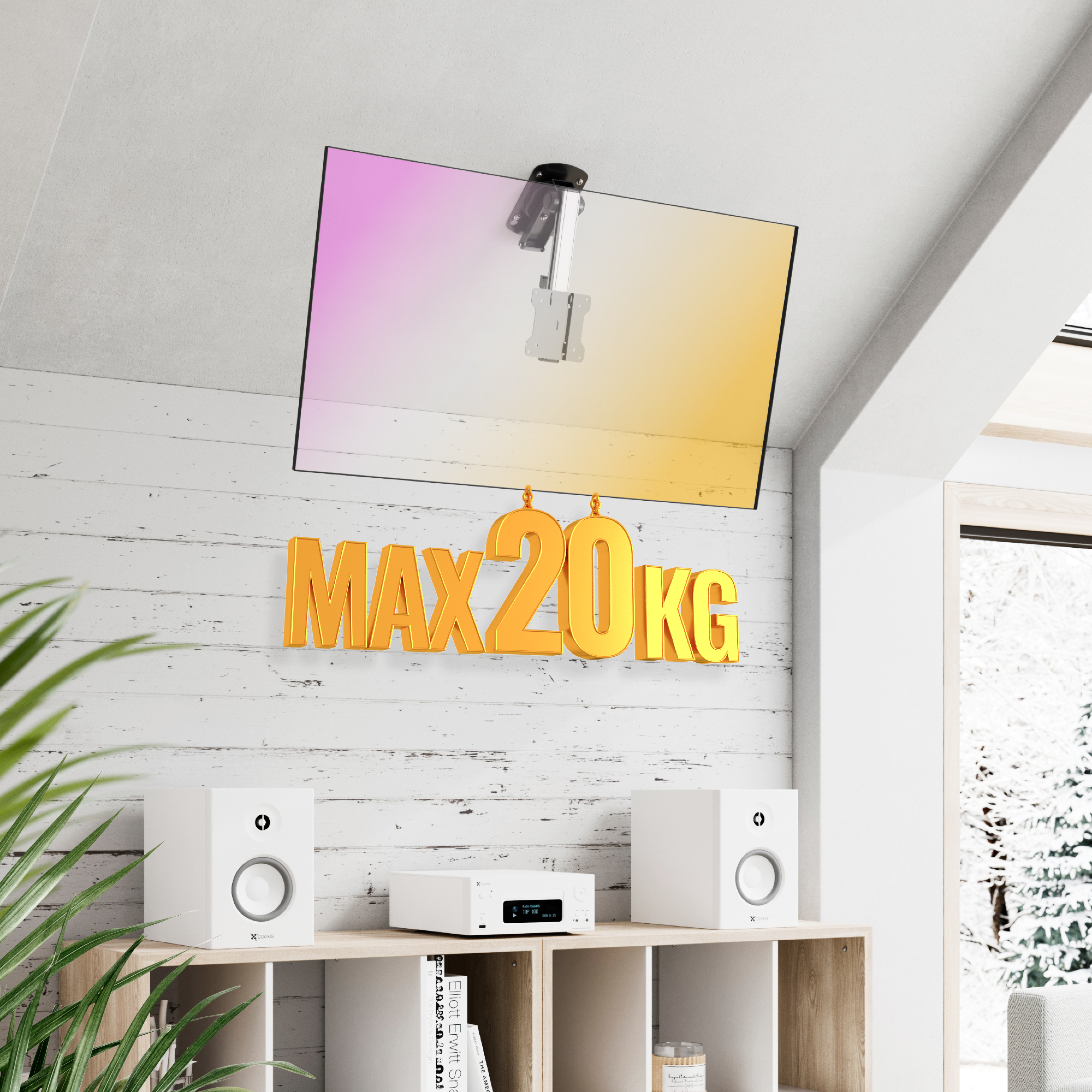 20 Kg trägt der Fernseher Deckenhalter mit ca. 13 - 33" gefestigt an der Wand. Die VESA-Muster sind die wichtigsten Indikatoren, dass TV Halterung und Gerät zusammenpassen. Das Design ist angenehm konzipiert und passt somit wunderbar in jedes Schlaf- und Wohnzimmer.