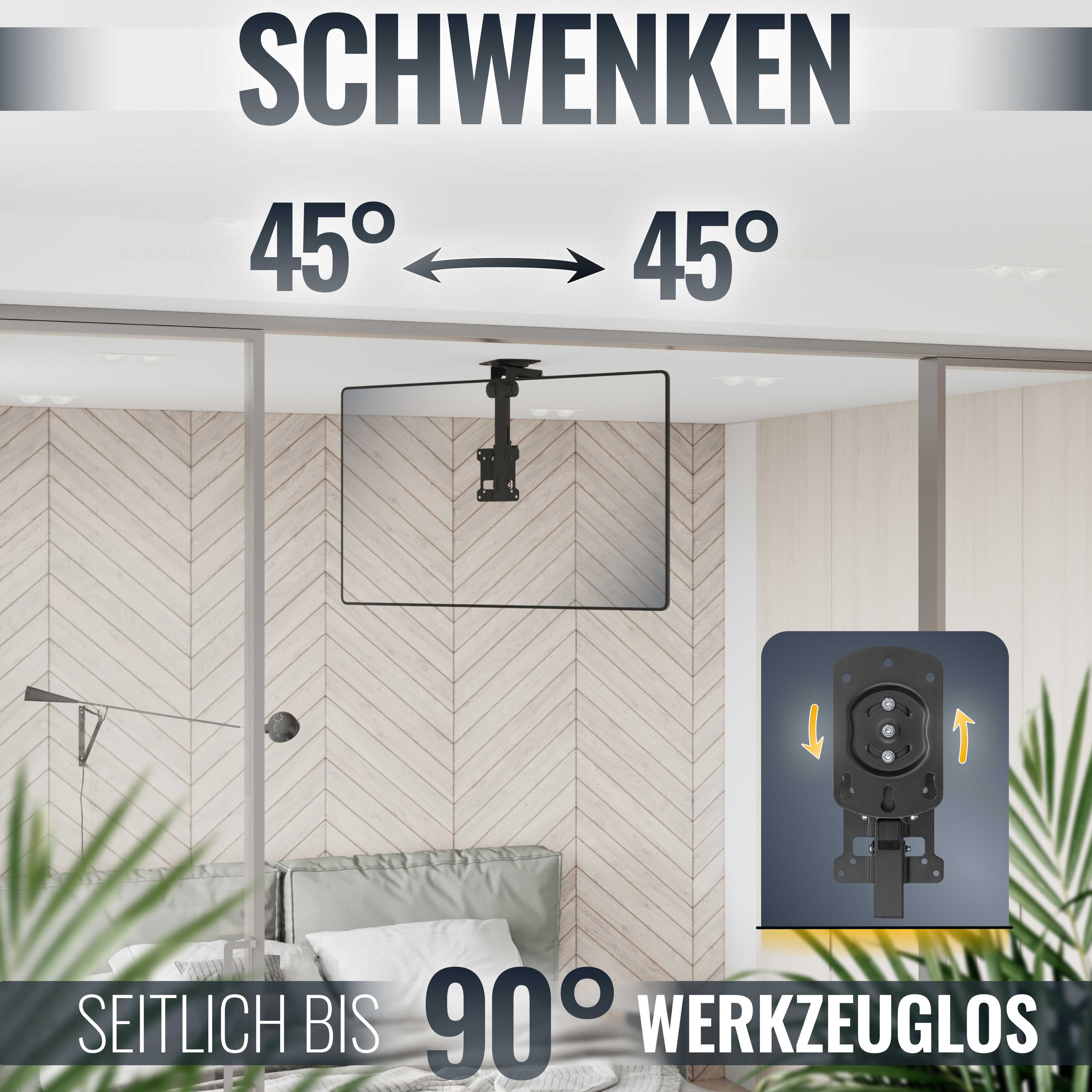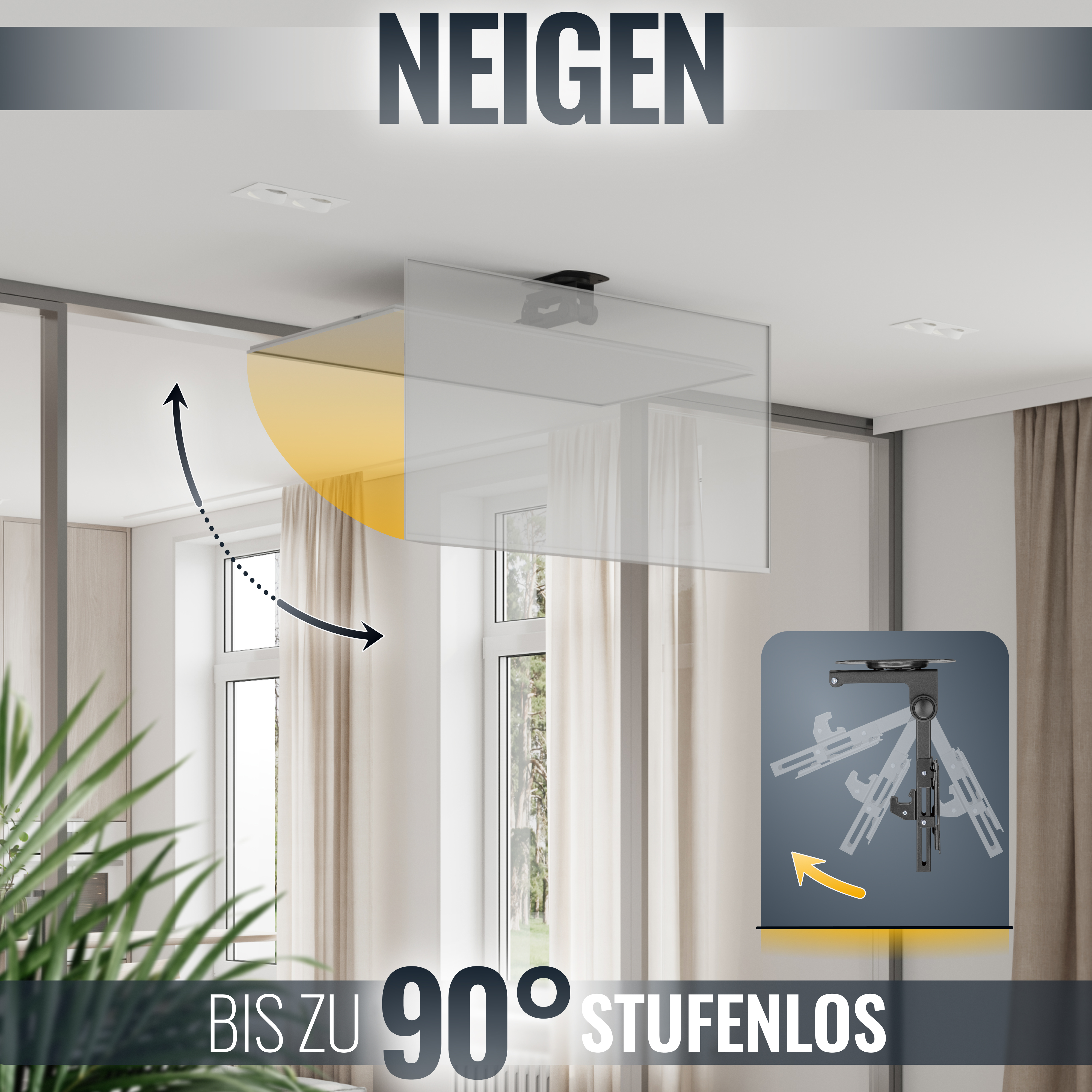 Machen Sie es sich mit diesem TV Deckenhalter in Ihrem Schlafzimmer gemütlich. Die Halterung ist zwischen und bis zu 90° ausklappbar und an der Frontplatte höhenverstellbar (volle 90° nur bei TVs mit max. 44cm Gerätehöhe und mittiger Anbringung der Frontplatte an der Bildschirm-Rückseite). Man kann den Deckenhalter auch im eingeklappten Zustand einrasten. Den Neigewinkel ziehen Sie an der Feststellschrauben fest. Daher ist sie auch für Dachschrägen ideal.