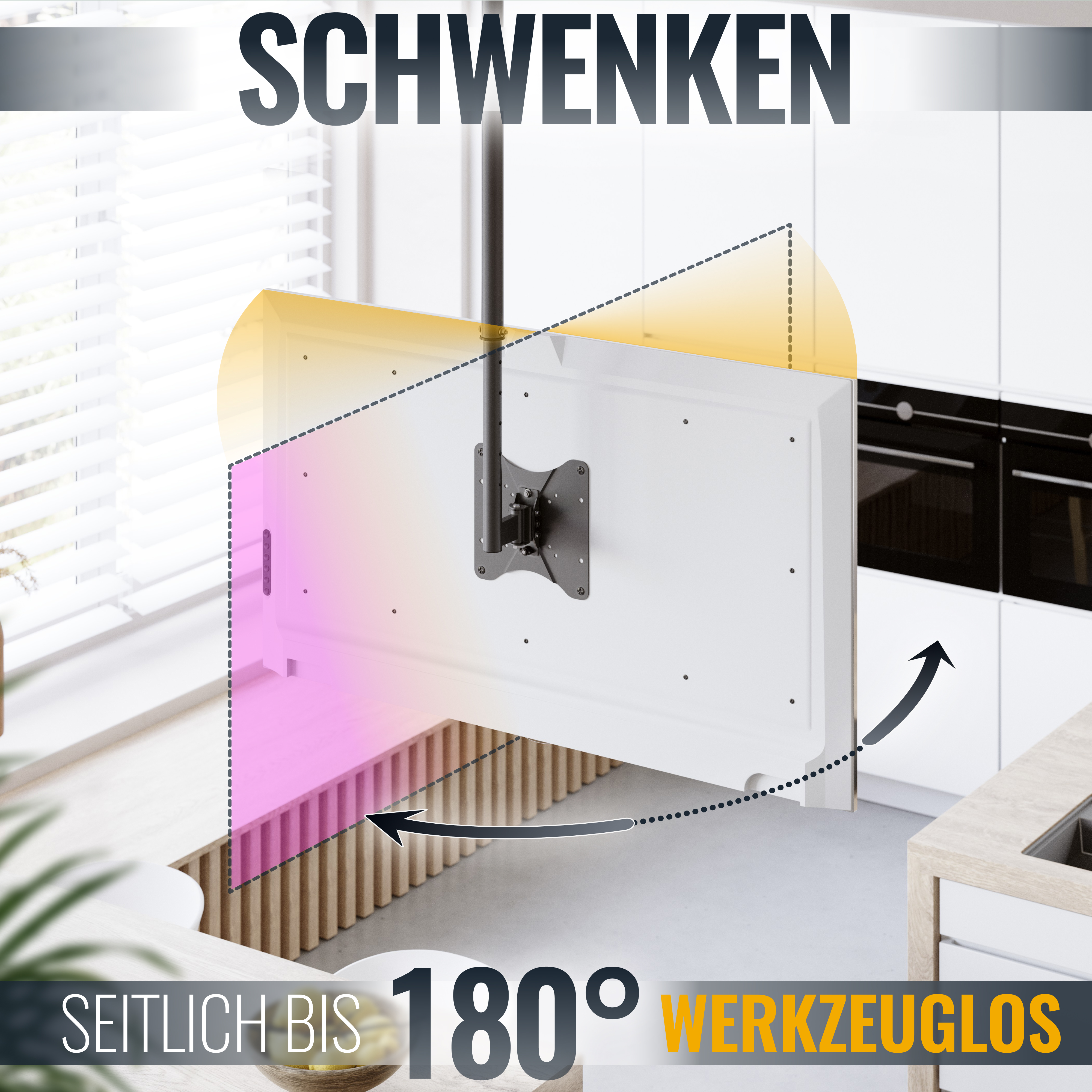 Mit +/-90° Schwenkbarkeit des Bildschirms in verschiedene Raum-Richtungen, je nach Bereichsmontage. Schwenken Sie Filme, Games & Info-Medien mit einem Handgriff auf Ihre Wunsch-Schauplätze.