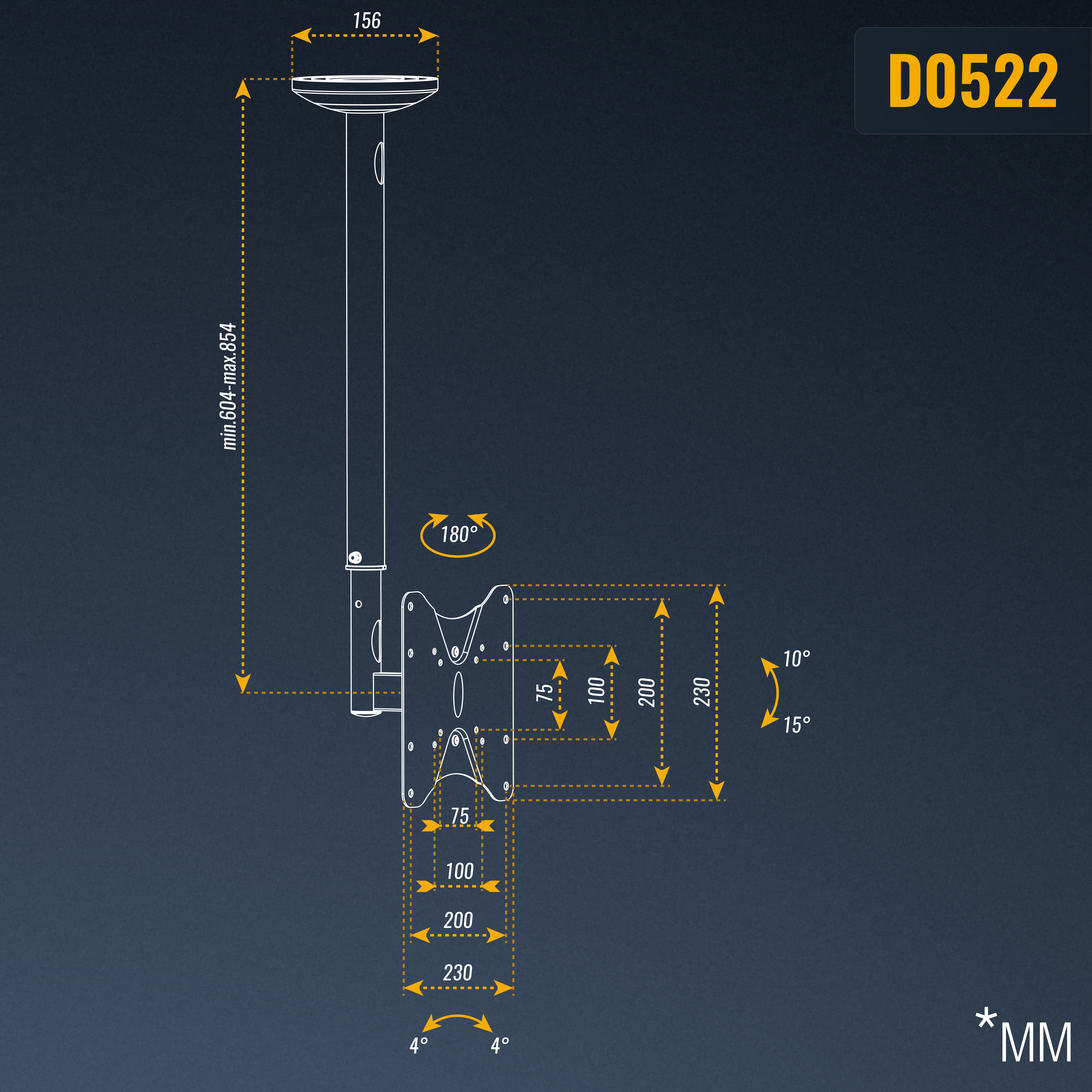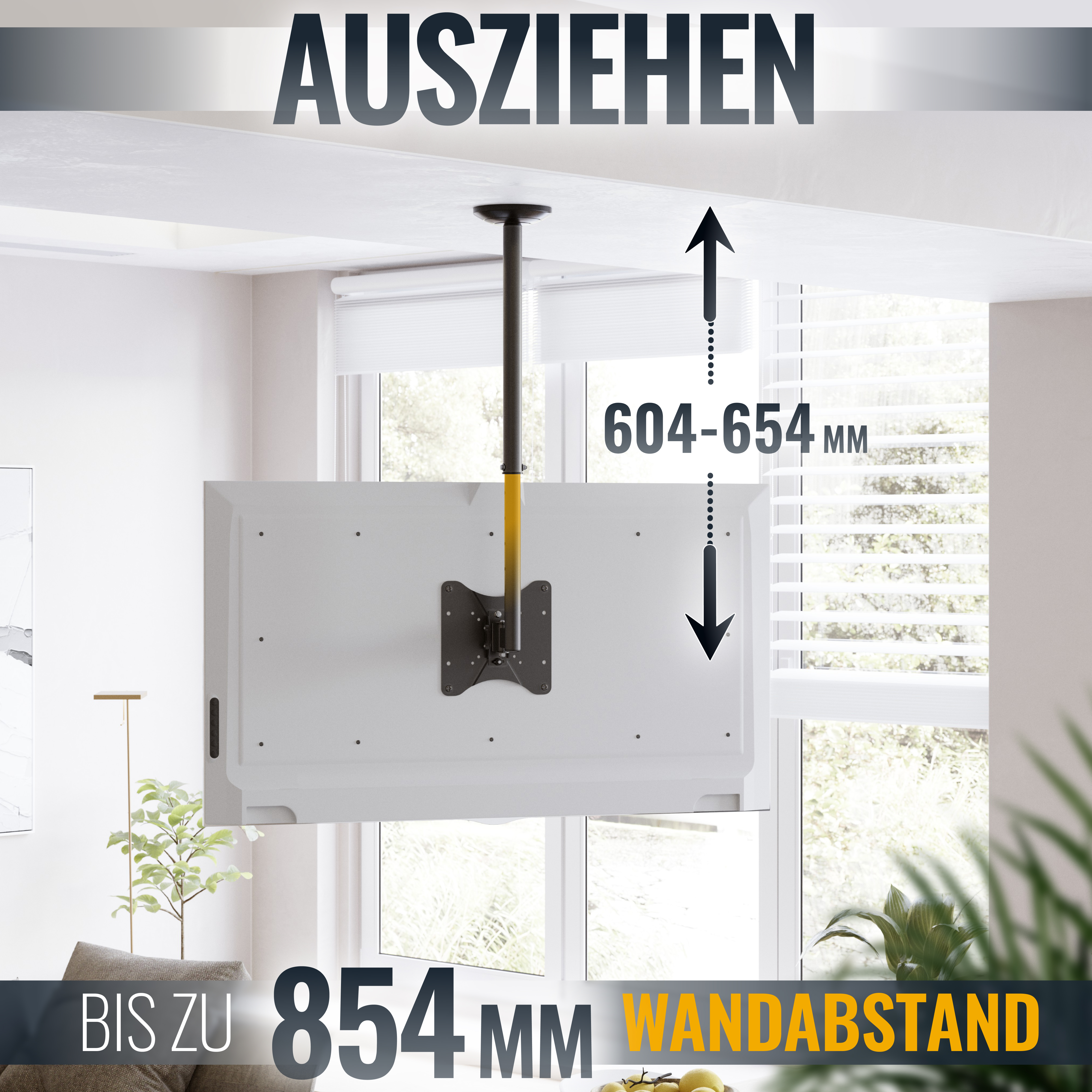 Höhenverstellbarkeit der Aufnahmeplatte anhand des Teleskop-Rohrs zwischen 604mm – 854mm stufenweise für die passende Deckendistanz.