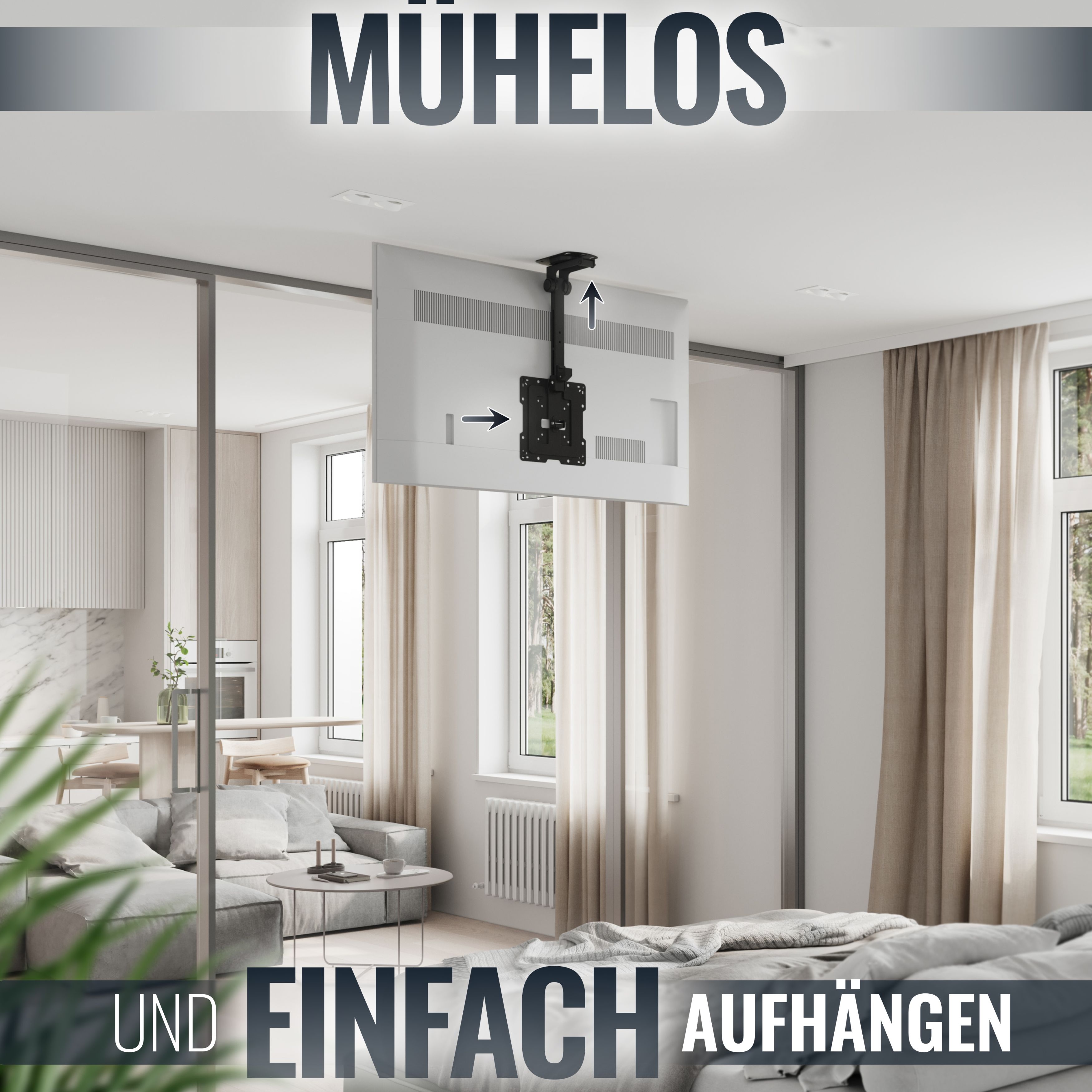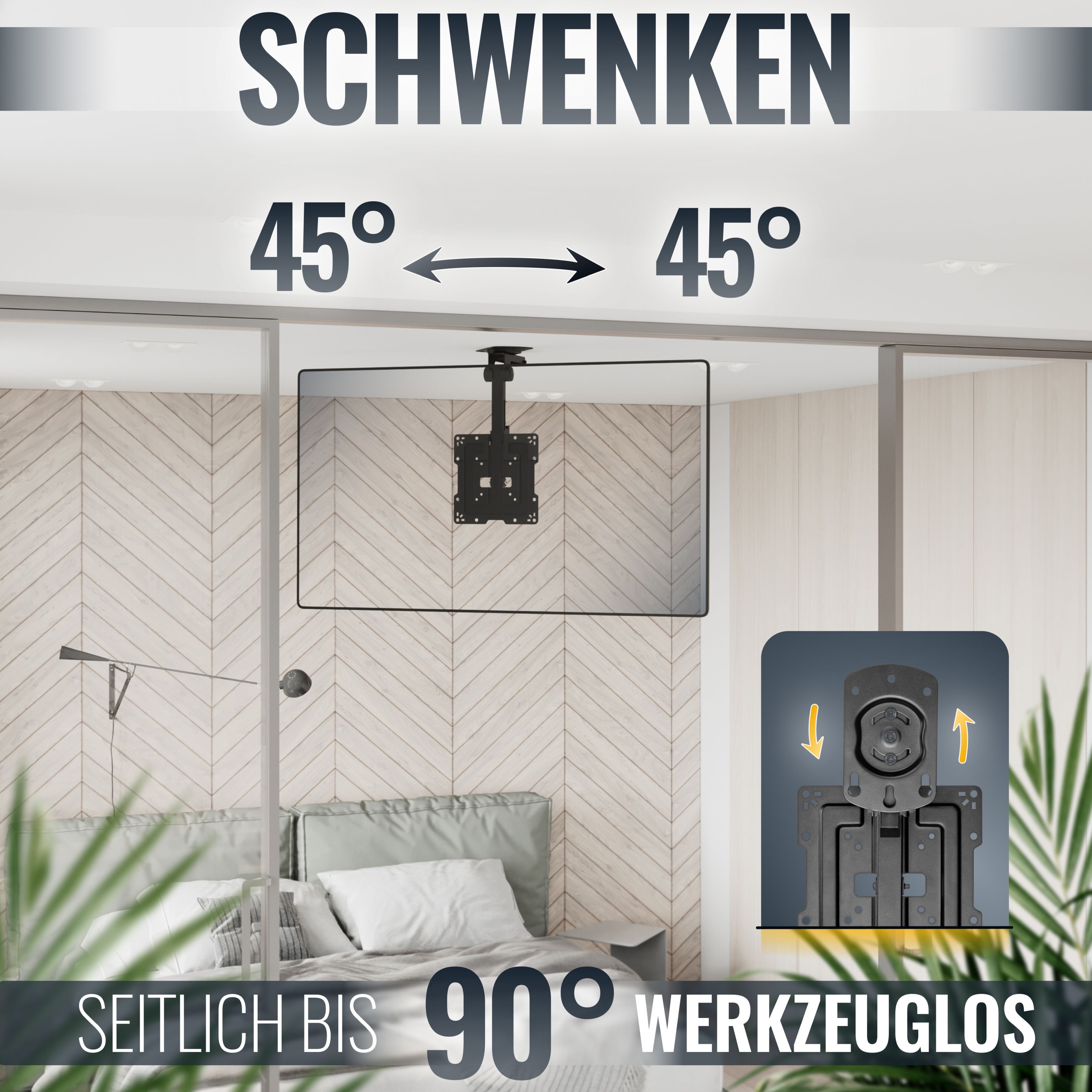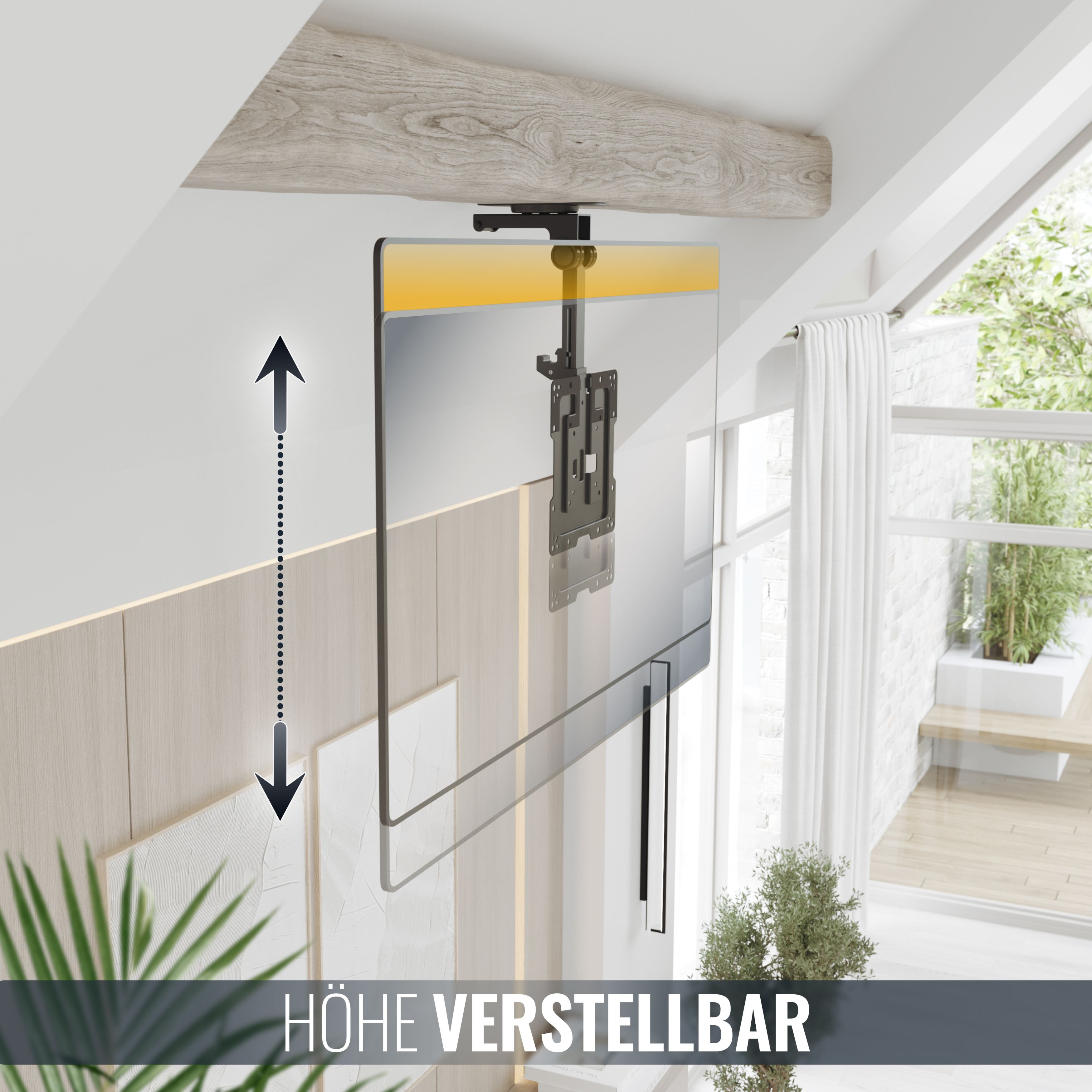 Mit diesem TV Deckenhalter spendieren Sie sich und Ihrem Partner, Ihren Gästen oder Kunden eine abwechslungsreiche Unterhaltungsmöglichkeit. Sei es vor dem Schlafengehen, in einem Wartebereich oder in Ihrem Lokal.