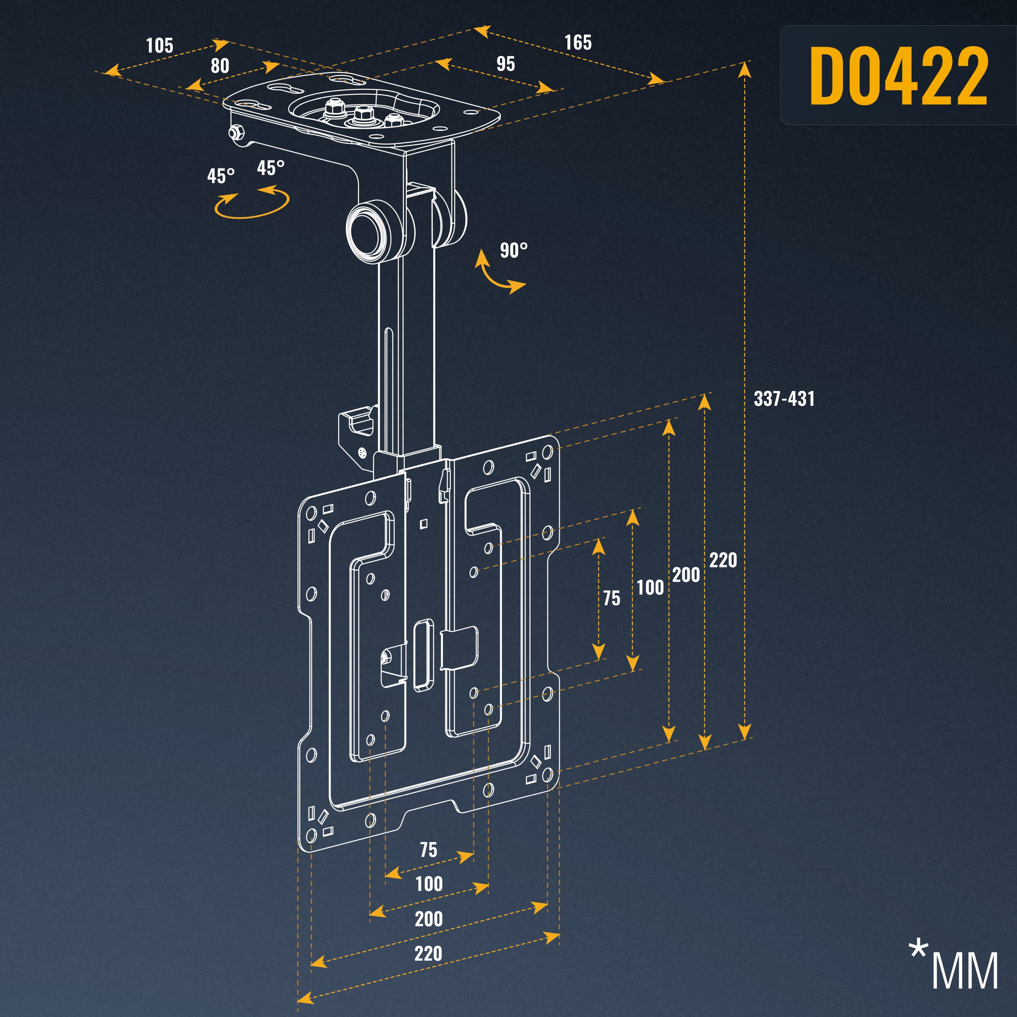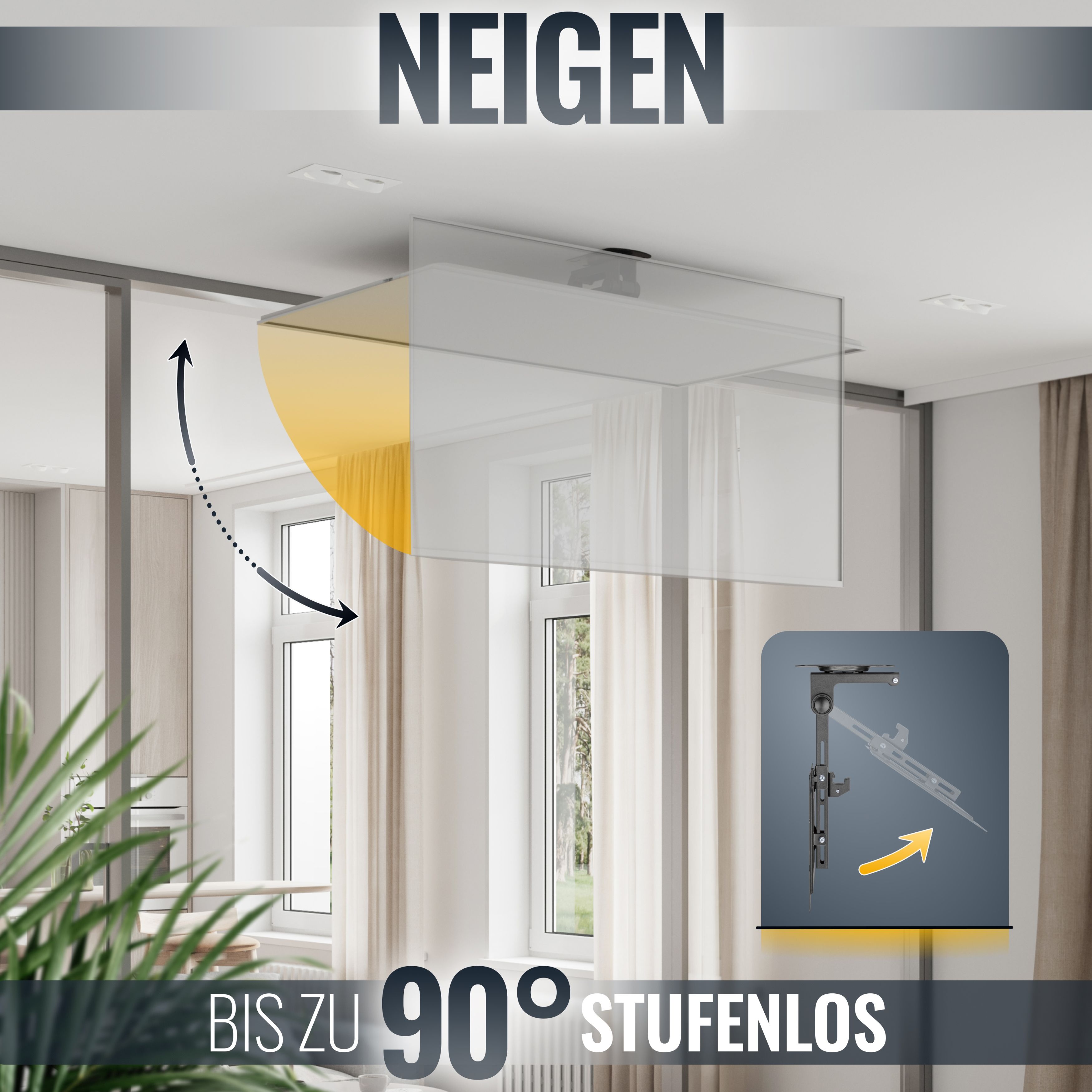 • stufenlos ein- / ausklappbar von 0° bis 90° (volle 90° nur bei TVs mit max. 55cm Gerätehöhe und mittiger Anbringung der Frontplatte an der Bildschirm-Rückseite)