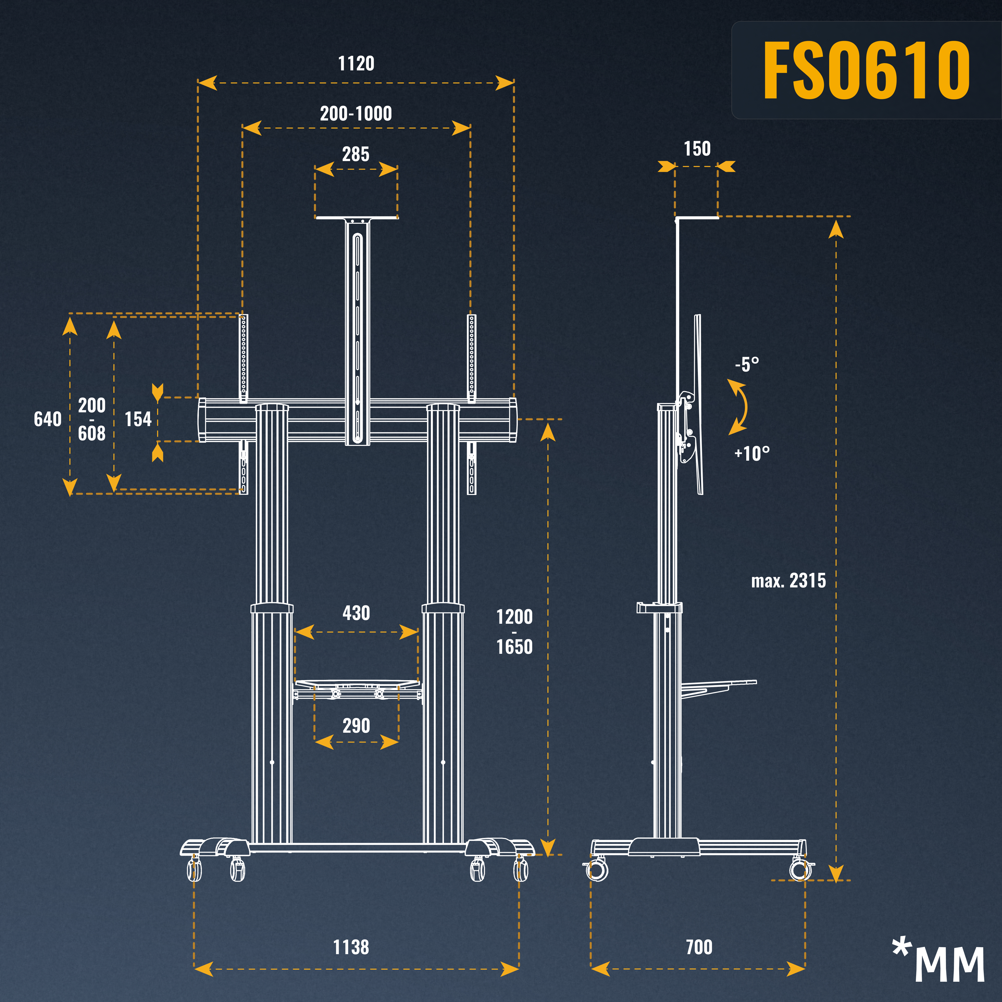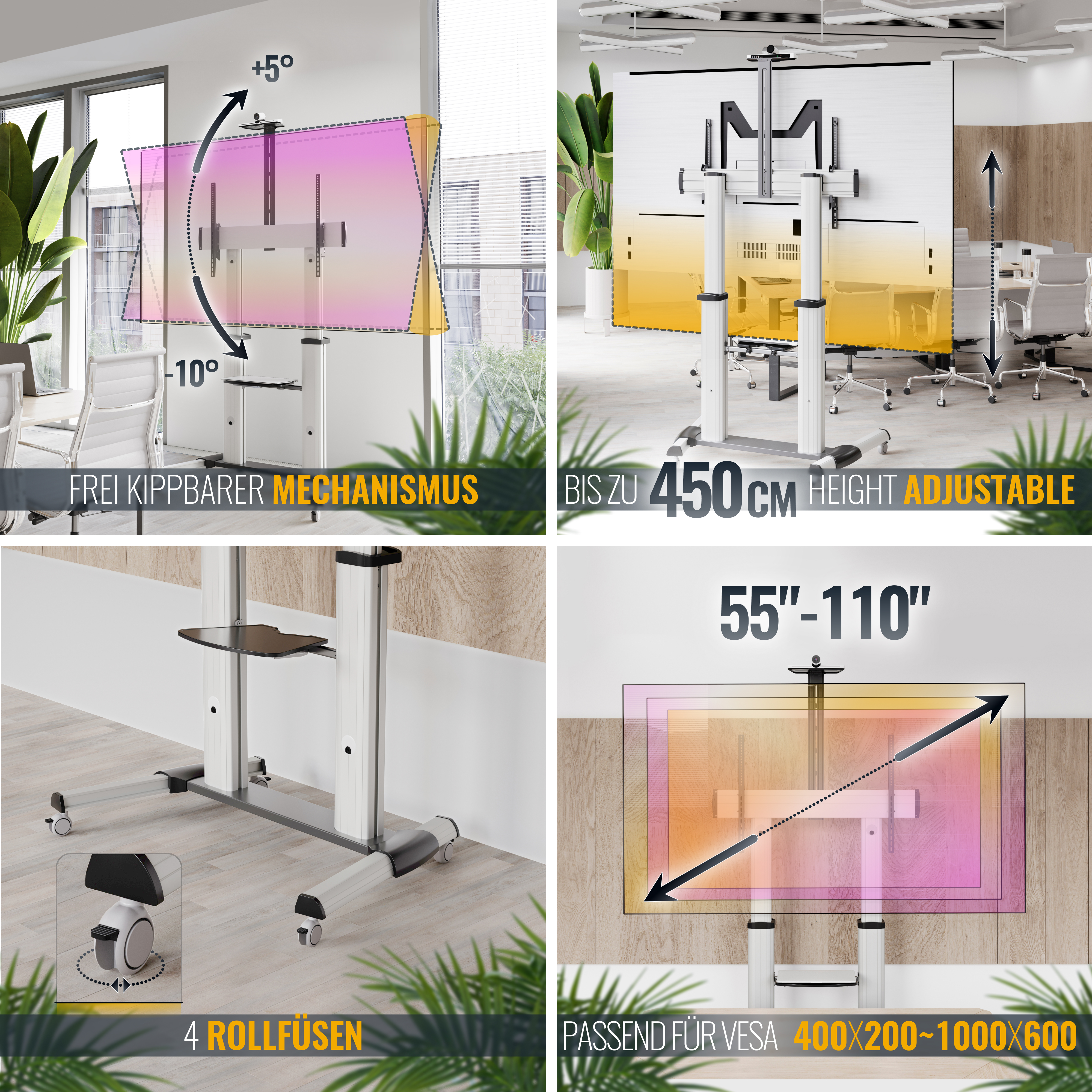 Mit diesem Fernseher- und Monitor-Rollwagen fahren Sie auch schwere Geschütze bis zu 100 Kg stabil durch die Räumlichkeiten. Das flexibel arretierbare Kamera-Board und das ebenso flexible mittlere Ablage-Regal tragen je 5 Kg. Anhand der TV-Aufnahmeplatte neigen Sie Ihren Bildschirm bis zu +10 und -5° hinauf und hinab. In der Höhe verstellen Sie Ihren Bildschirm bei Bedarf um bis zu 450mm anhand der Säulen. So wird das Fernsehen und Bildbetrachten für Sie und Ihre Kunden aus allen Betrachtungs-Positionen effektiv und gemütlich. Durch die Rollfüße schwenken Sie den TV-Wagen jederzeit flexibel in alle Richtungen.