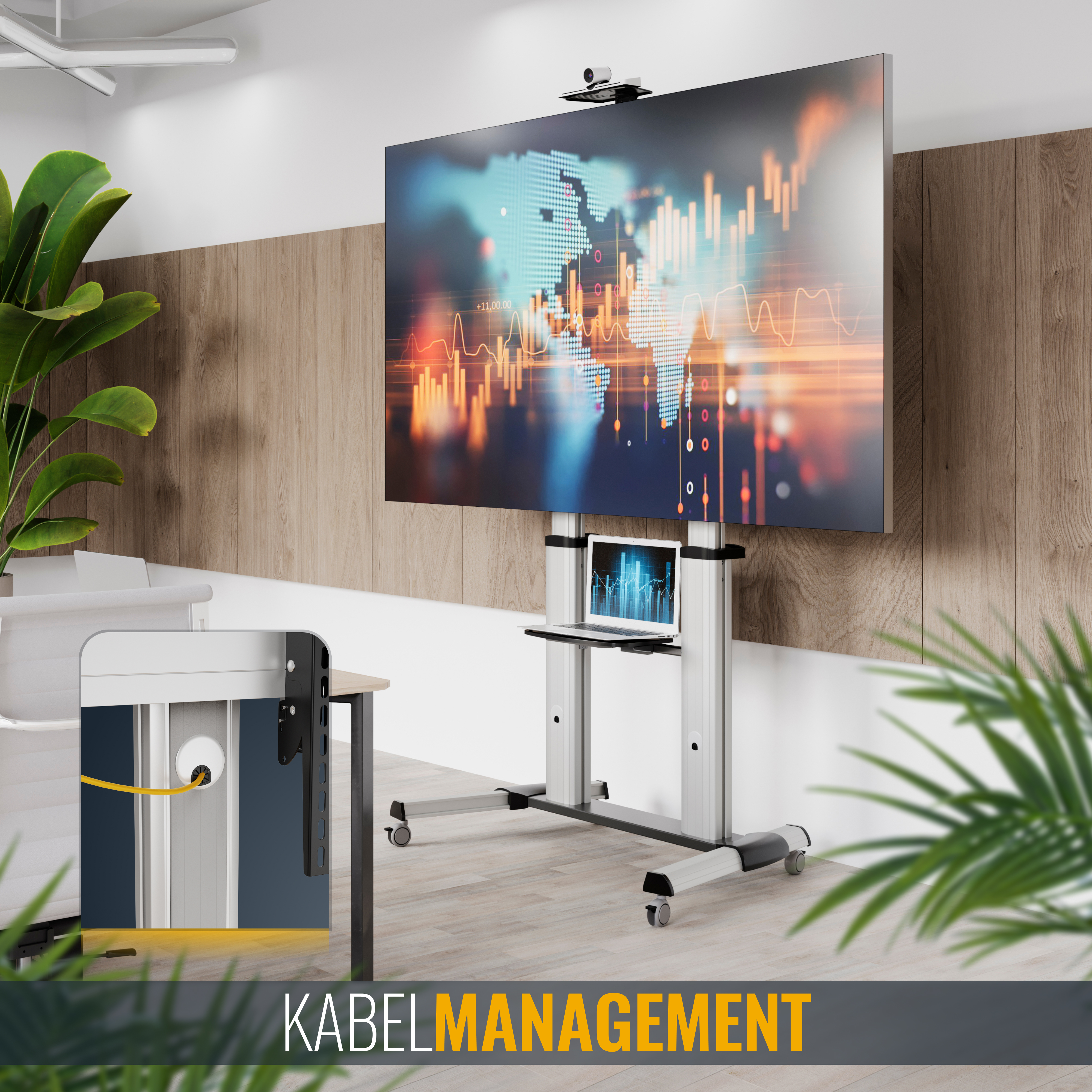 Diesen Rollwagen bringt so leicht nichts aus der Fassung. - 100 Kg Tragkraft gepaart mit VESA-Qualität aller Normen zwischen 400x200mm und 1000x600mm halten Ihren TV oder Monitor stabil in Stand und Fahrt. So passen bei kompatibler Kabelausgangs-Situation verschiedene Bildschirme an diesen Standfuß, wie zum Beispiel Ihr nächster. Anhand der Schienen hängen Sie Ihren Bildschirm jederzeit einfach aus aus dem Rollwagen ein und aus. Das integrierte Kabelmanagement rundet die gelungene Darstellung ab.