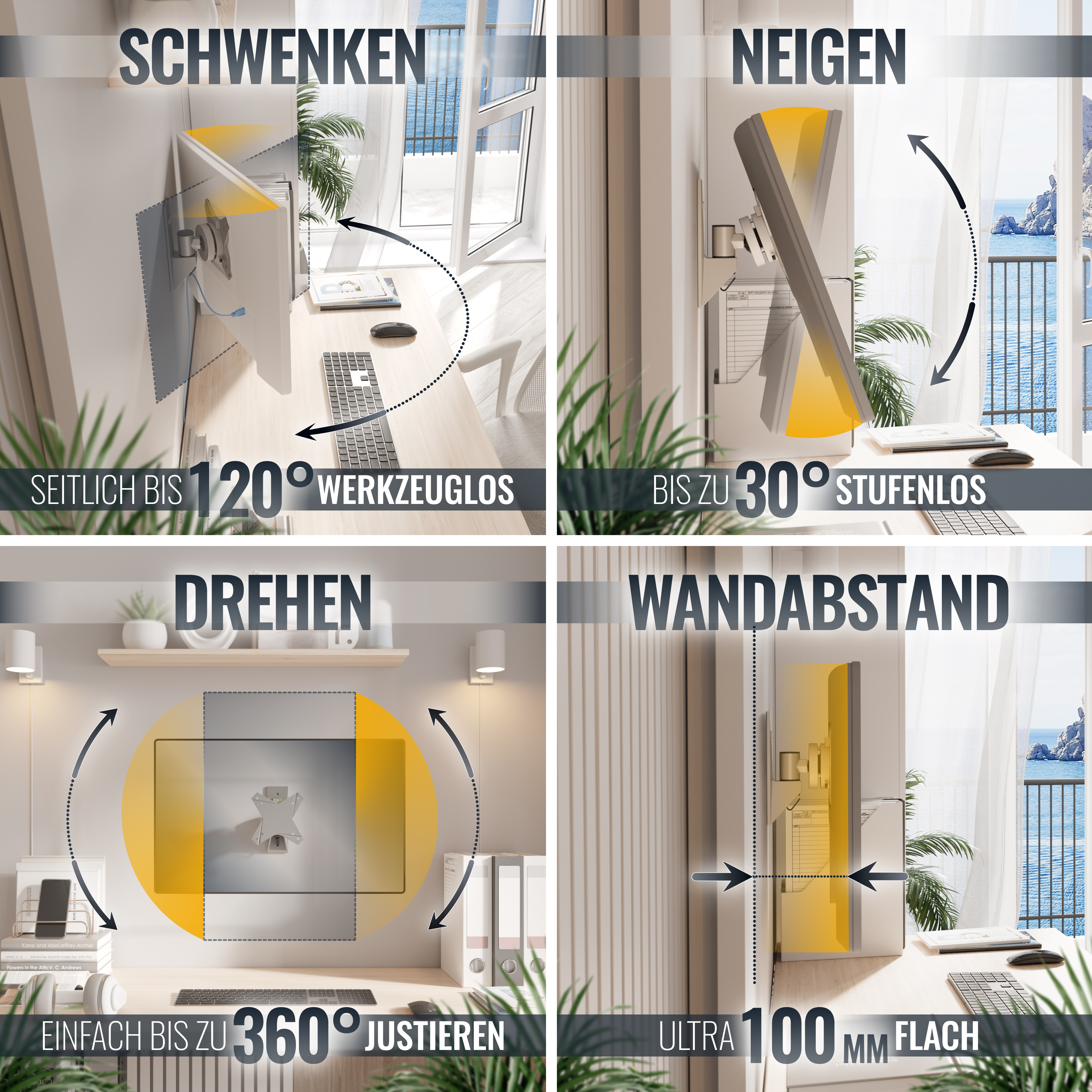 Mit der 360° Rotierungsmöglichkeit stellen Sie die Bildschirmposition optimal auf Ihre aktuellen Bedürfnisse ein und mit einem Griff wieder zurück. Die schmale Wandmontage-Platte ermöglicht Anbringung bei wenig Wandplatz. So können Sie sie quasi auch waagerecht anbringen, denn drehen können Sie das Bild entsprechend.