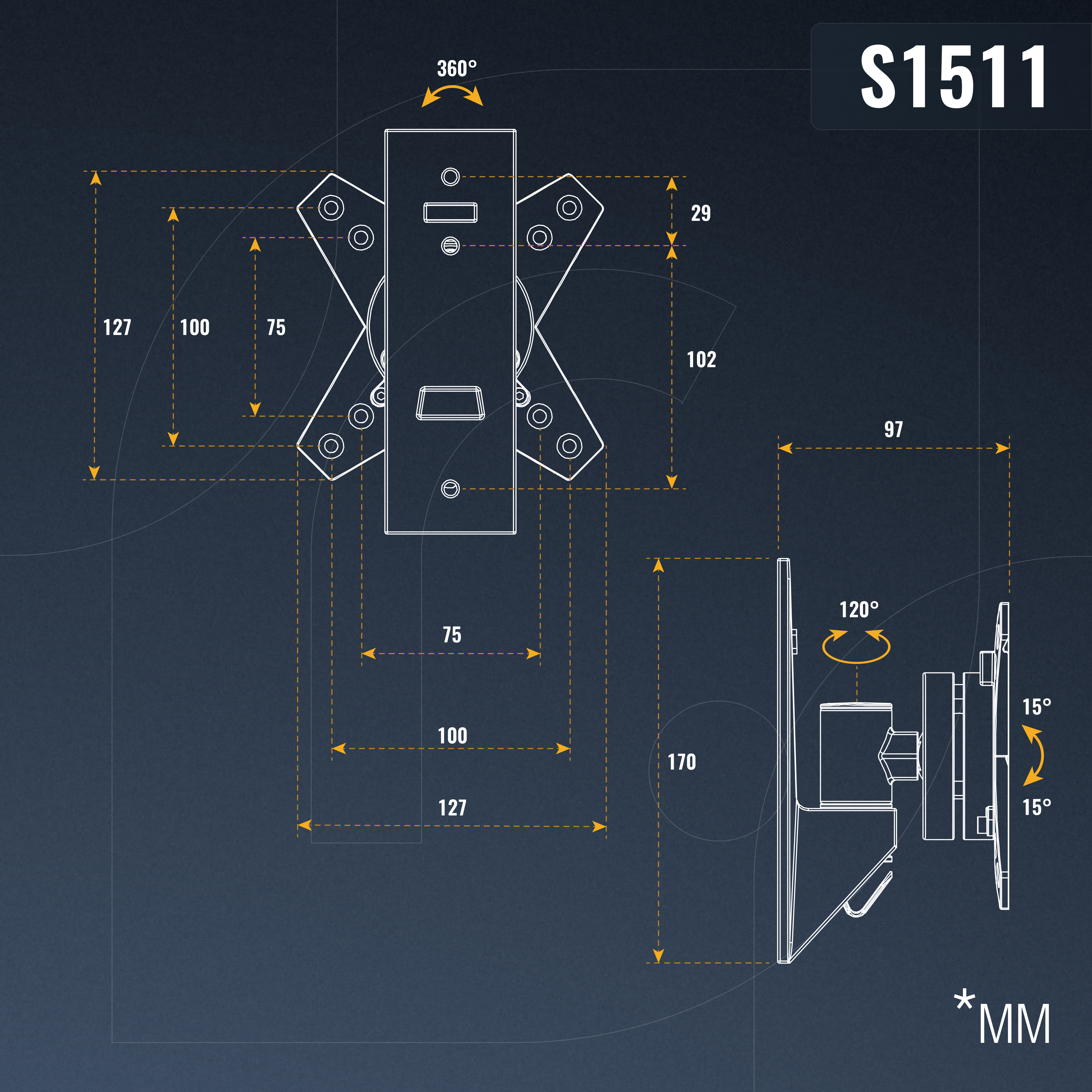 Im Vergleich zur S1522-Halterung verfügt dieser LCD LED TV Wandhalter über eine kleinere Frontplatte mit entsprechend kleineren VESA-Maßen und einer Tragkraft bis 15 Kg, wodurch sich die Schwenkweite von 120° ergibt. Damit schwenken Sie ca. 13 - 29 Zoll nützlich von der Kochplatte zum Esstisch oder vom Schreibtisch zum Sofa. Neigen Sie mit dem Wandhalter Fernseh- oder Monitorgerät um +-15° zu sich herab auf das Bett oder hinauf bei tieferer Wandanbringung.