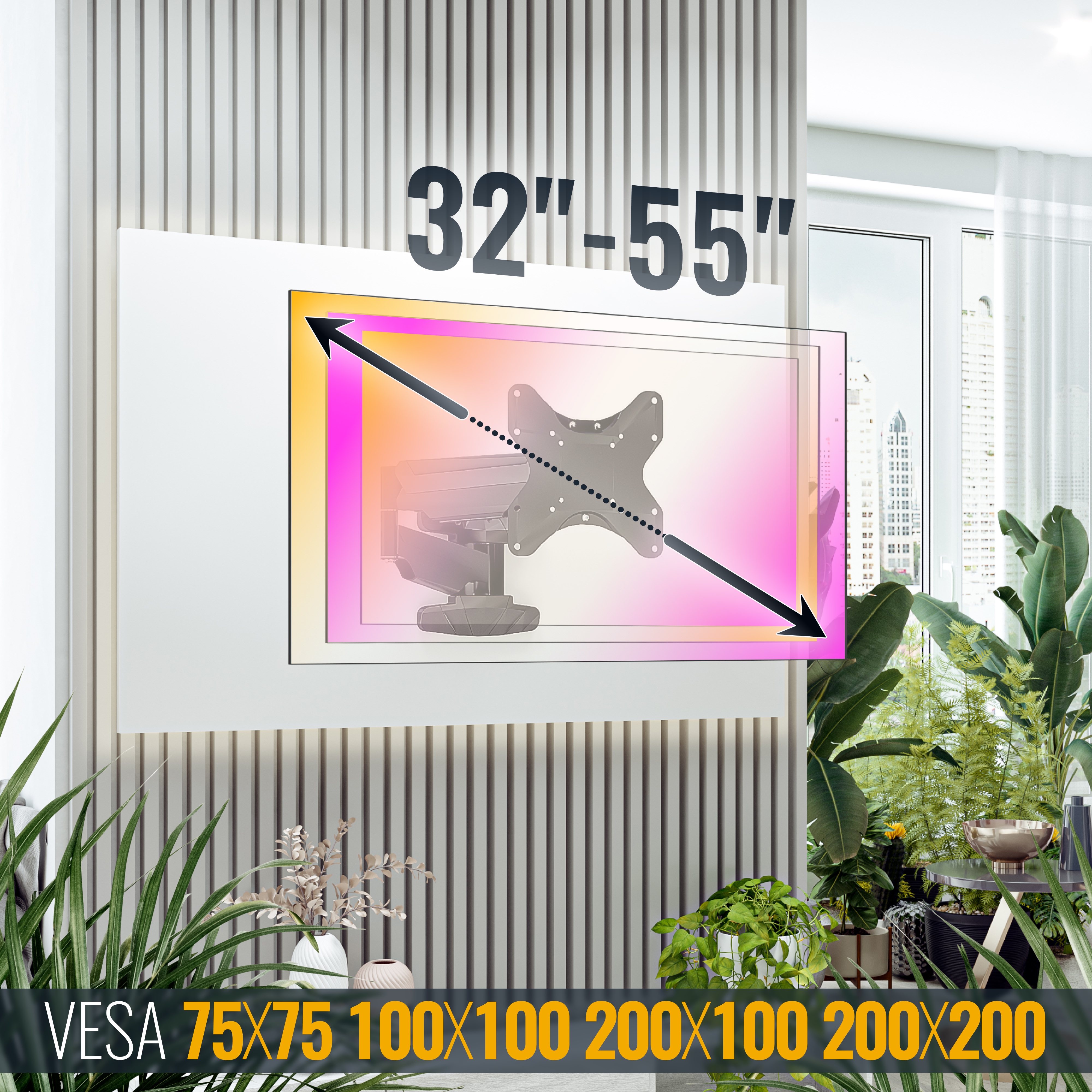 Alle Diagonalangaben in der Artikelbezeichnung/Beschreibung/Produktverpackung sind ungefähre Orientierungsangaben. Eine Bildschirmhalterung ist nicht nach einer Diagonale anzupassen, sondern nach sogenannter VESA-Norm (Lochabstände am Fernseher). Diese Halterung ist passend für kleinere oder größere Bildschirme als in der Produktbeschreibung / Bezeichnung angegebene Diagonale. Es muss nur gewährleistet sein, dass die Lochabstände in dem von der Halterung unterstützen Bereich liegen und das max. Belastungsgewicht der Halterung nicht überschritten wird.