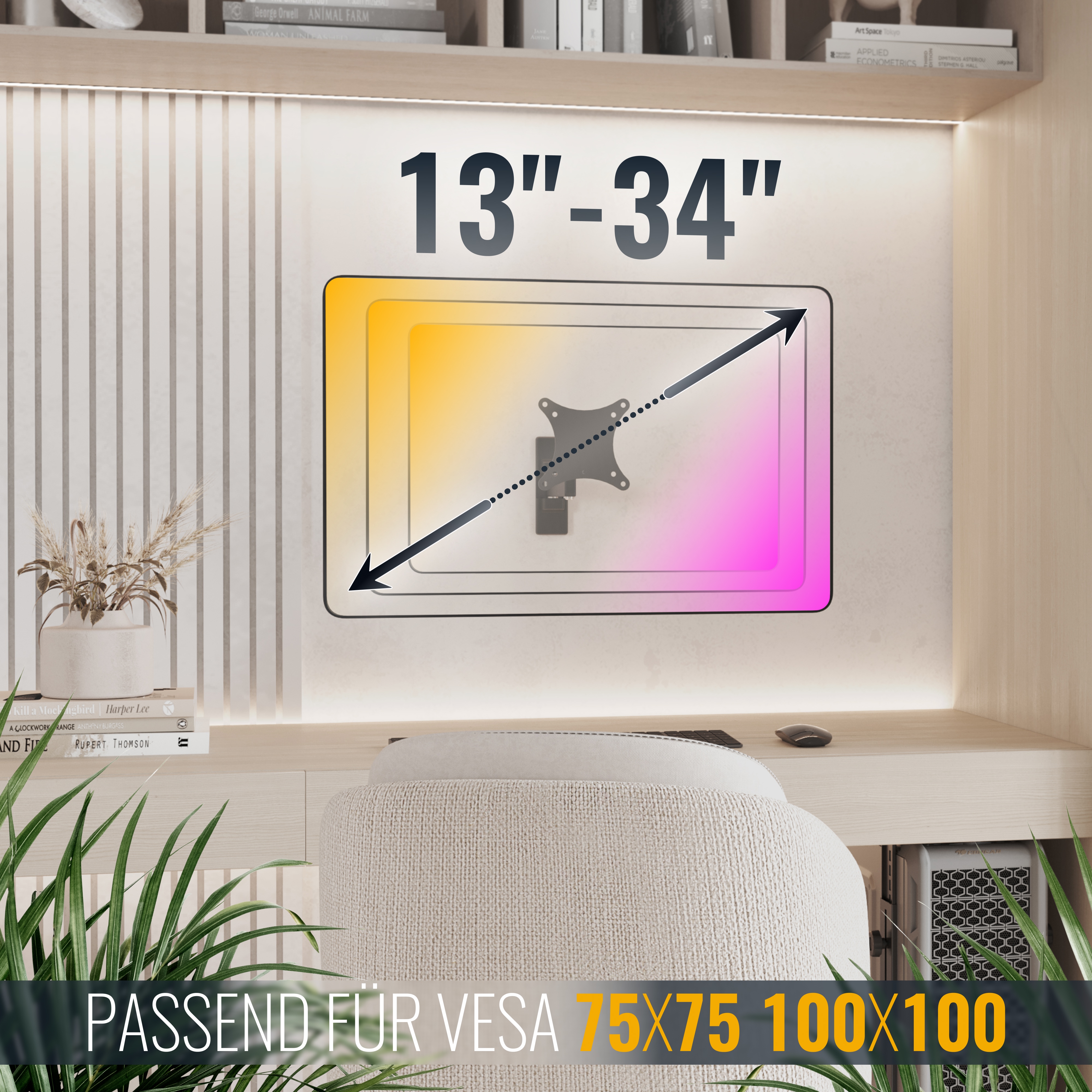 Alle Diagonalangaben in der Artikelbezeichnung/Beschreibung/Produktverpackung sind ungefähre Orientierungsangaben. Eine Bildschirmhalterung ist nicht nach einer Diagonale anzupassen, sondern nach sogenannter VESA-Norm (Lochabstände am Fernseher). Diese Halterung ist passend für kleinere oder größere Bildschirme als in der Produktbeschreibung / Bezeichnung angegebene Diagonale. Es muss nur gewährleistet sein, dass die Lochabstände in dem von der Halterung unterstützen Bereich liegen und das max. Belastungsgewicht der Halterung nicht überschritten wird.