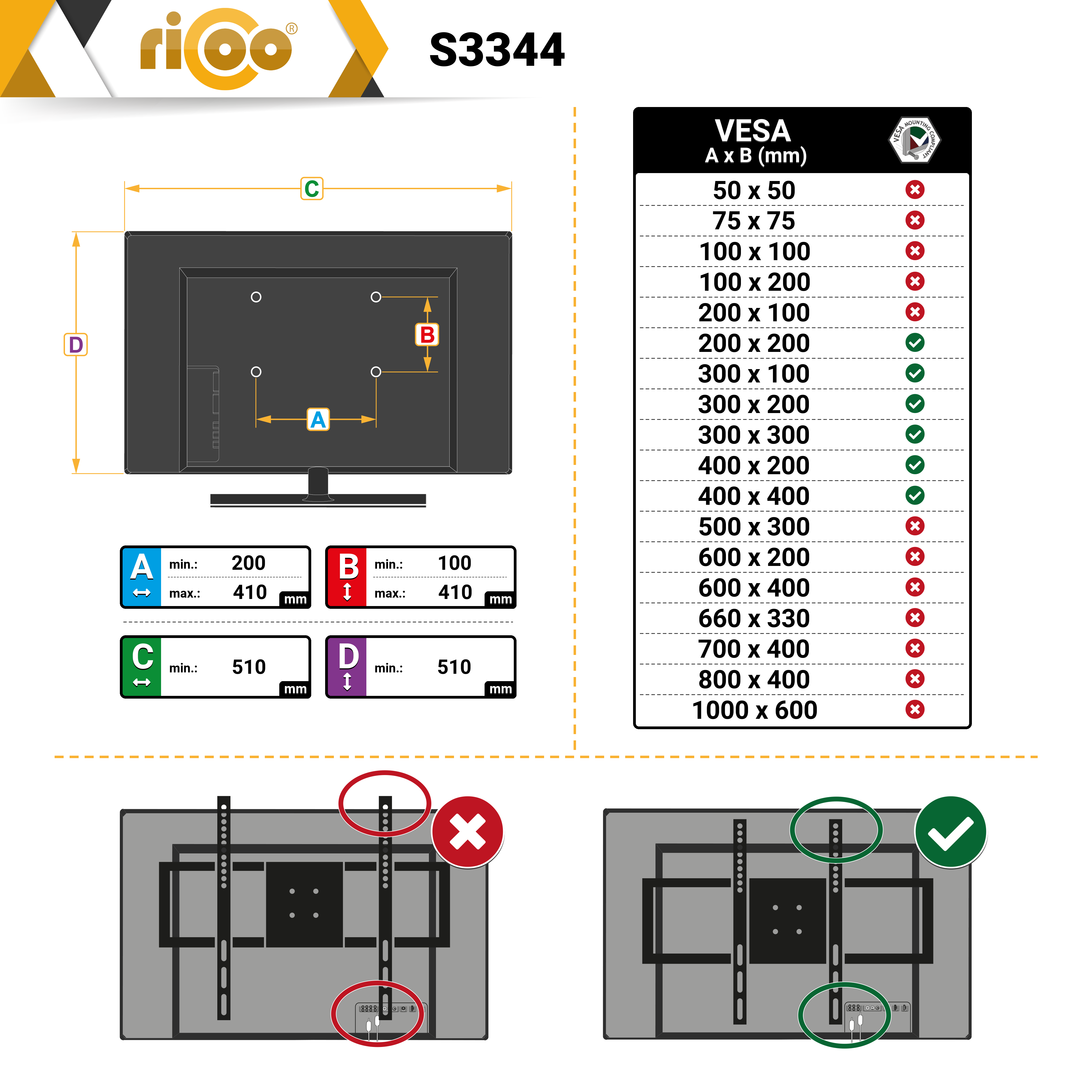 Alle Diagonalangaben in der Artikelbezeichnung/Beschreibung/Produktverpackung sind ungefähre Orientierungsangaben. Eine Bildschirmhalterung ist nicht nach einer Diagonale anzupassen, sondern nach sogenannter VESA-Norm (Lochabstände am Fernseher). Diese Halterung ist passend für kleinere oder größere Bildschirme als in der Produktbeschreibung / Bezeichnung angegebene Diagonale. Es muss nur gewährleistet sein, dass die Lochabstände in dem von der Halterung unterstützen Bereich liegen und das max. Belastungsgewicht der Halterung nicht überschritten wird.