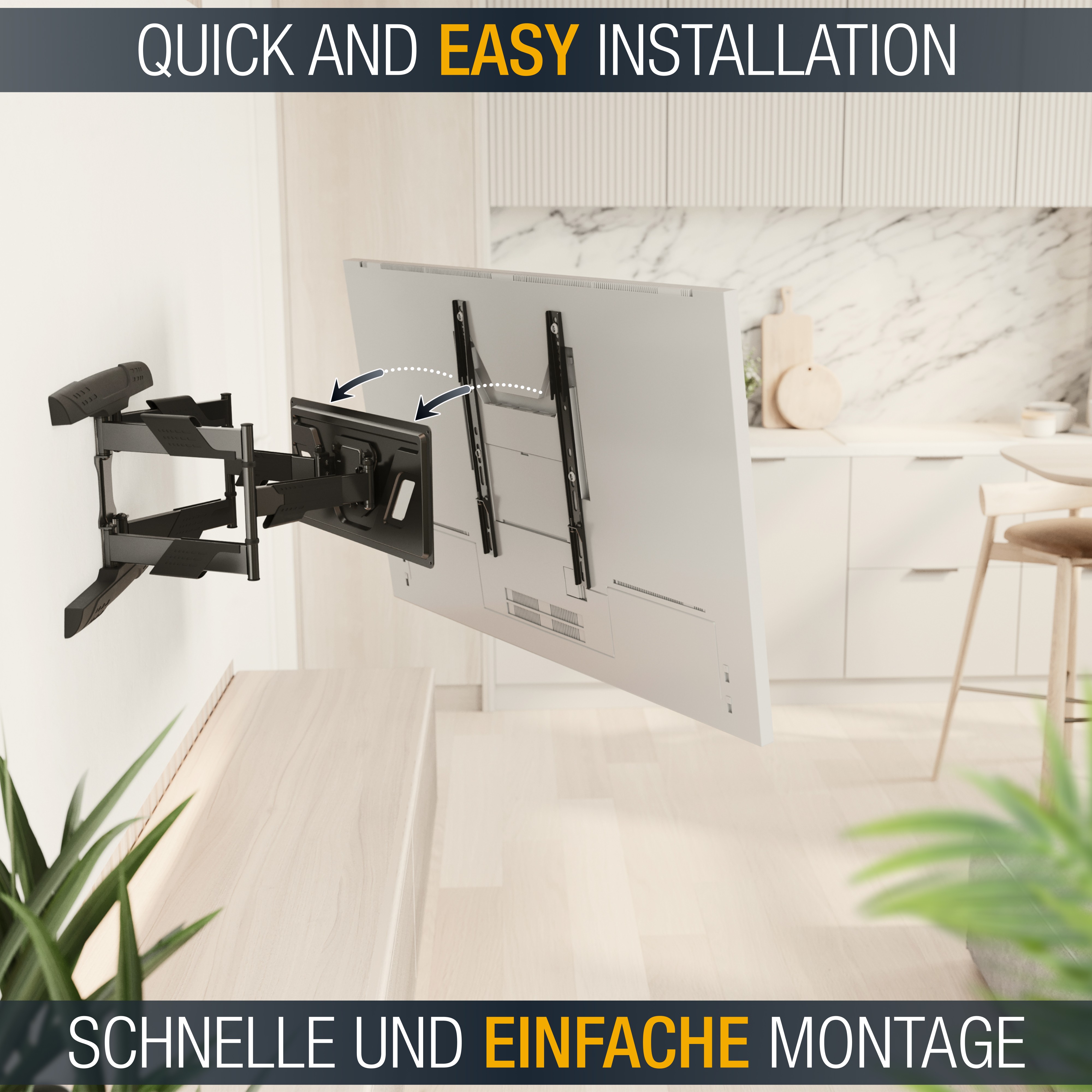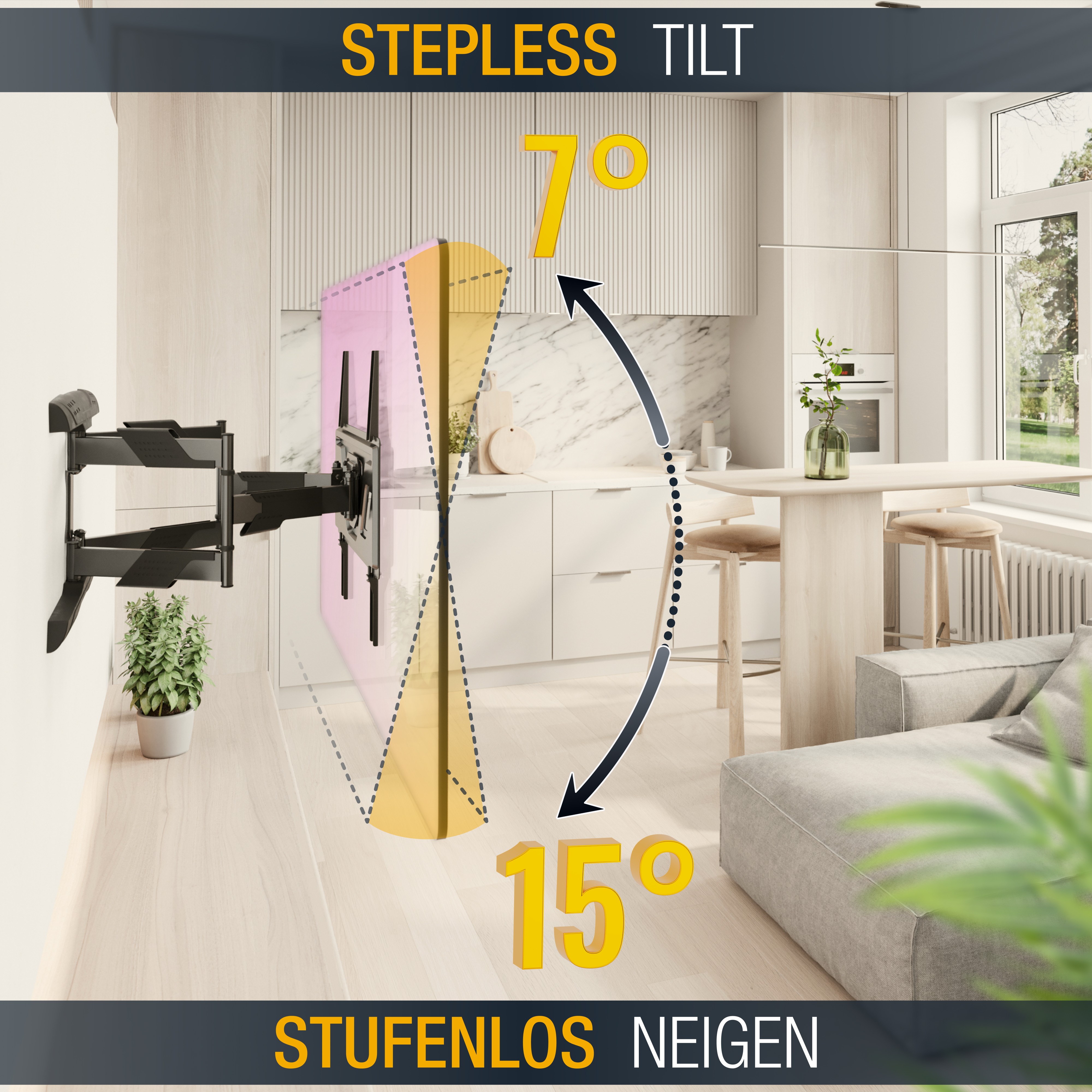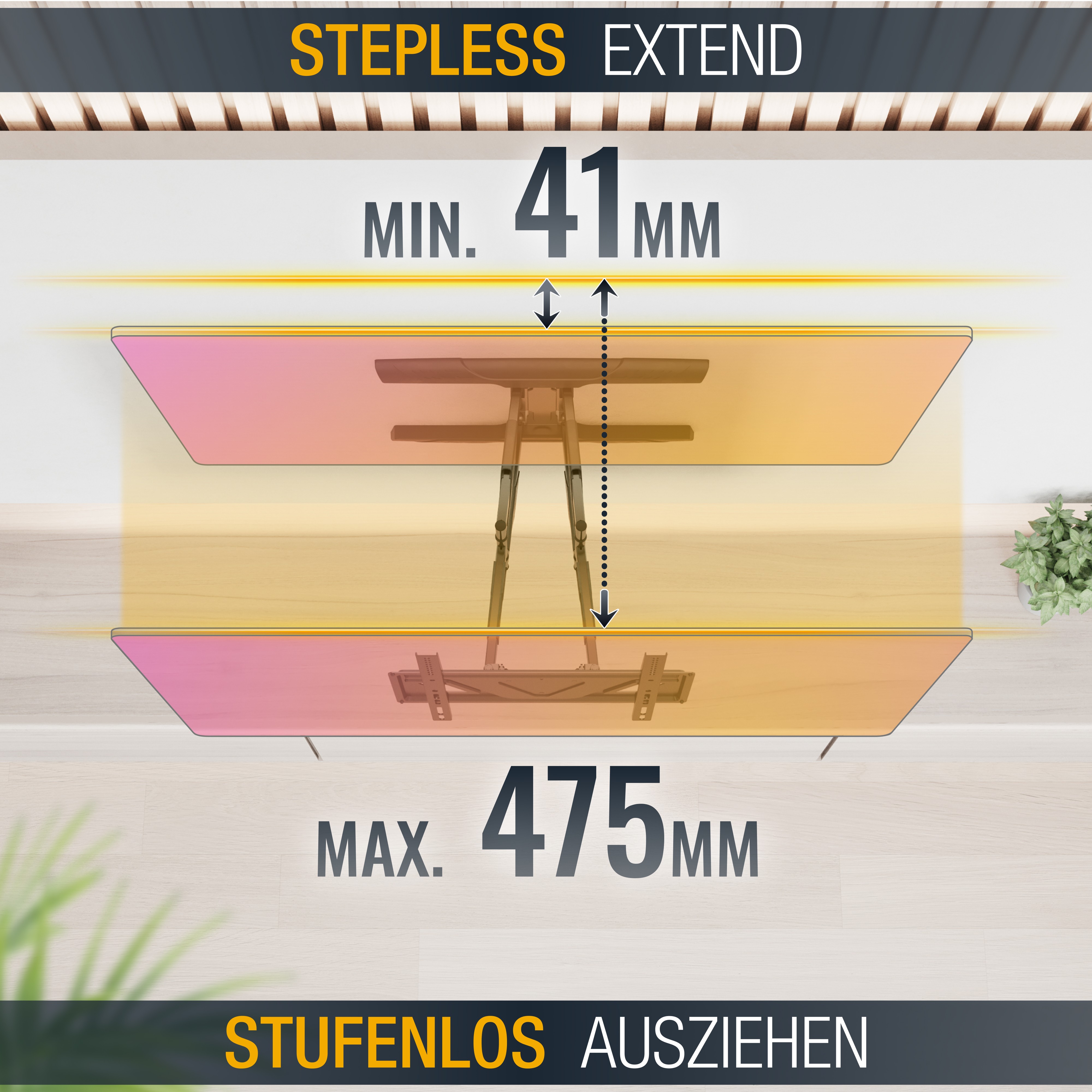 Klappen Sie Ihren TV oder Monitor bis auf 41mm nah an die Wand, winkeln Sie ihn oder ziehen Sie ihn bis auf 475mm in den Raum. Von „Wie ein Bild an der Wand“ bis zu „Nah am Mann“.