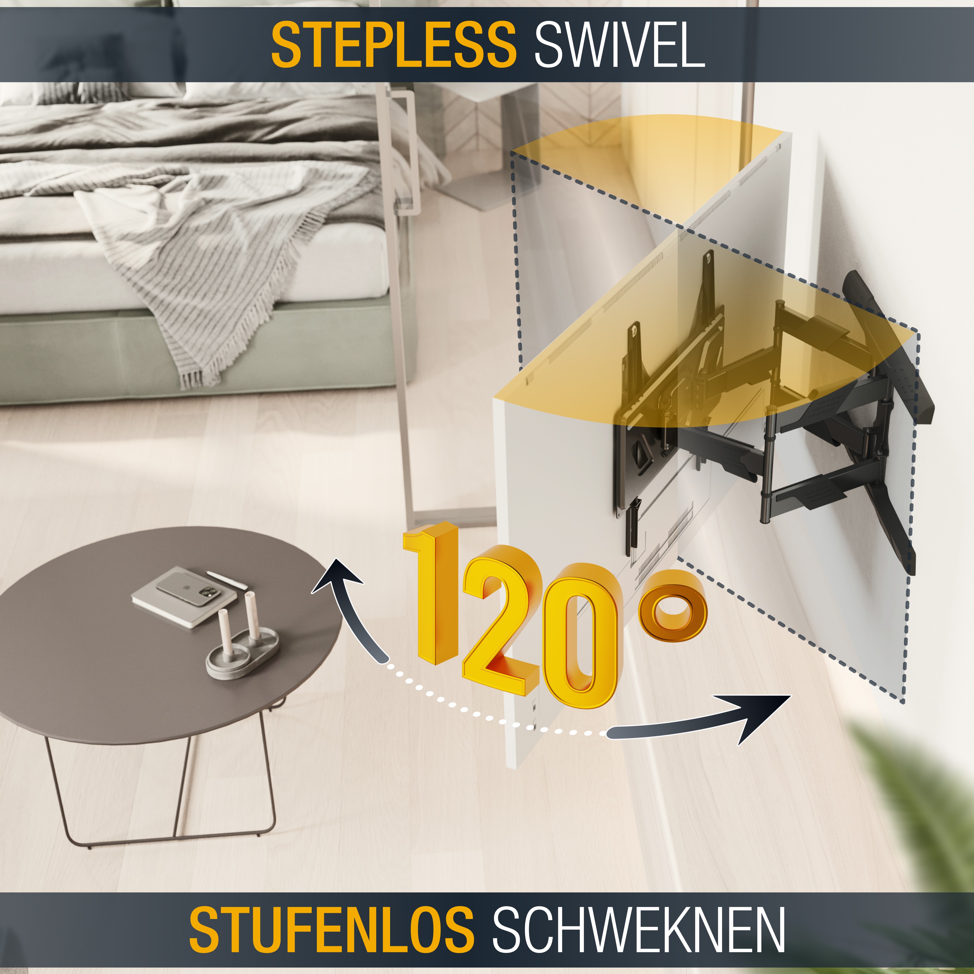 Vielseitige Schwenkbarkeit mittels einfacher Handgriffe bis zu 120° in horizontaler Richtung, - je nach Bildschirm-Breite, Bereichsmontage und Möbelaufbau. Die Leichtgängigkeit stellen Sie optional an den Gelenken ein.
