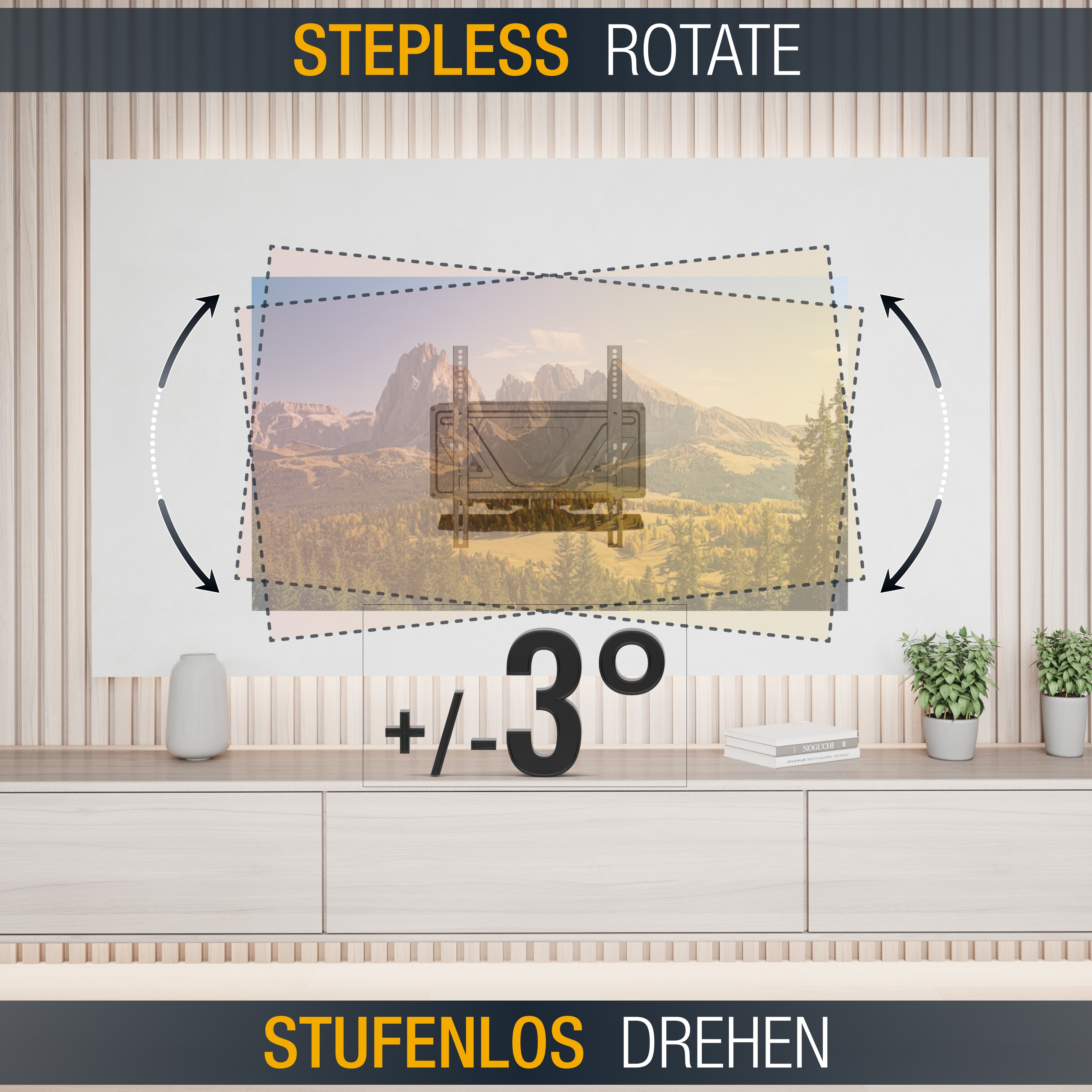 Mit der optionalen +/-3° Drehbarkeits-Einstellung im & gegen den Uhrzeigersinn korrigieren Sie im Feinschliff die geradlinige Bildschirm-Ausrichtung nach der Montage. Für ein entspanntes Aufatmen nach der Montage.