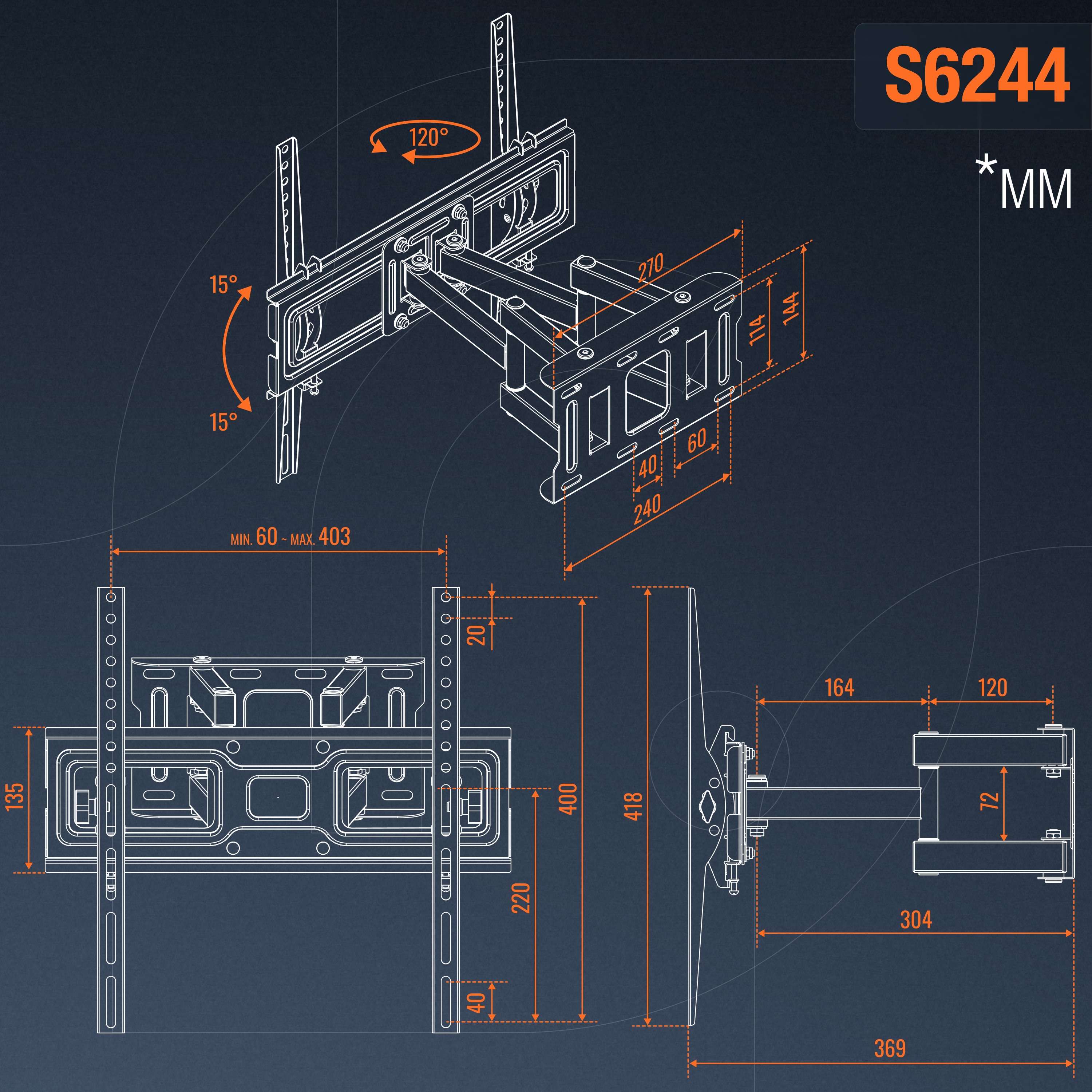 VESA unterstützt diese Fernseh-Wandhalterung bis 400x400mm. Ihre Wandplatten-Bohrungen unterscheiden sich ebenfalls zu ihren ähnlichen Modellen wie die der S6144, S2544, S5144, S1544, S1144, neben weiteren Details.