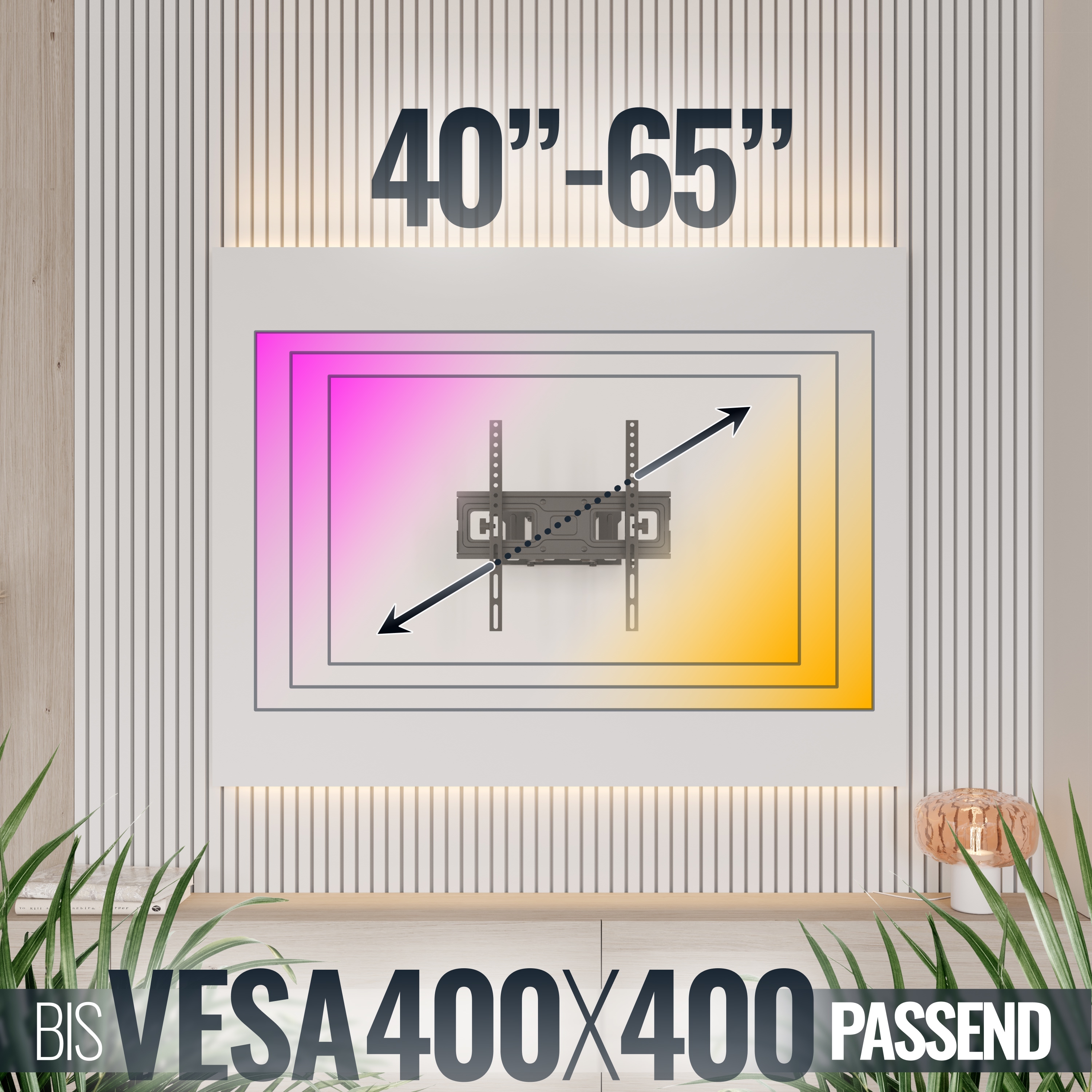- Geeignet für TV-Geräte, PC-Monitore mit Bildschirmdiagonale ca.100-140cm (40"-65"). Bitte die Lochabstände nachmessen! (Auch für größere Geräte passend. Einfach die Befestigungslöcher nachmessen)