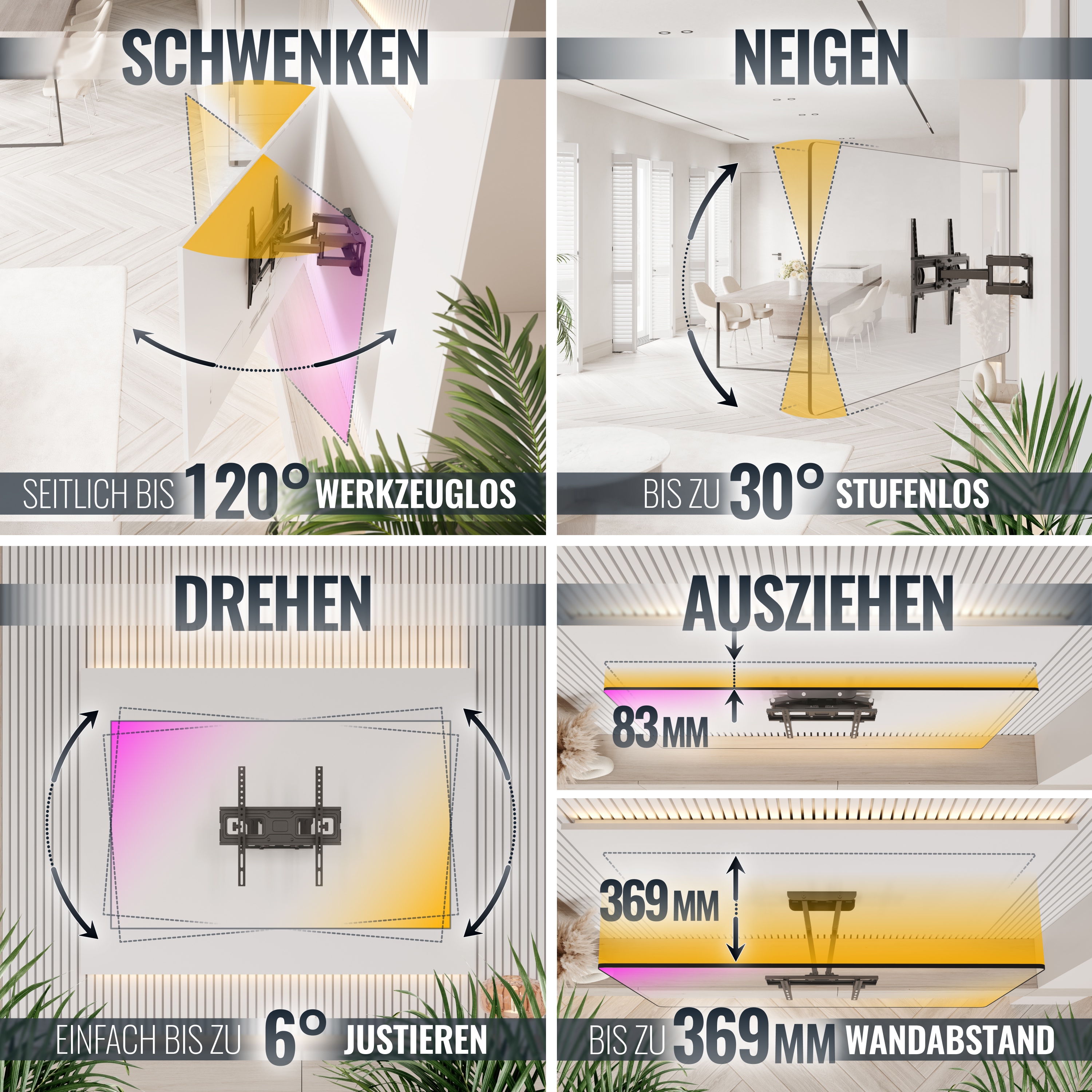 - Wandabstand: Wand <-> TV-Rückseite: min. 83mm - max. 365mm