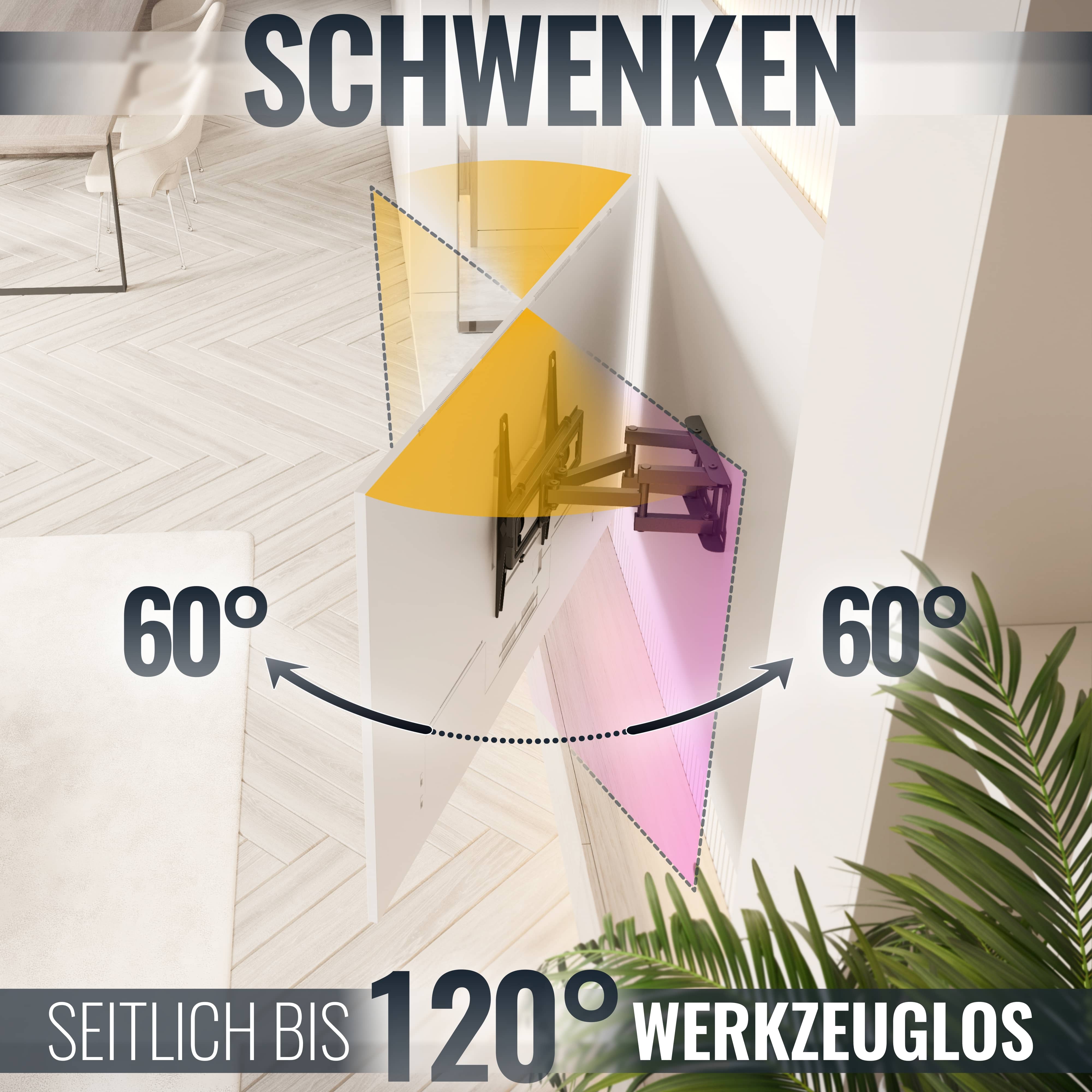 • Schwenkung: 120° (bei TVs mit max. 50cm Breite)