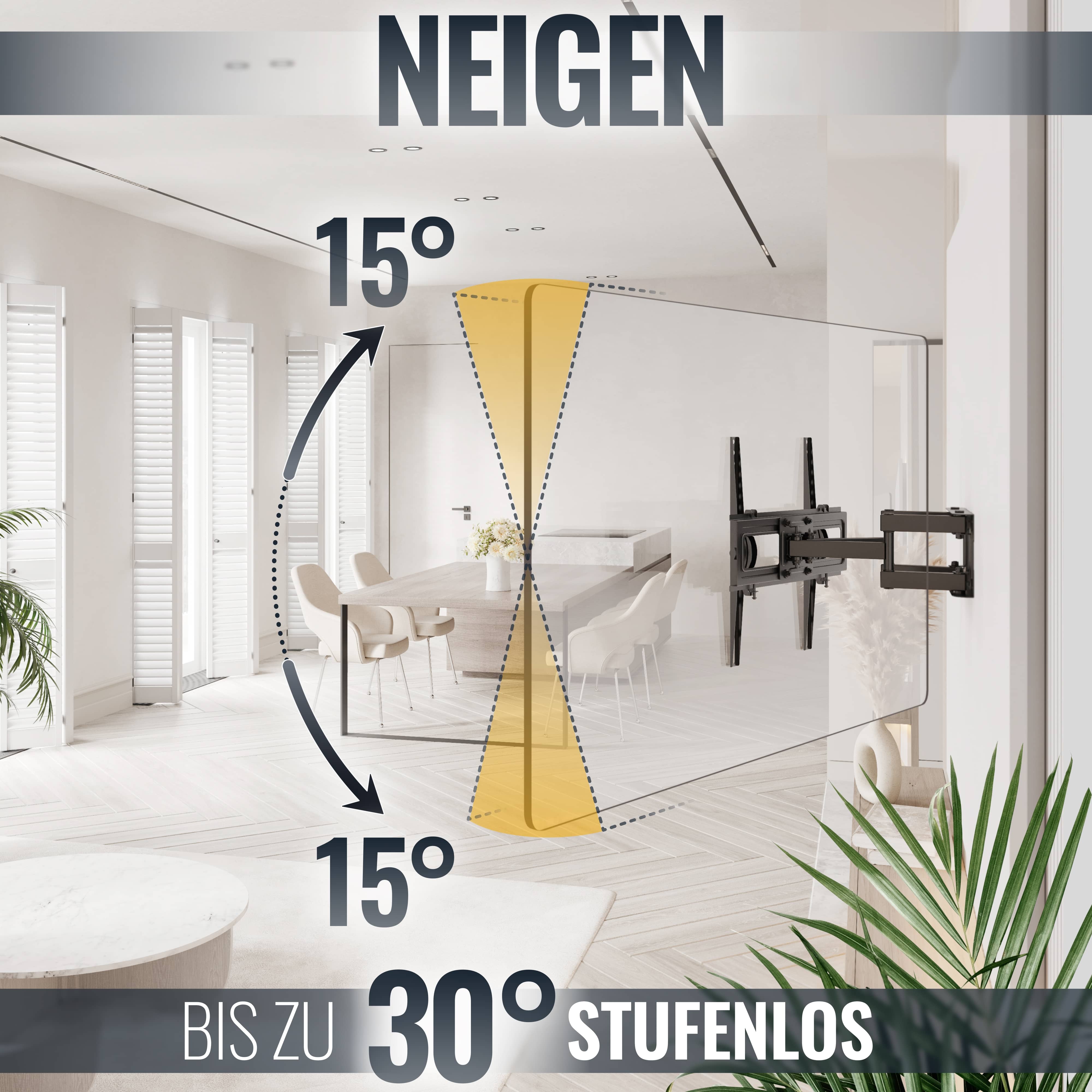 Somit können Sie bei passender Raumaufstellung einen Abend am Tisch fernsehen und an einem anderen von der Couch aus. Mit zusätzlich variablen Wandabstand zwischen 83mm bis auf flexible 369mm erweitern Sie diesen Spielraum der Raumausrichtung.