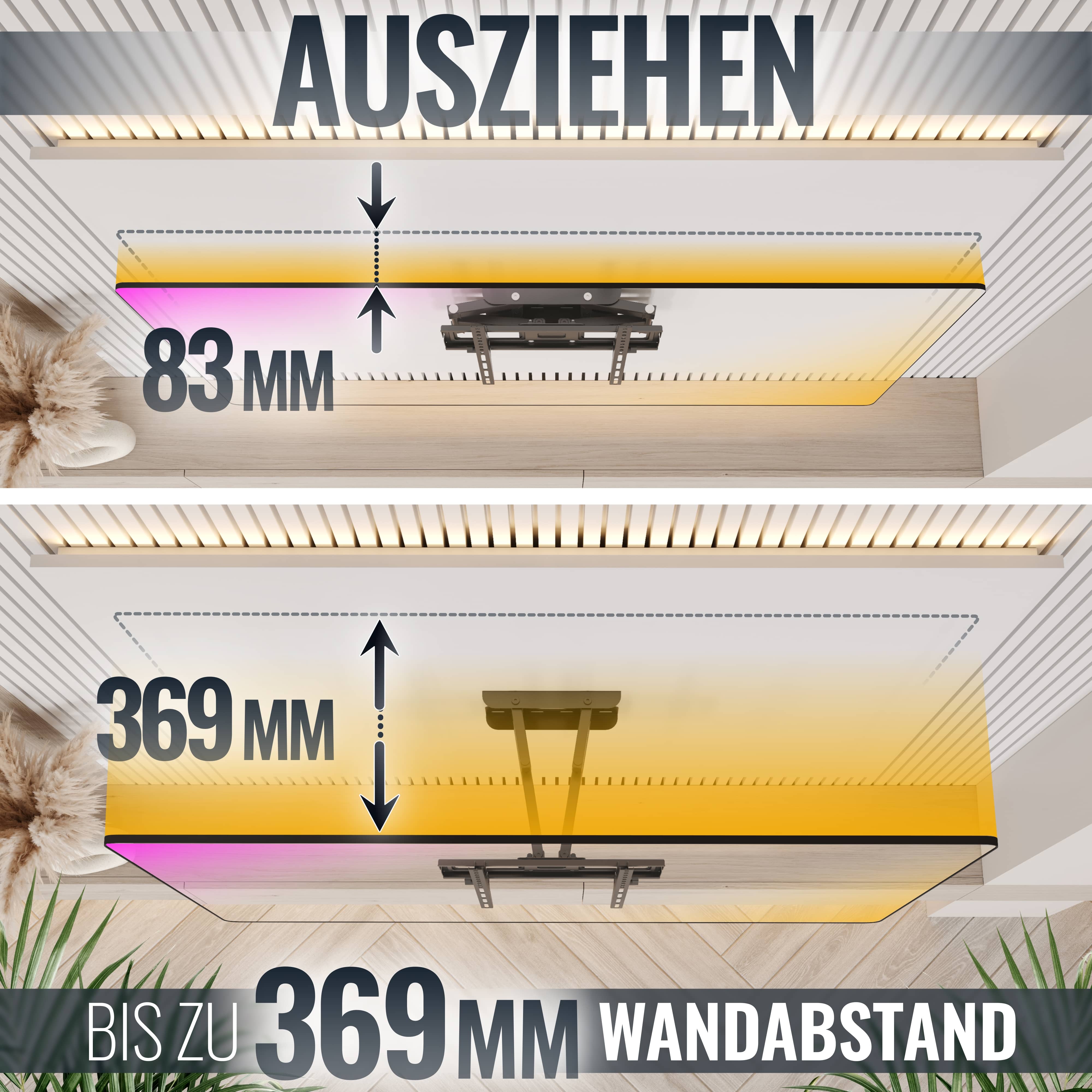 • Wandabstand: Wand <-> TV-Rückseite: min. 85mm - max. 369mm
